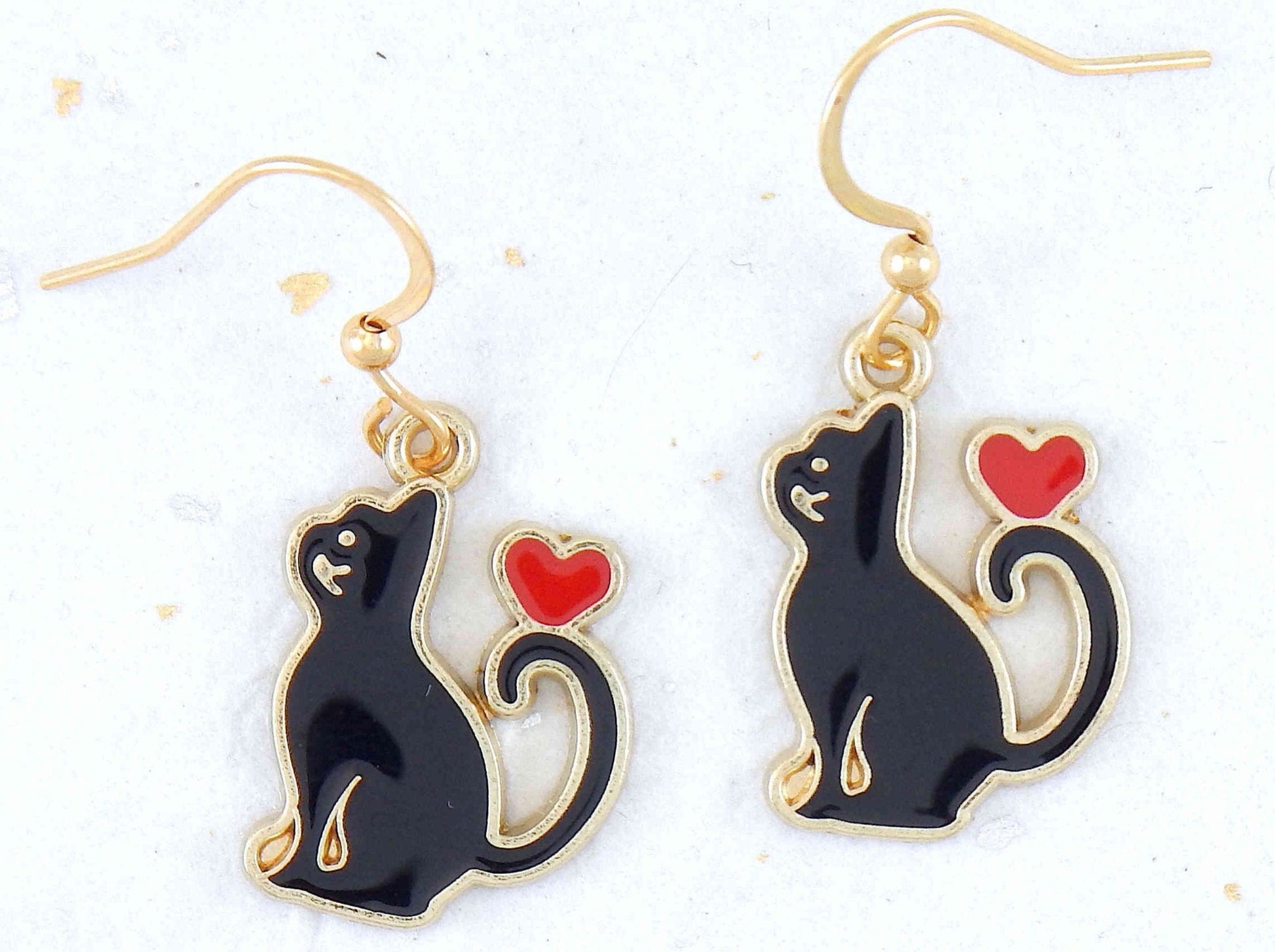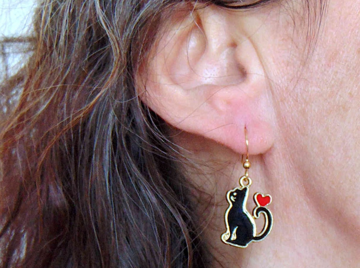 Short earrings "Cat Love" with enamelled black cats and red hearts, gold-toned stainless steel hooks
