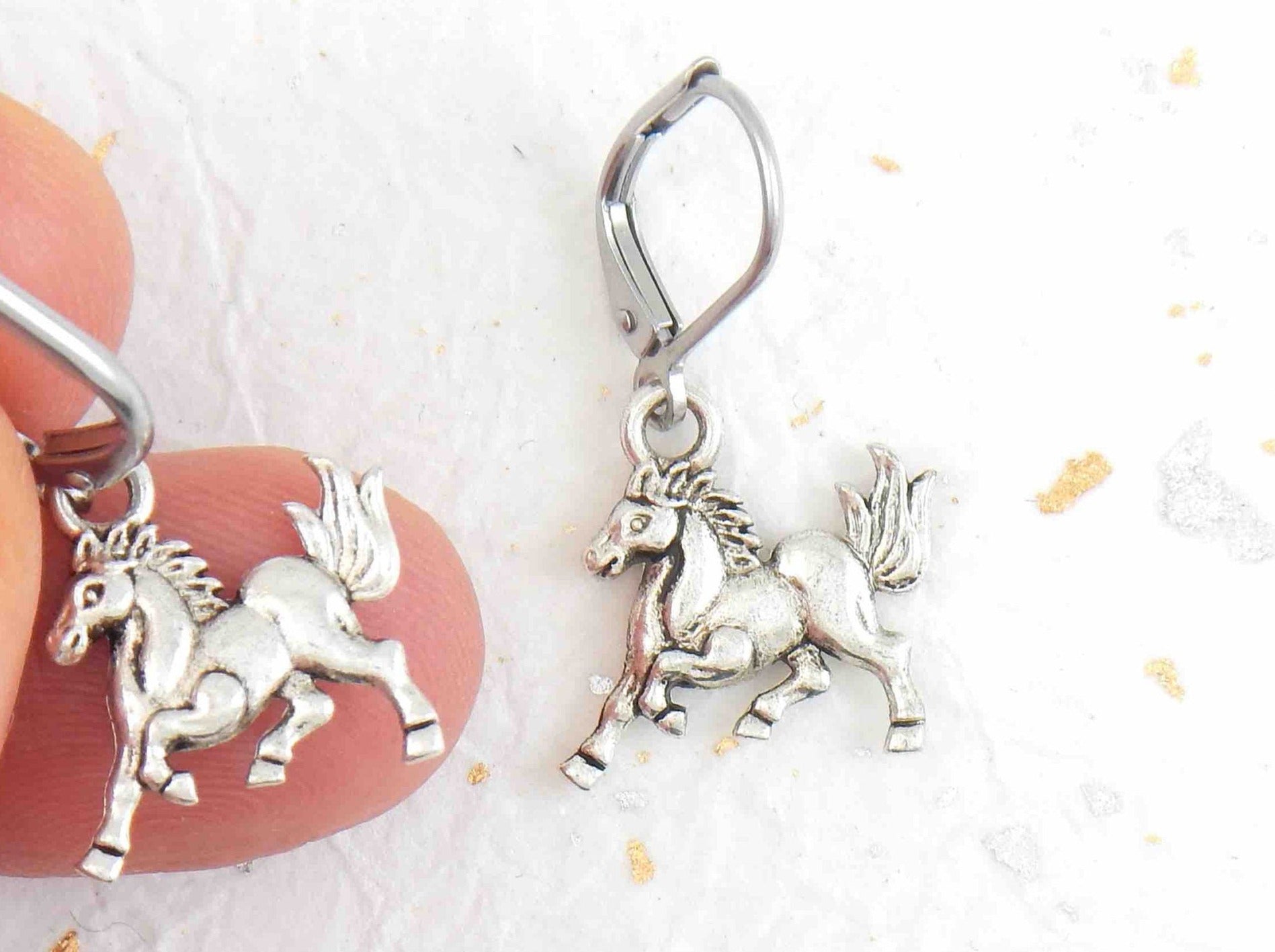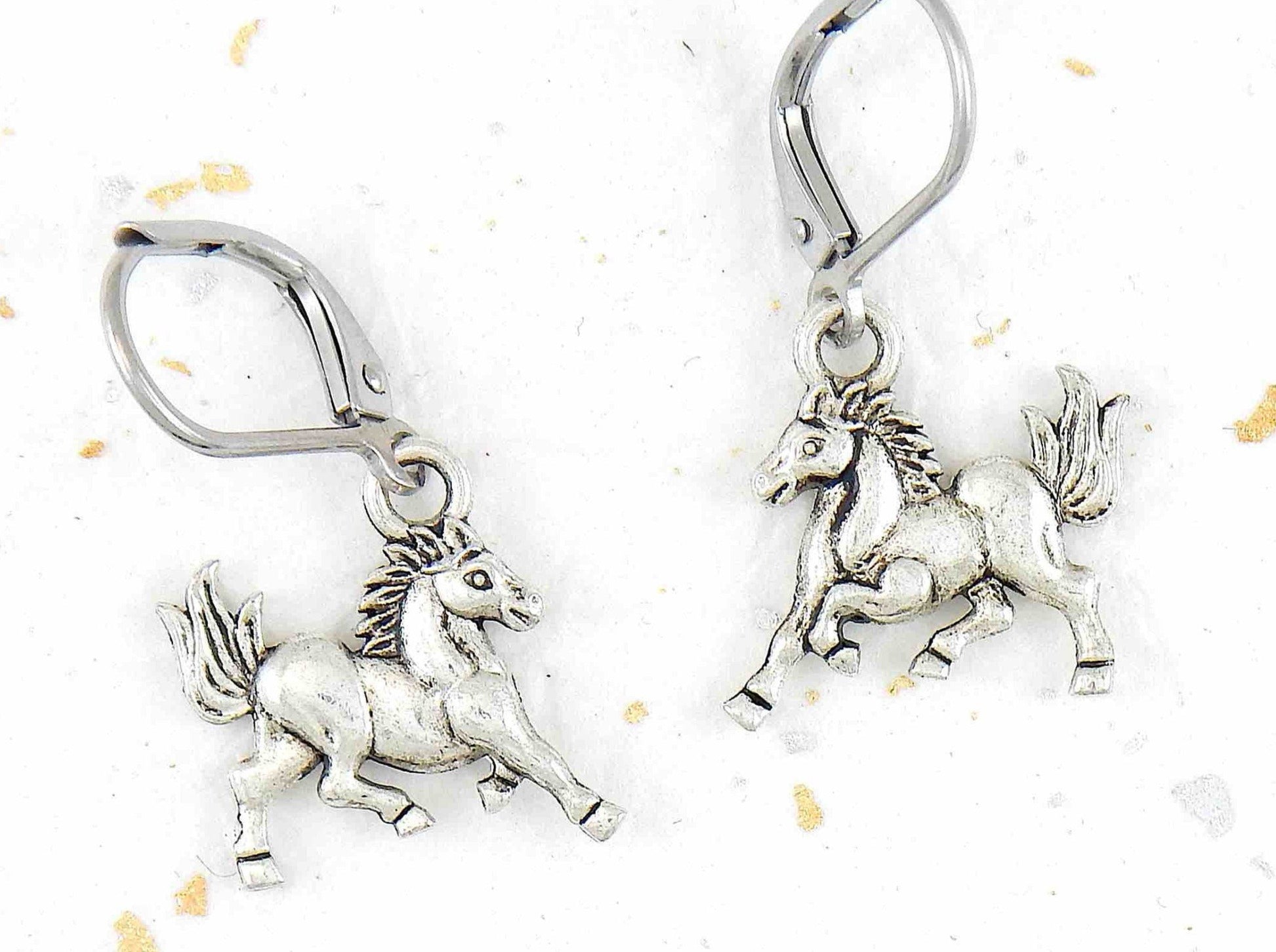 Short earrings with galloping horses, stainless steel lever back hooks