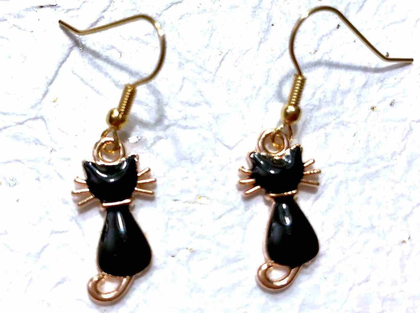 Short earrings with small shiny enamelled black cats, gold-toned stainless steel hooks