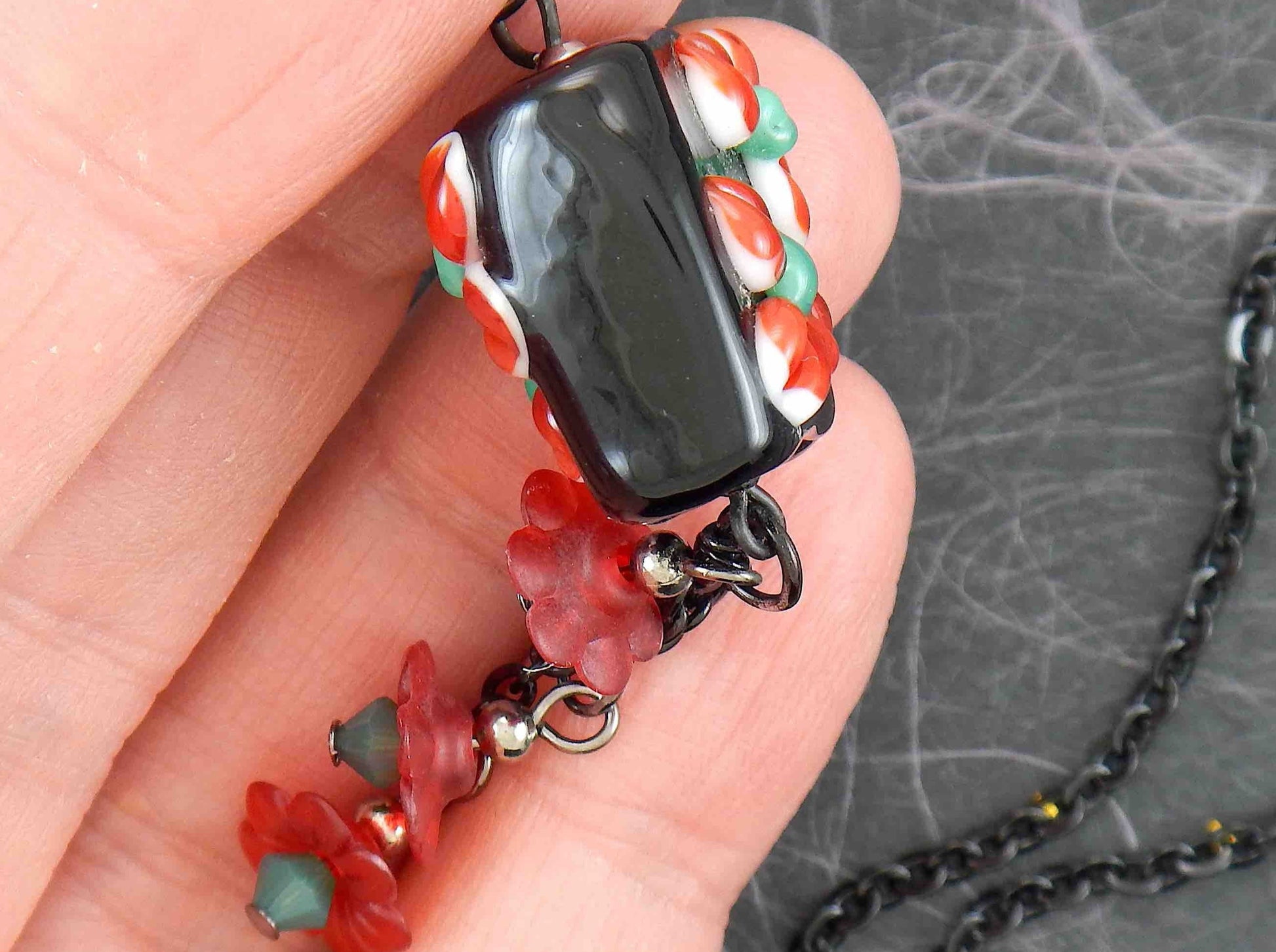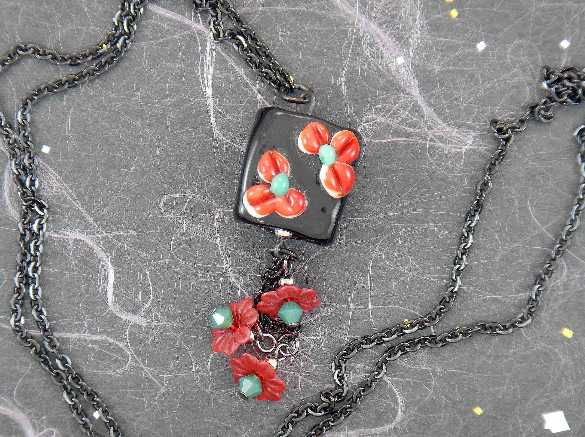 Collier 24 po carré noir en verre de Murano, fleurs rouge-vert en relief, pendants fleurs de lucite rouge vintage et cristaux Swarovski verts, chaîne acier inoxydable noir
