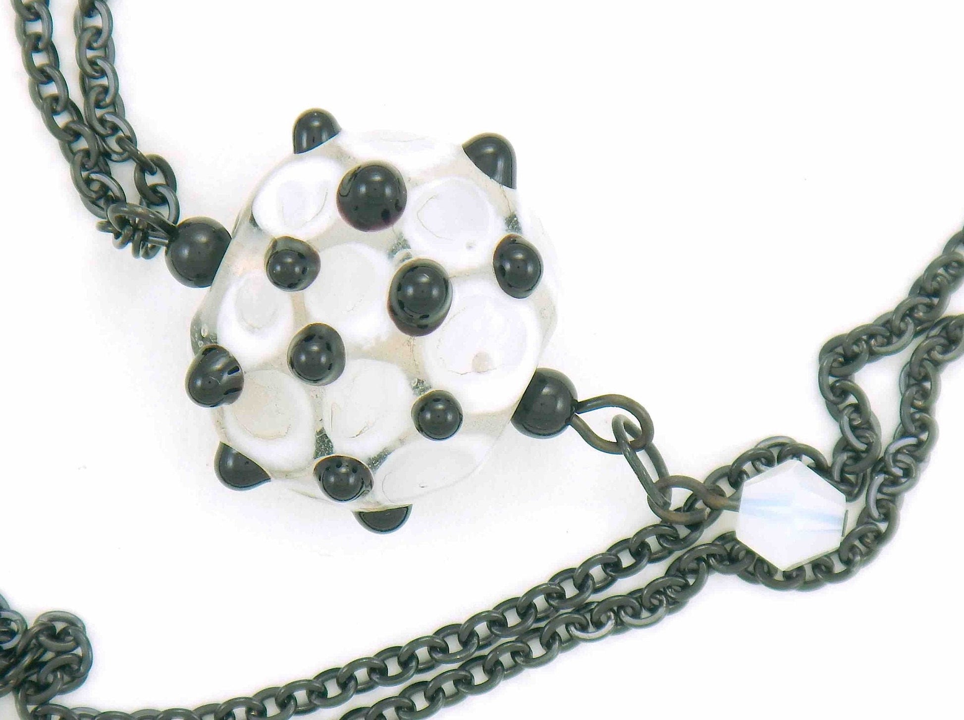 Collier 29 po pastille de verre de Murano transparente, pois blancs à plat et pois noirs en relief, chaîne acier inoxydable noir