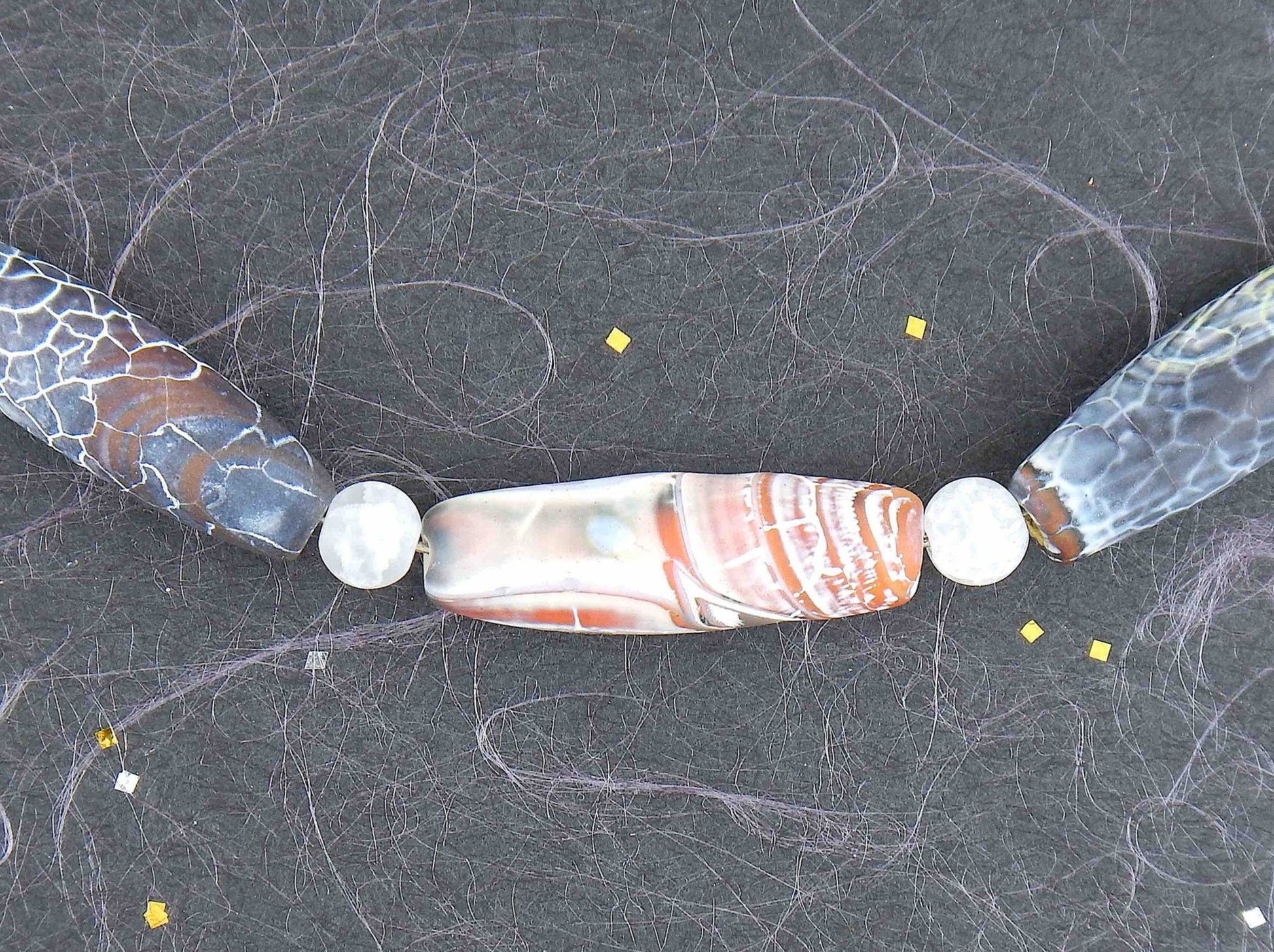 Collier tour de cou avec 3 billes d'agate craquée au feu, tons de noir-caramel-blanc, fermoir acier inoxydable