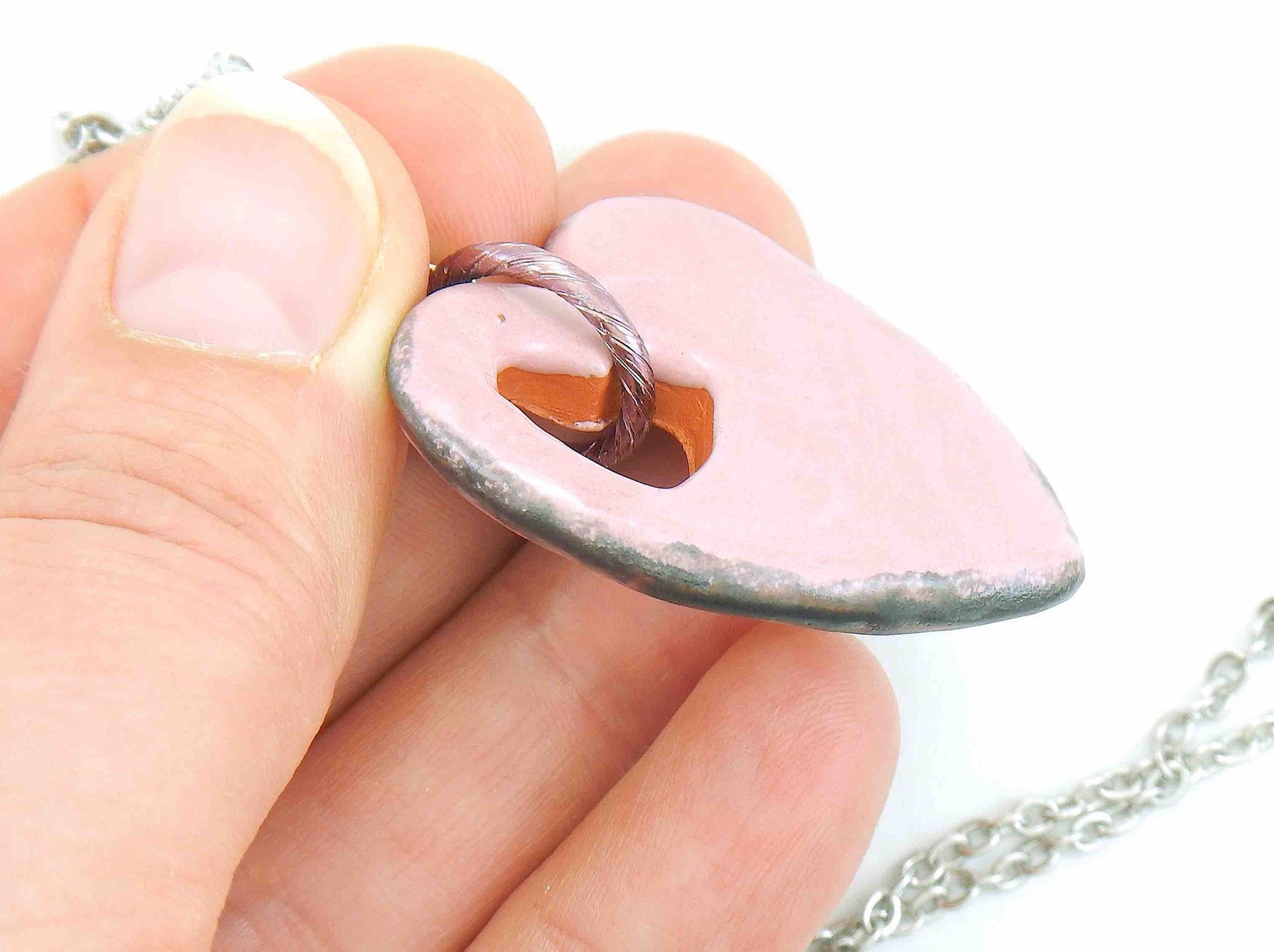 Collier 17 po à pendentif coeur de faïence rose bonbon fait à la main à Montréal, chaîne acier inoxydable