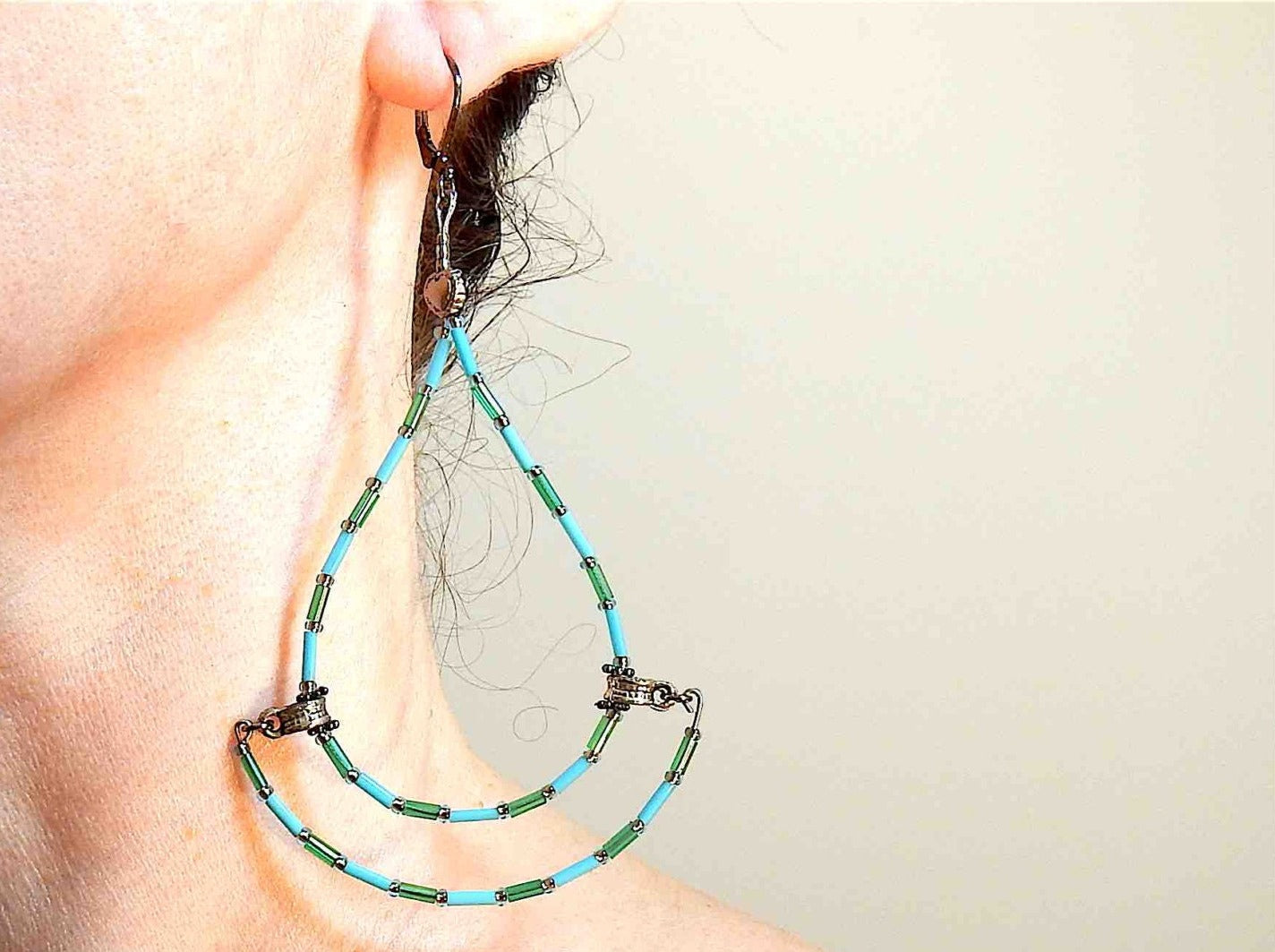 Boucles d'oreilles longues designer à arceaux turquoise-vert, crochets à levier laiton
