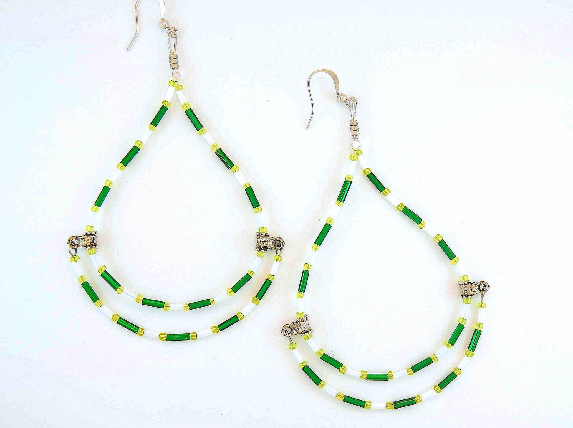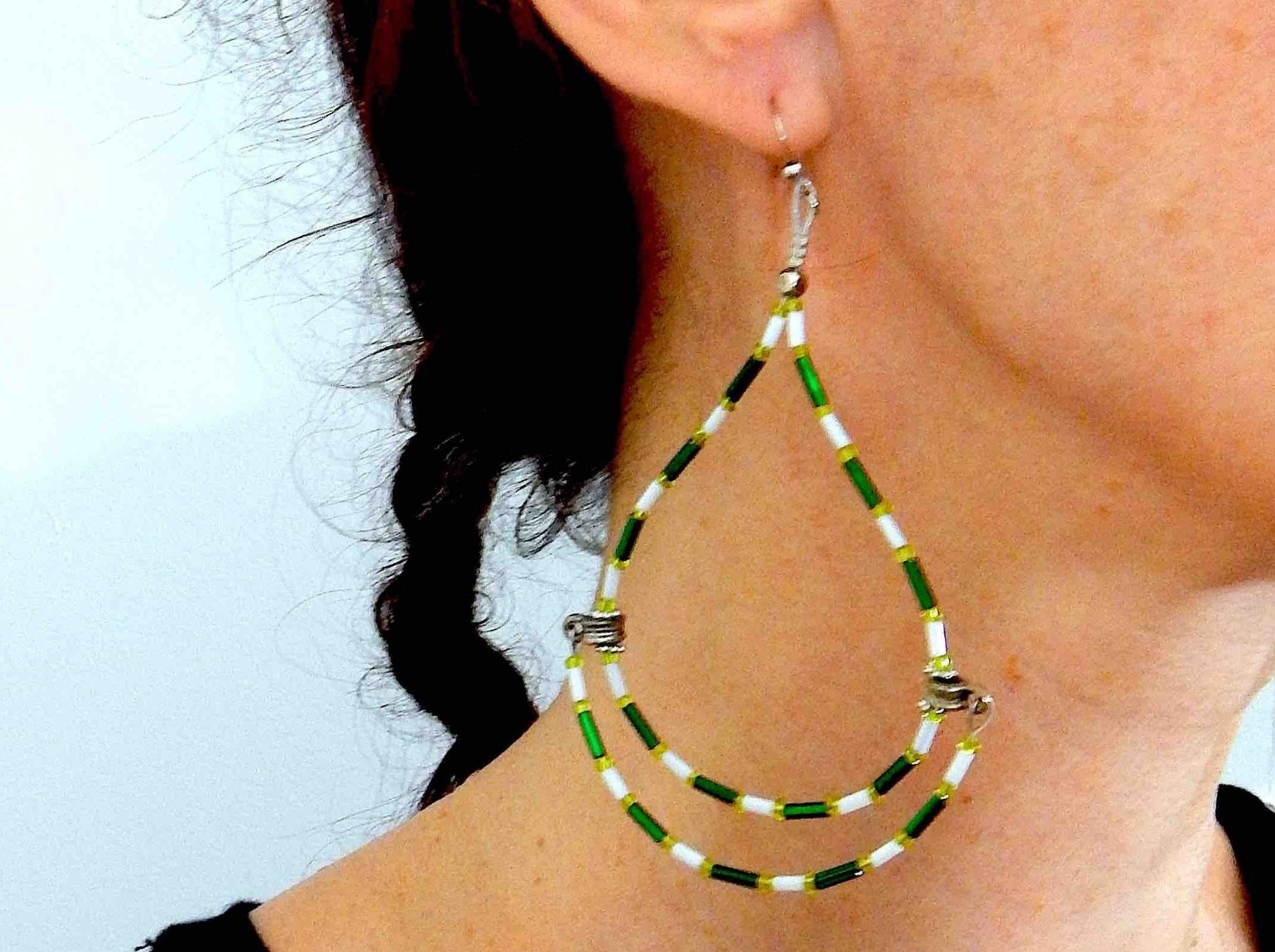 Boucles d'oreilles longues designer à arceaux blanc-vert, crochets métal