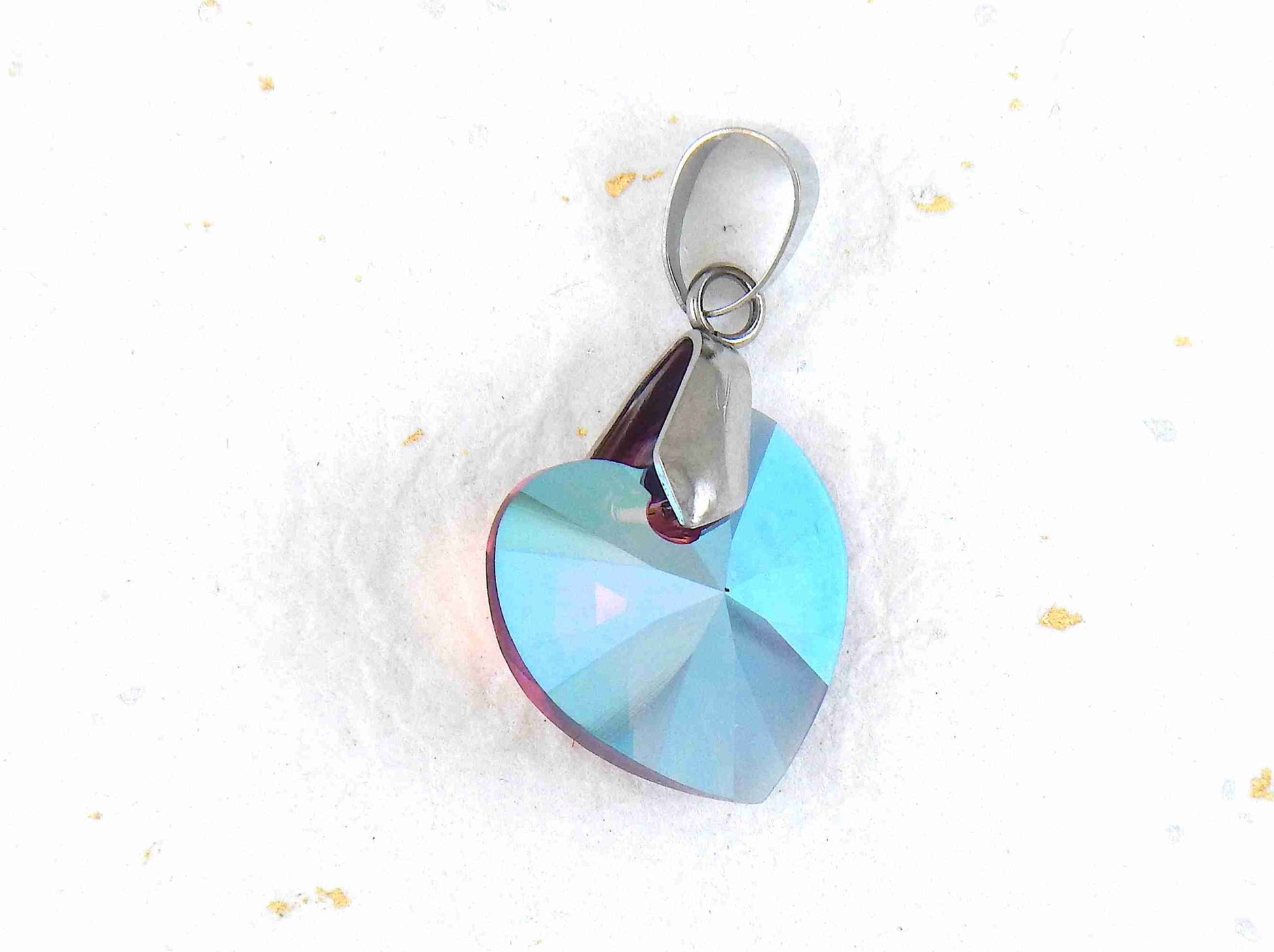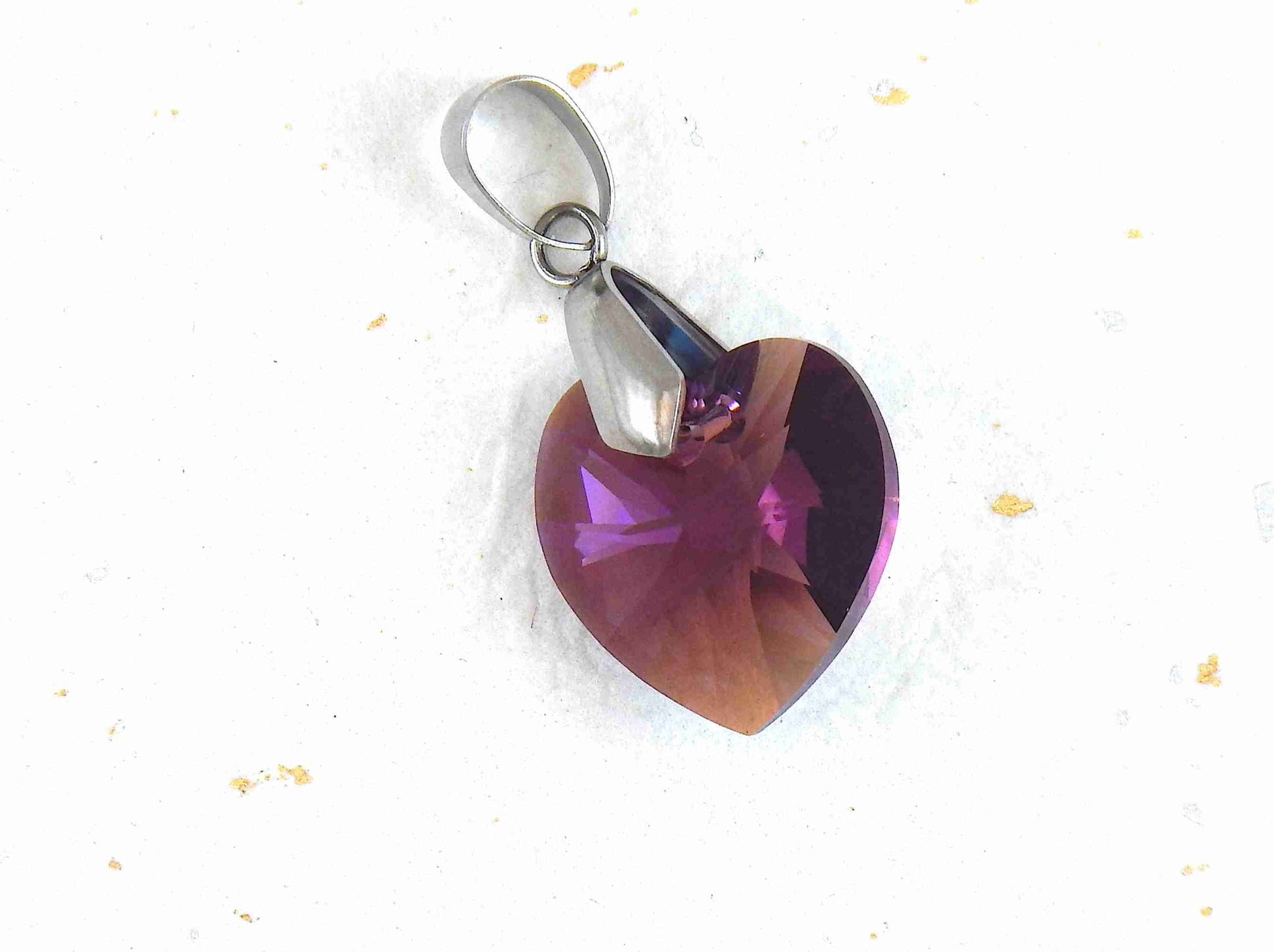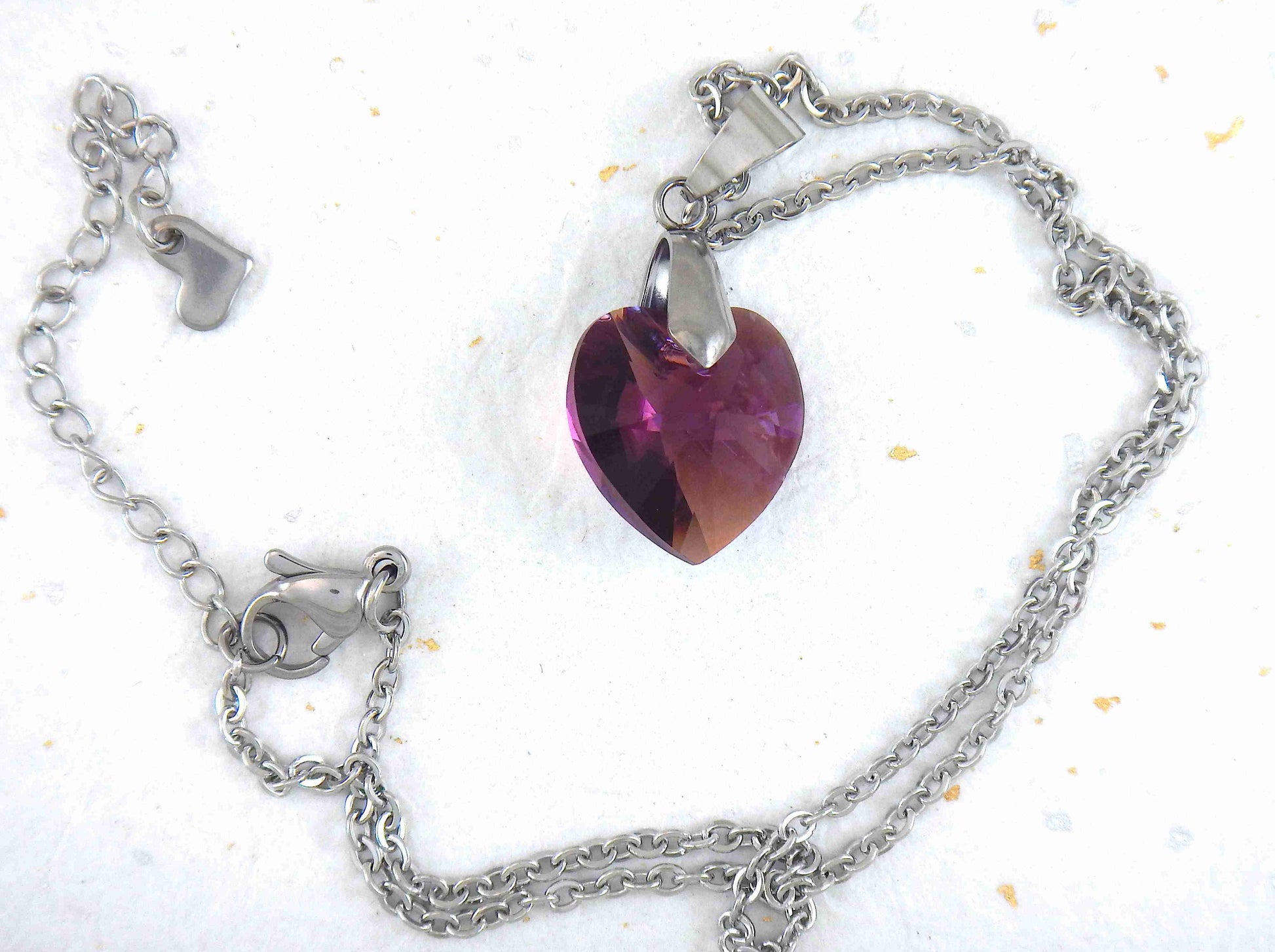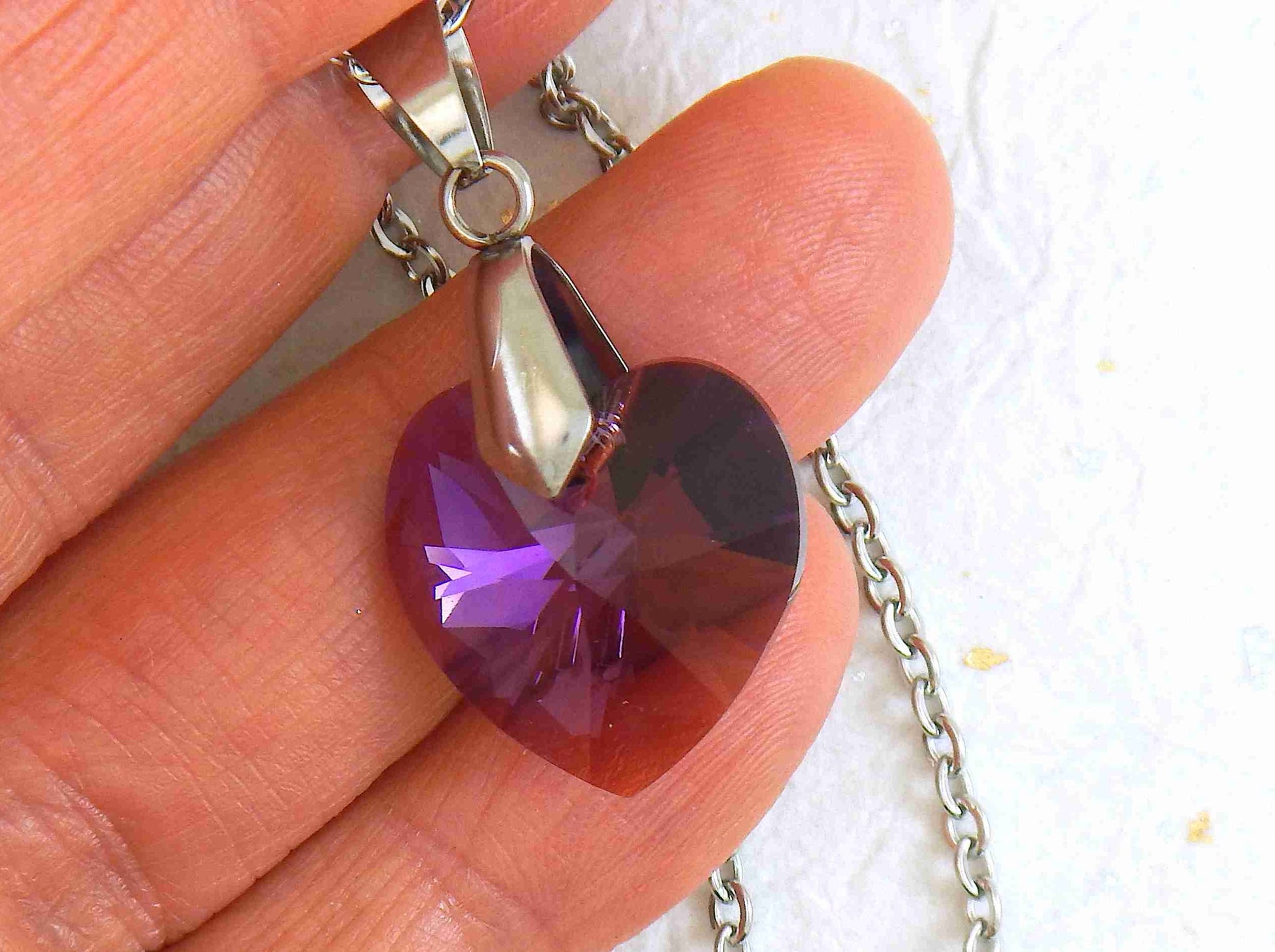 14/16-inch necklace with 18mm Amethyst Shimmer faceted Swarovski crystal heart pendant, stainless steel chain