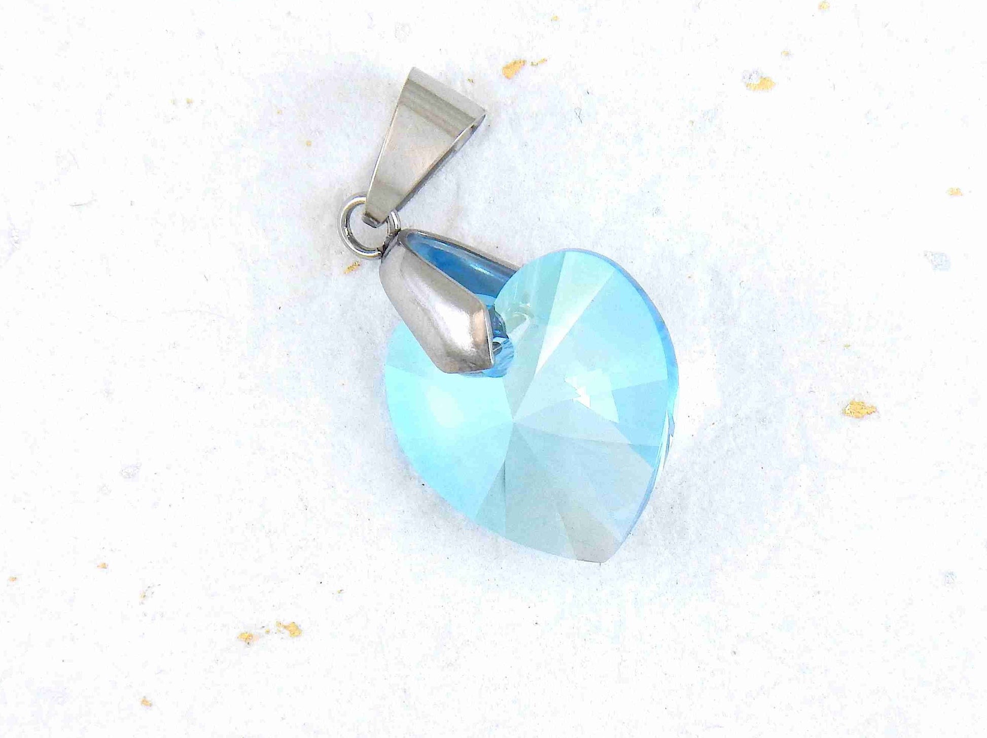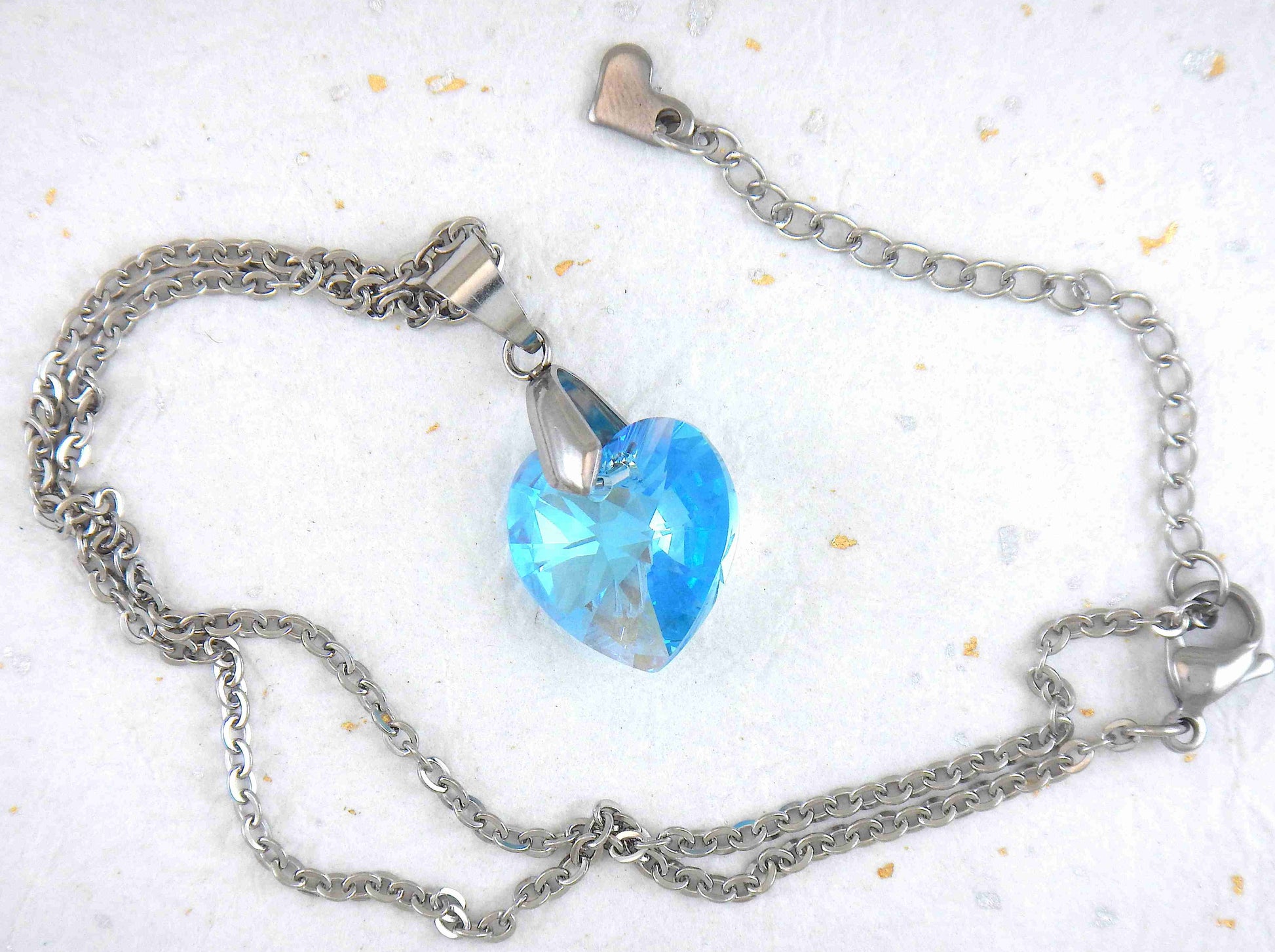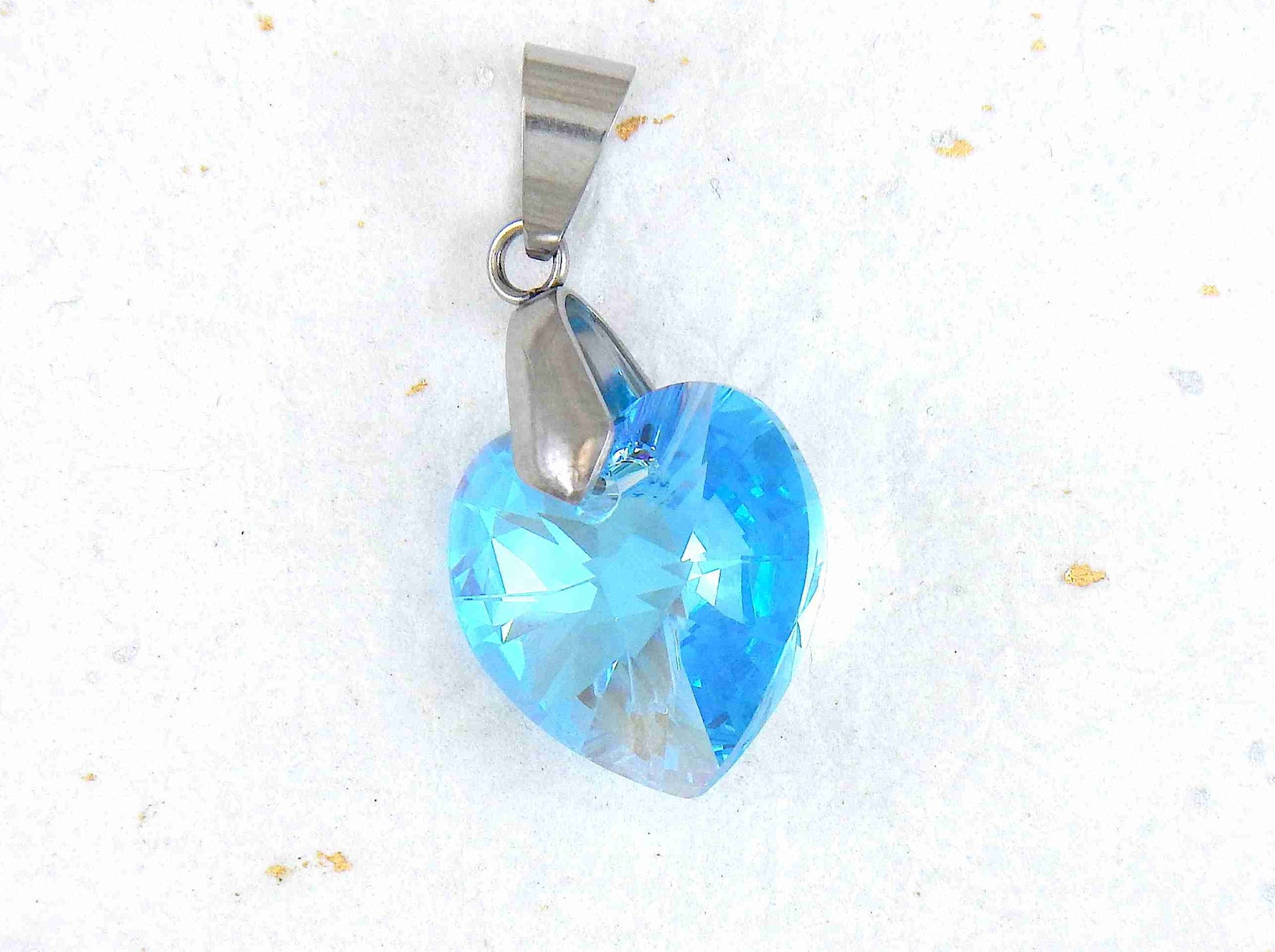 14/16-inch necklace with 18mm Aquamarine Shimmer faceted Swarovski crystal heart pendant, stainless steel chain
