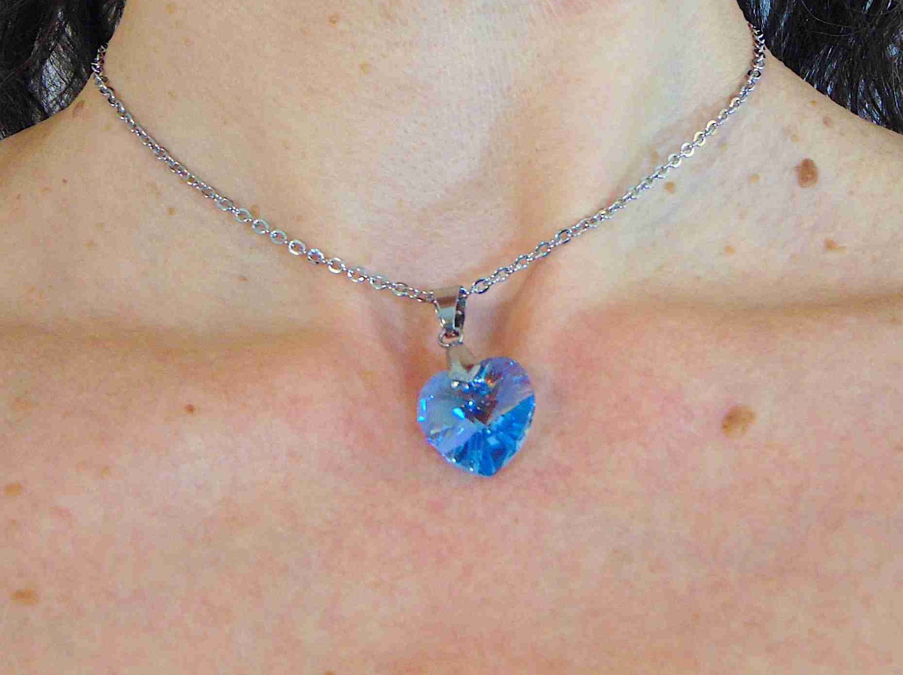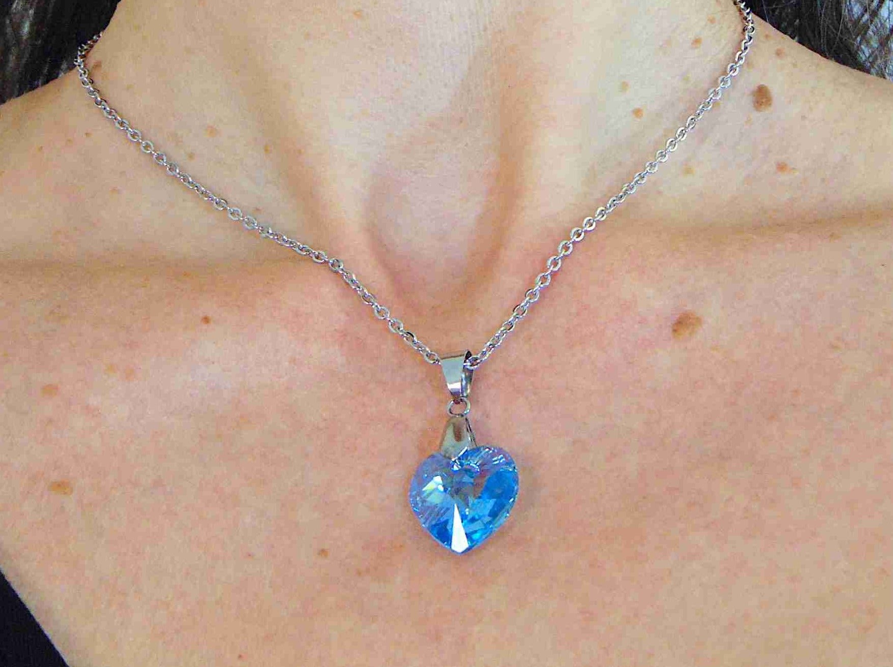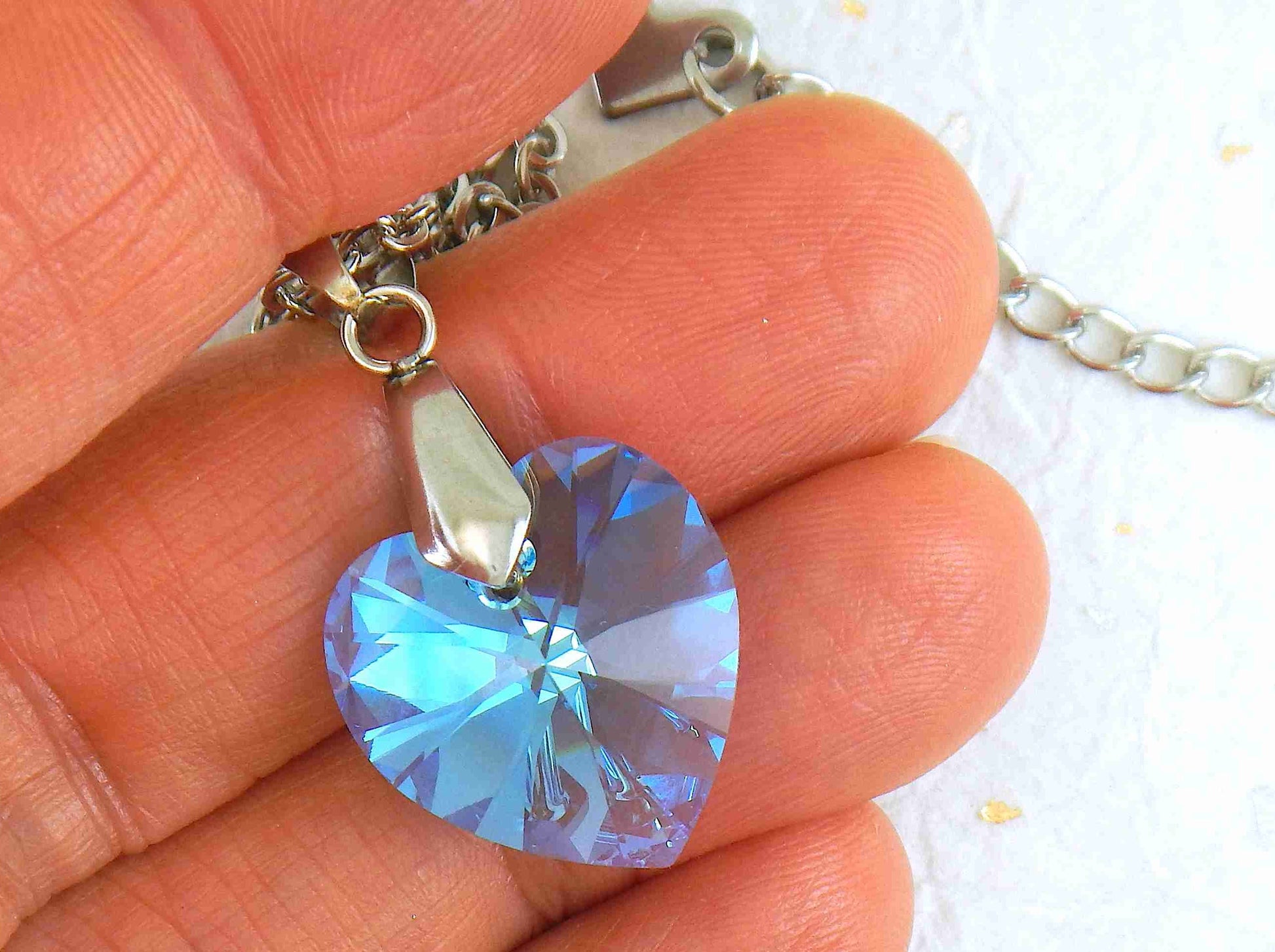 14/16-inch necklace with 18mm Aquamarine Shimmer faceted Swarovski crystal heart pendant, stainless steel chain