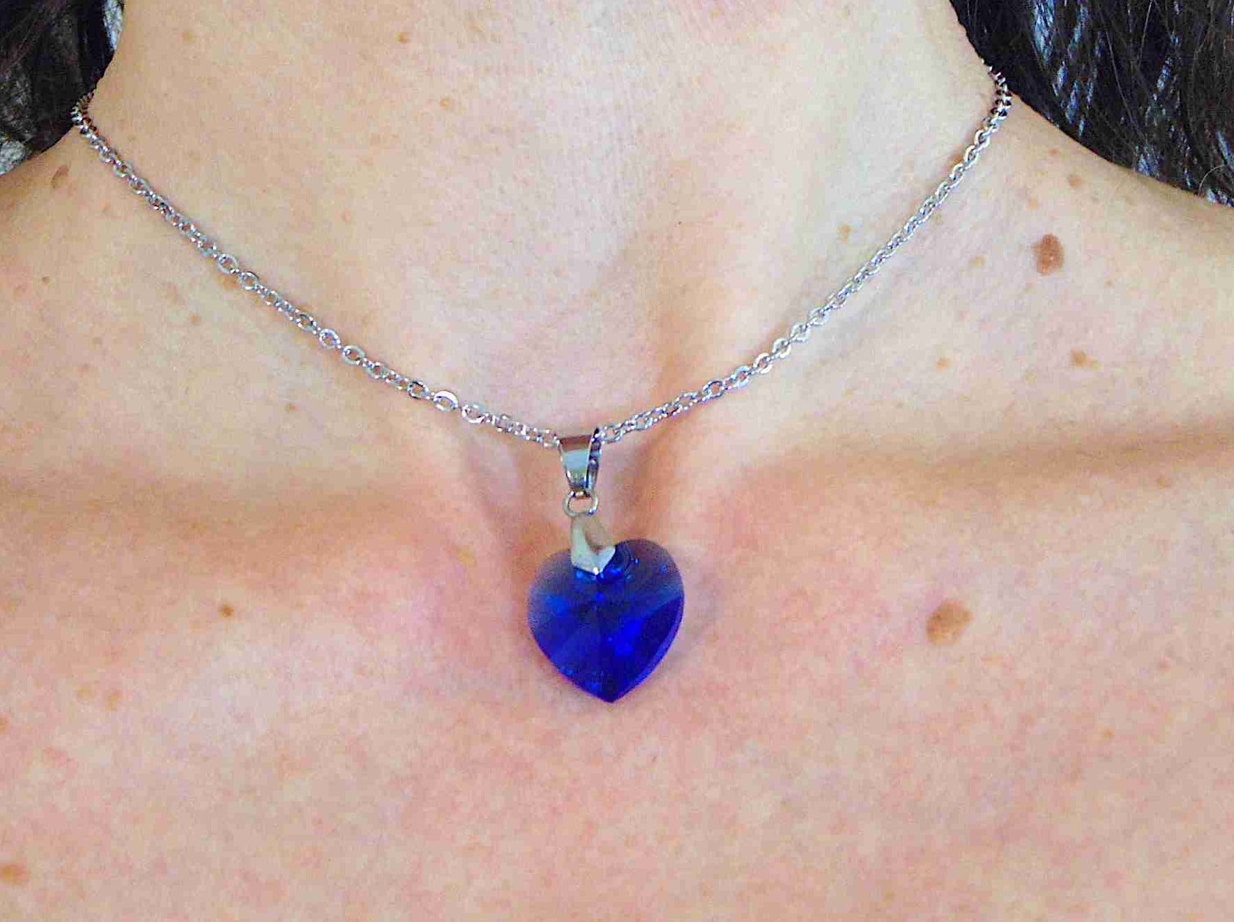 14/16-inch necklace with 18mm Majestic Blue faceted Swarovski crystal heart pendant, stainless steel chain