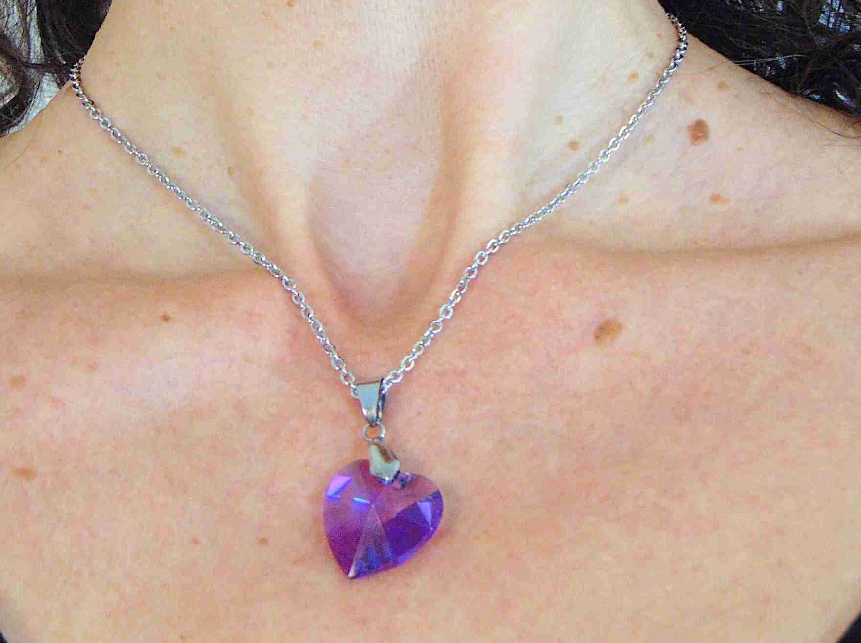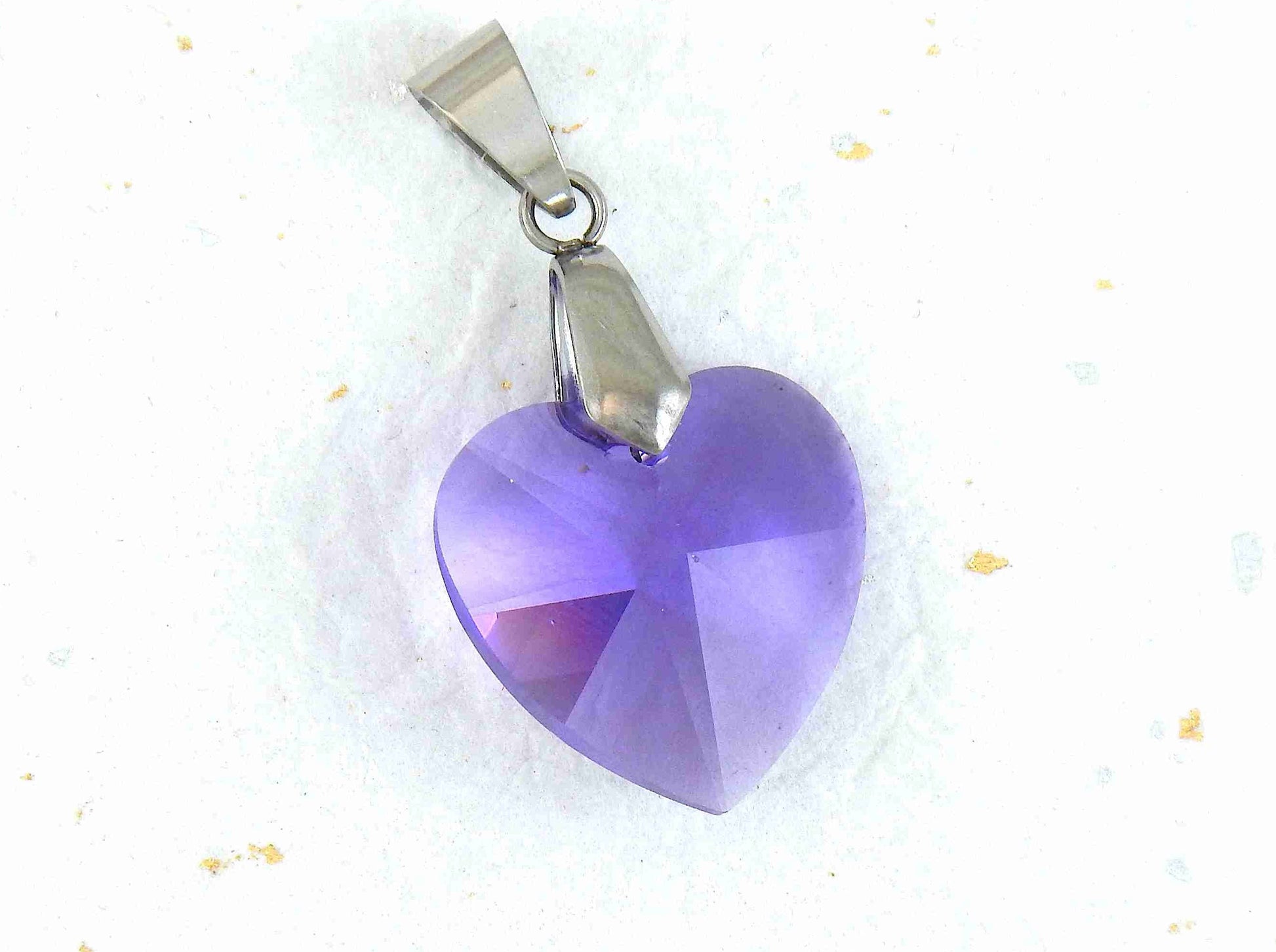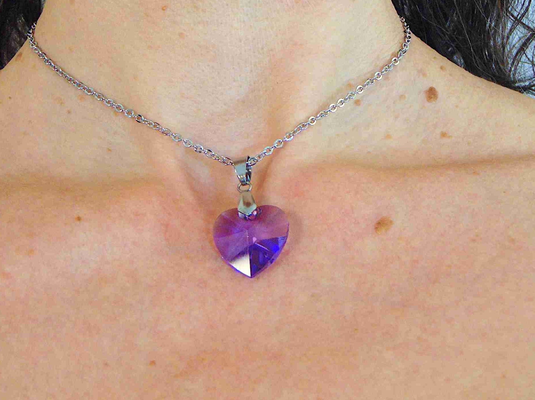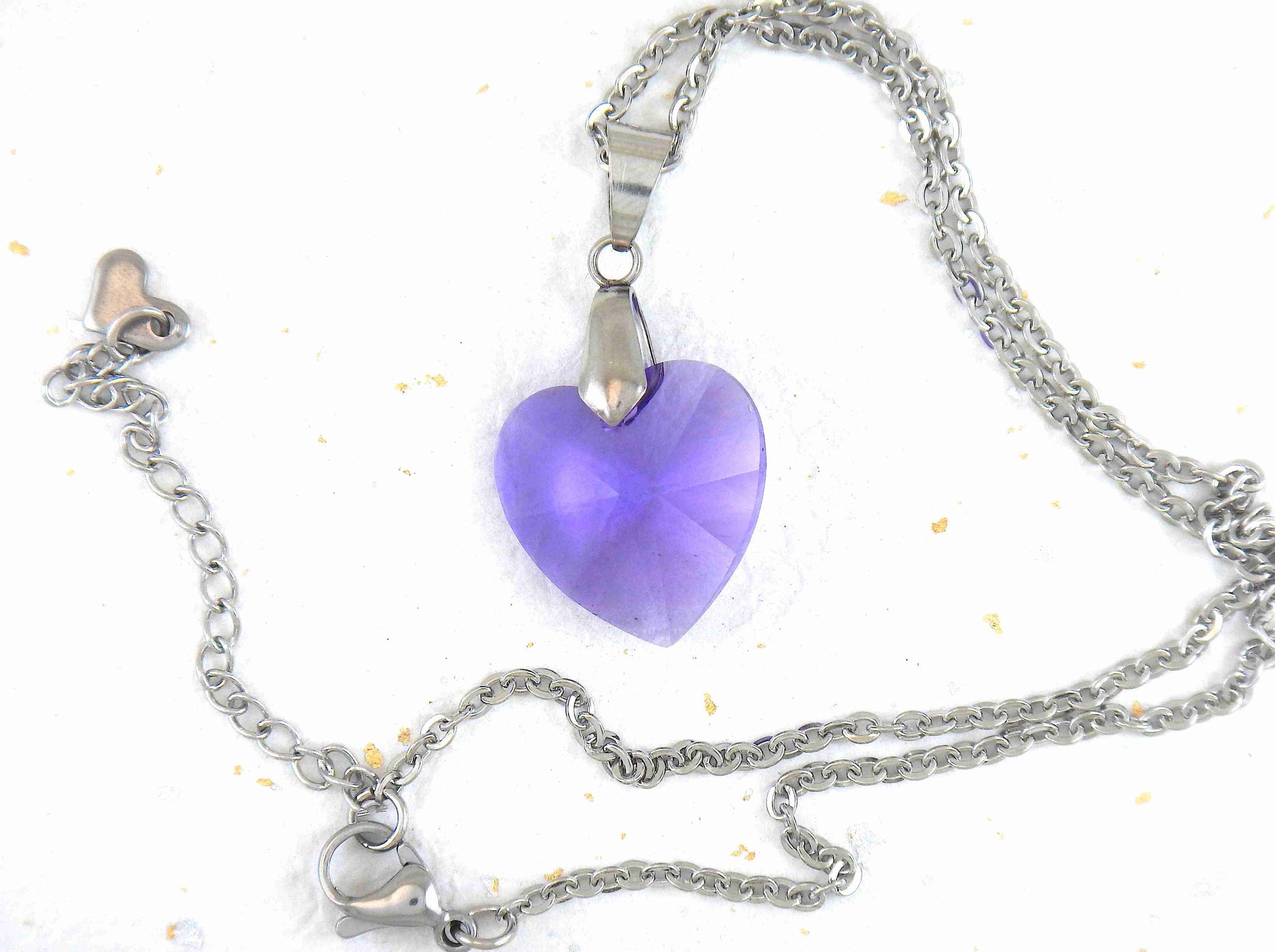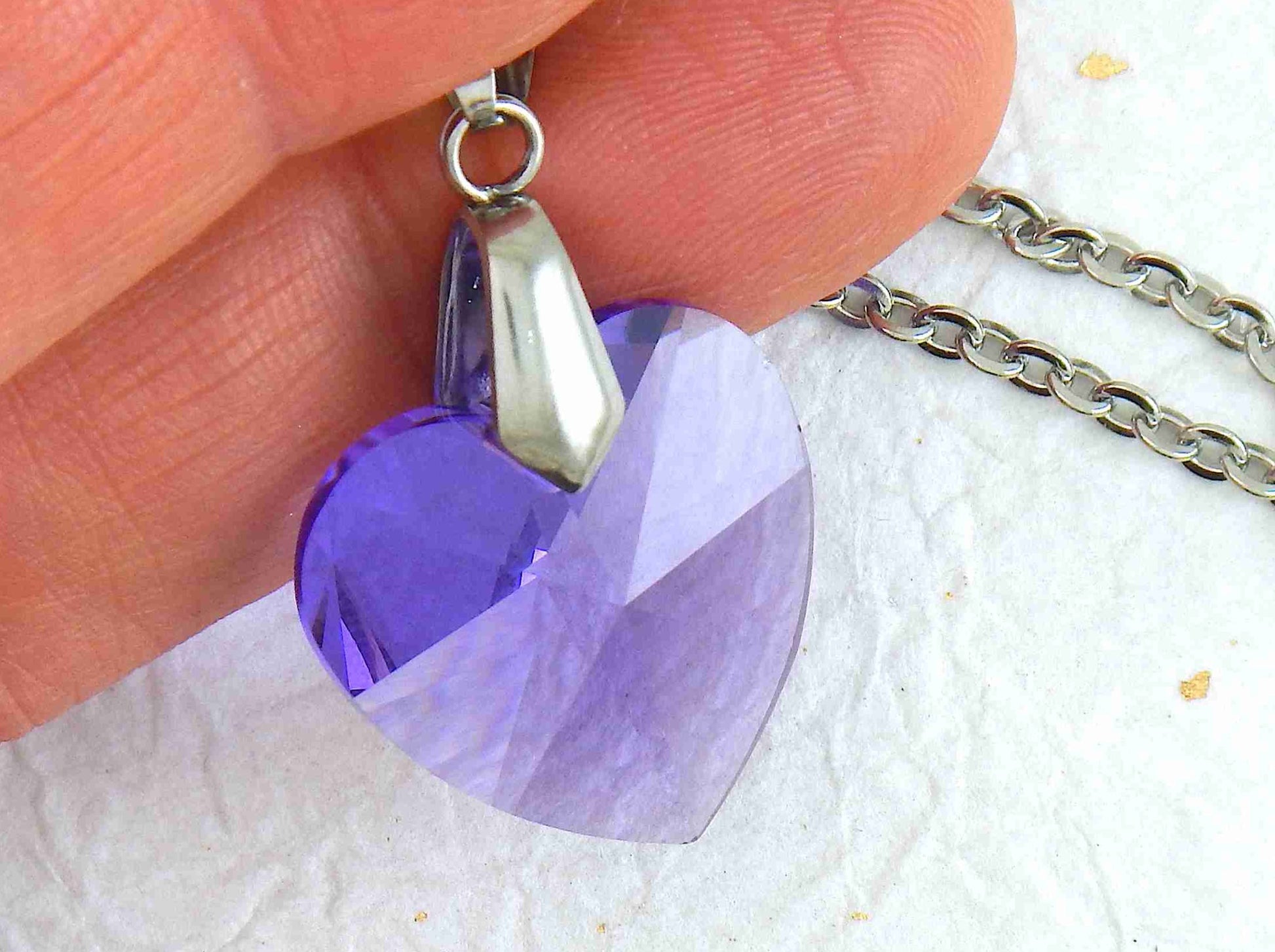 14/16-inch necklace with 20mm Blue Violet faceted Swarovski crystal heart pendant, stainless steel chain