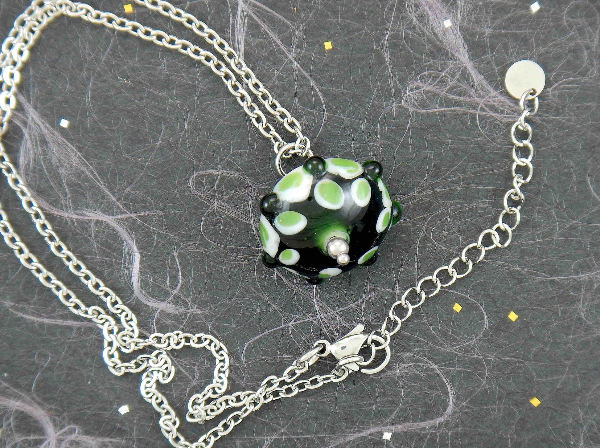 14-inch necklace with black saucer-shaped Murano glass bead, 3-dimensional green and white dots, stainless steel chain