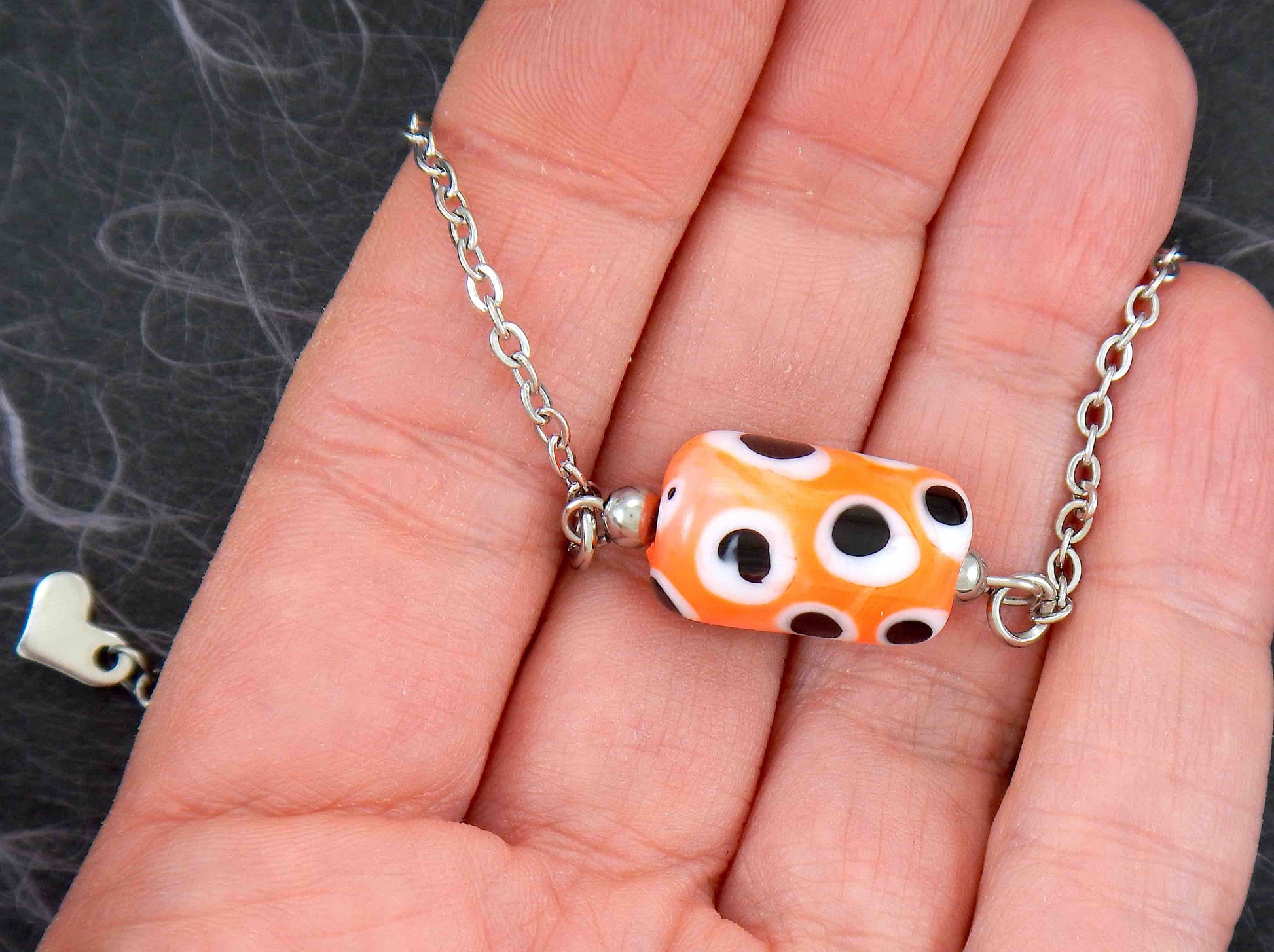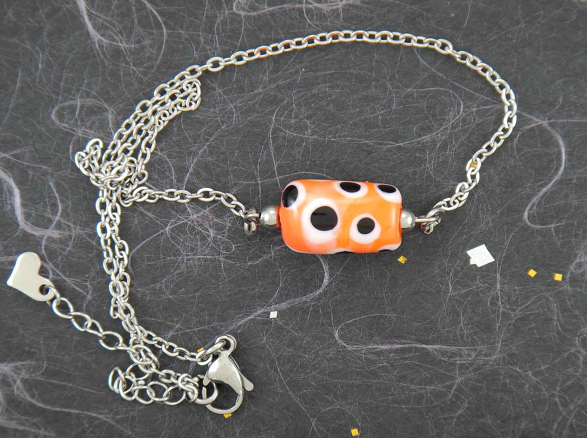 14-inch necklace with bright orange glass cylinder, black and white dots (Murano-style glass handmade in Montreal), stainless steel chain