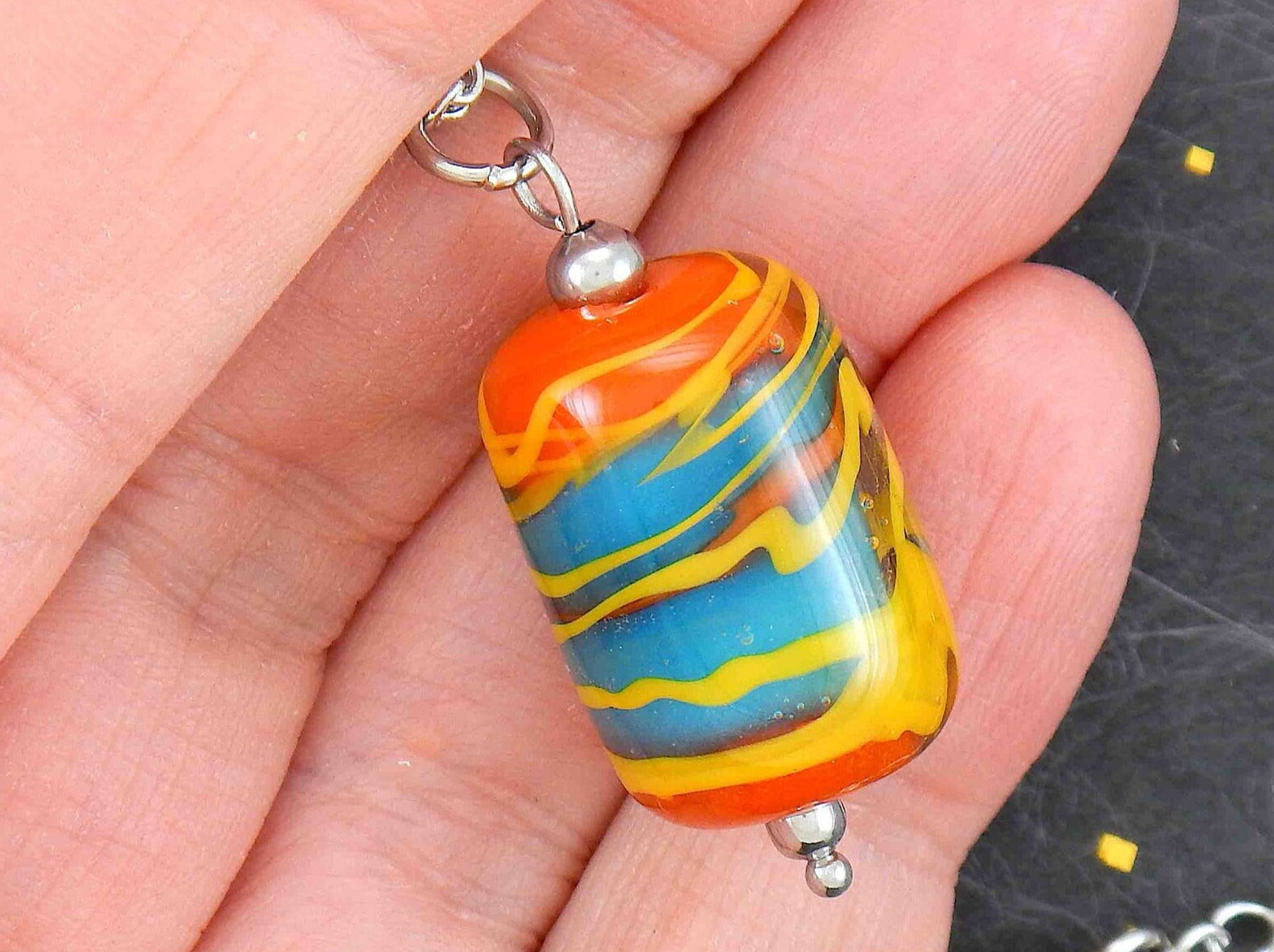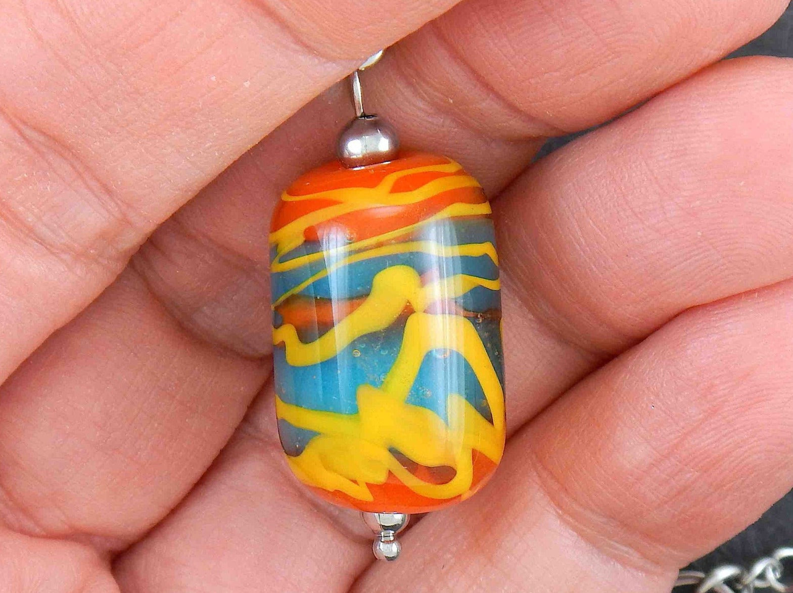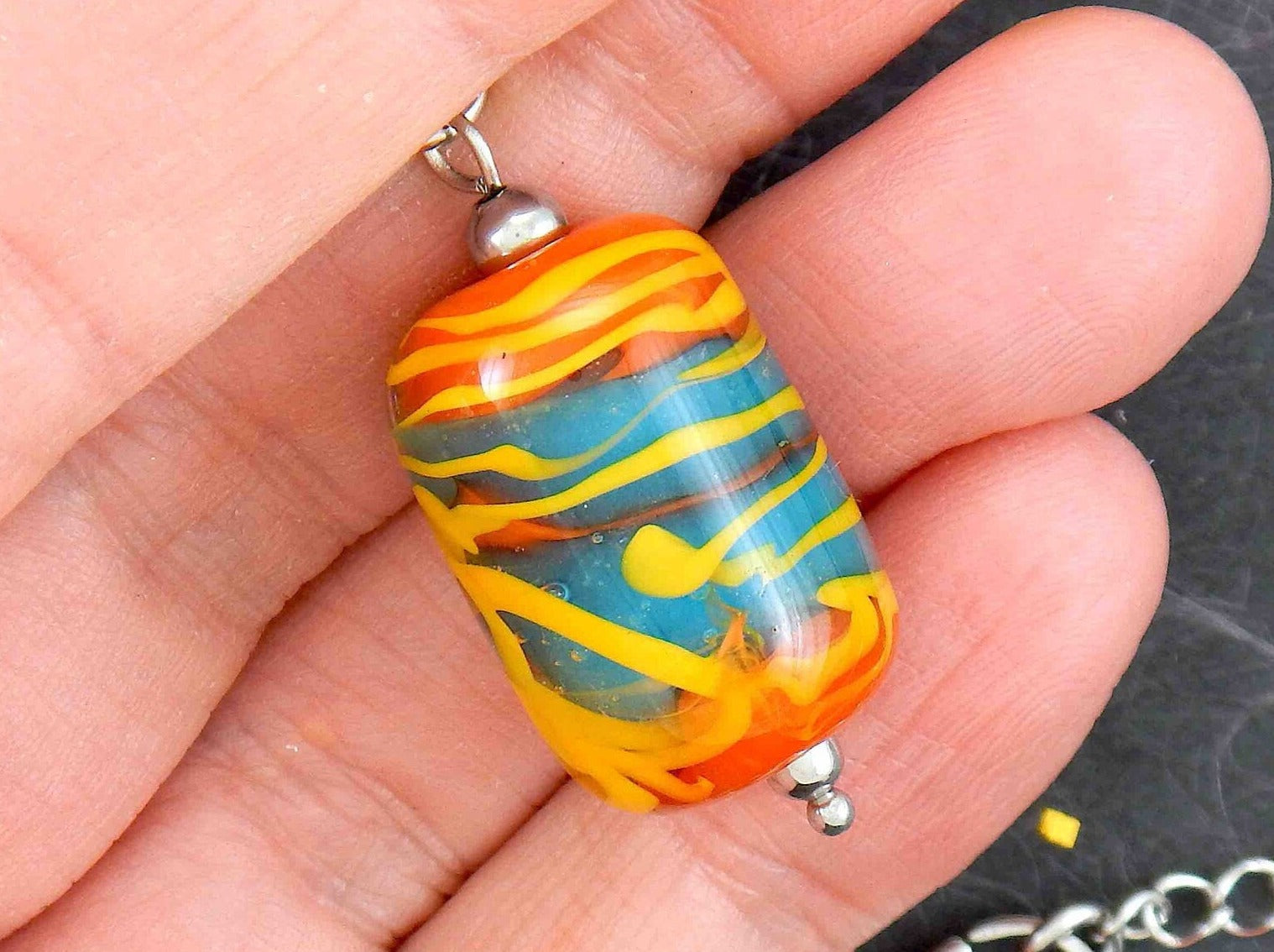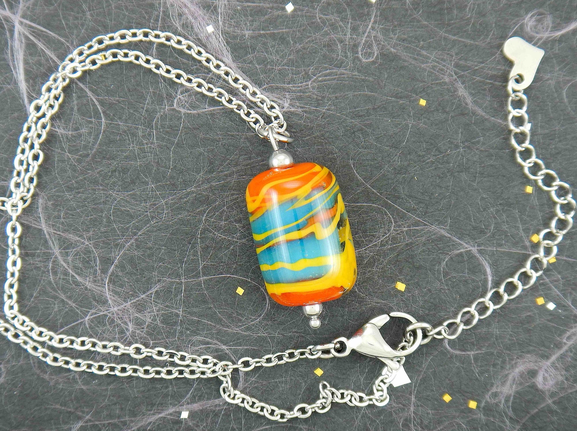 14-inch necklace with burnt orange glass cylinder marbled in turquoise & yellow (Murano-style glass handmade in Montreal), stainless steel chain