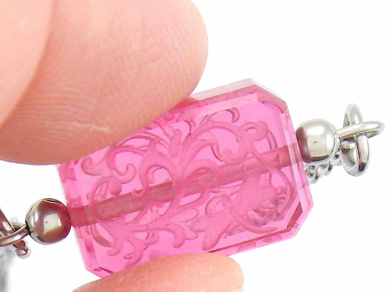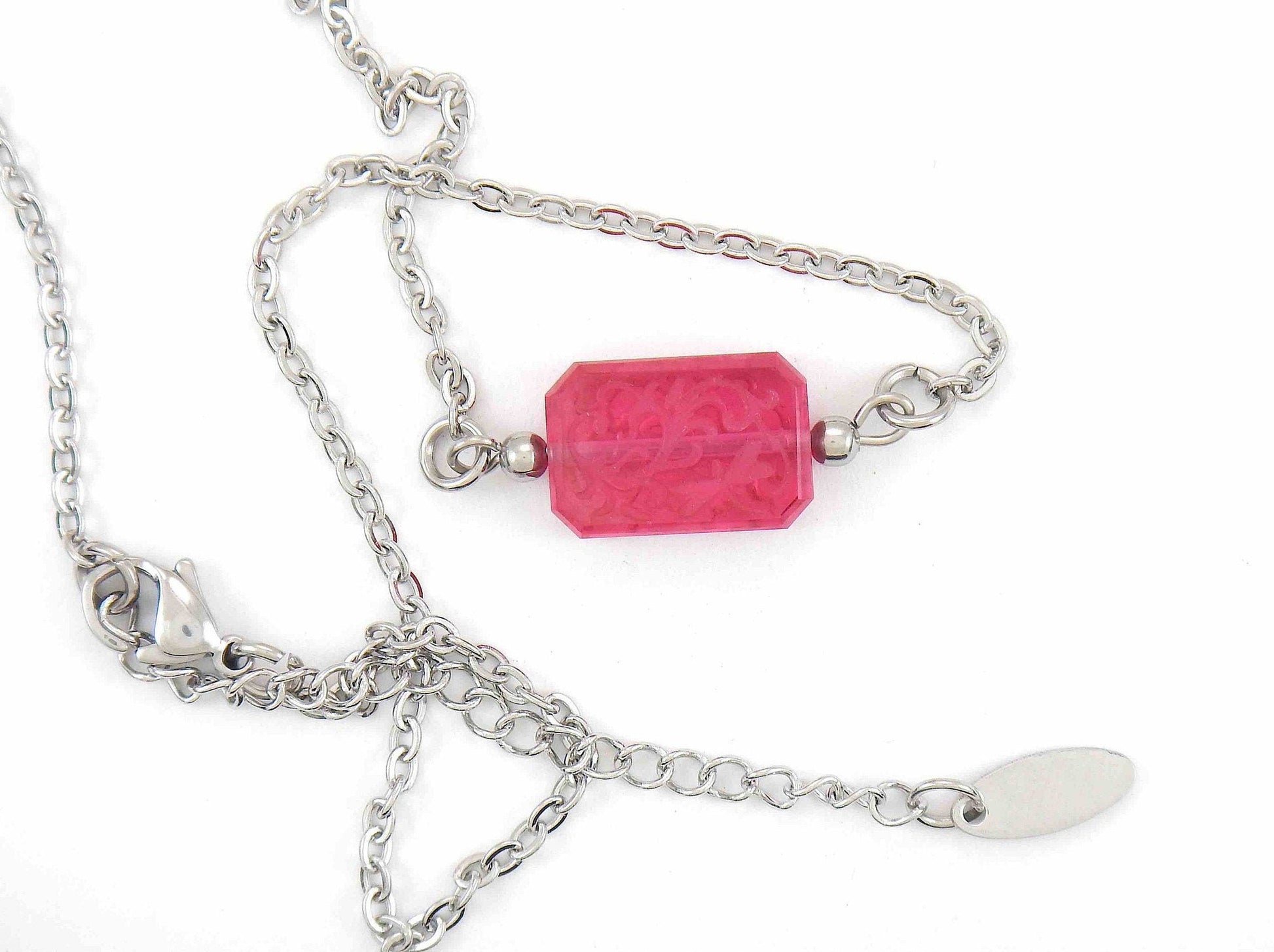 14-inch necklace with candy pink vintage French crystal rectangle, leaf and dragonfly engraving on both sides, stainless steel chain