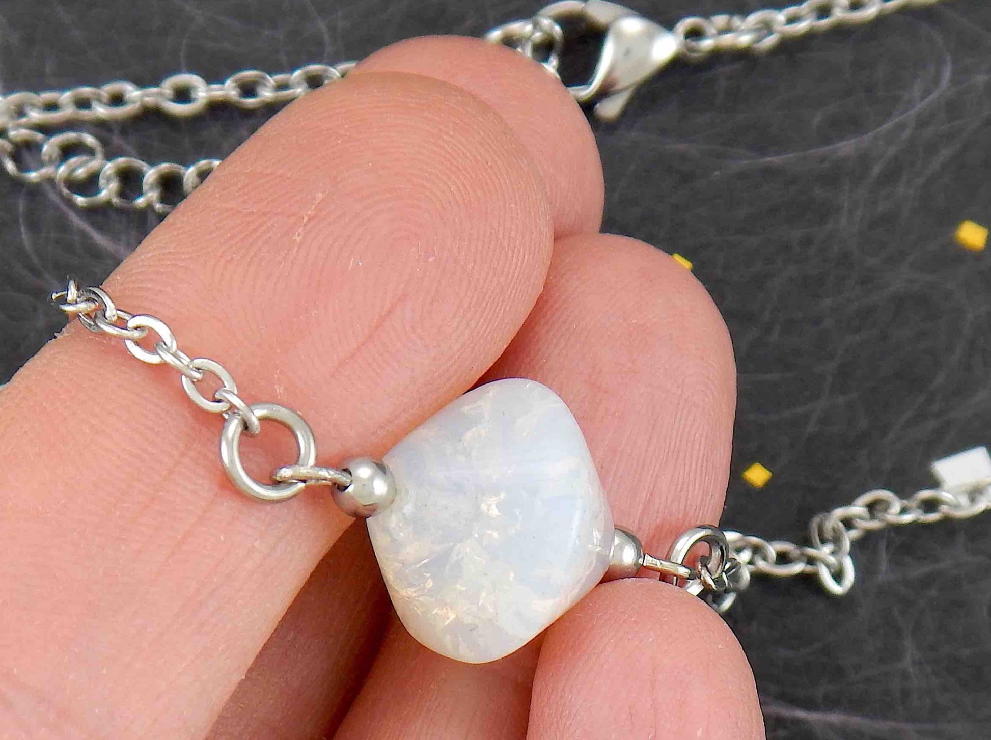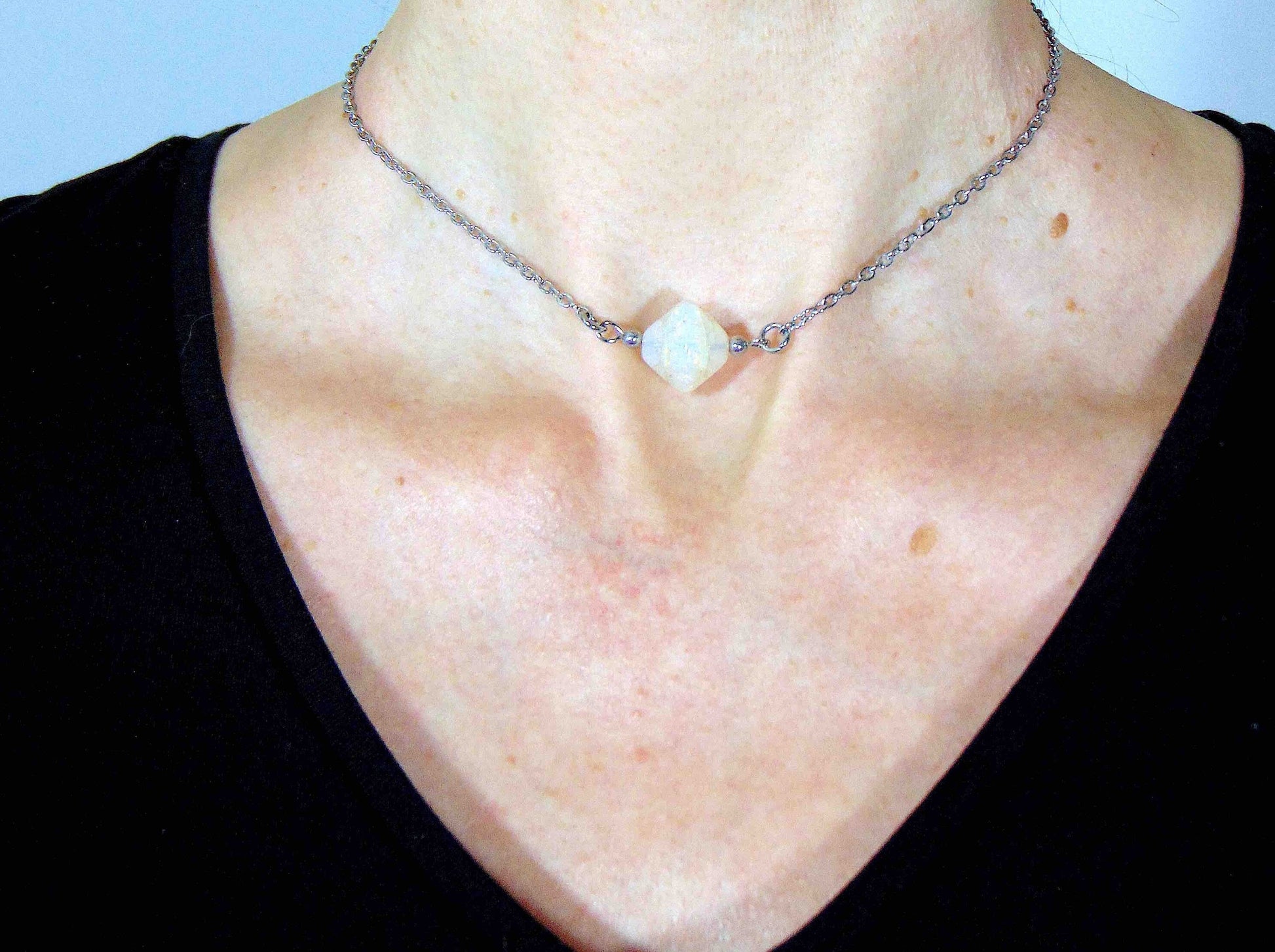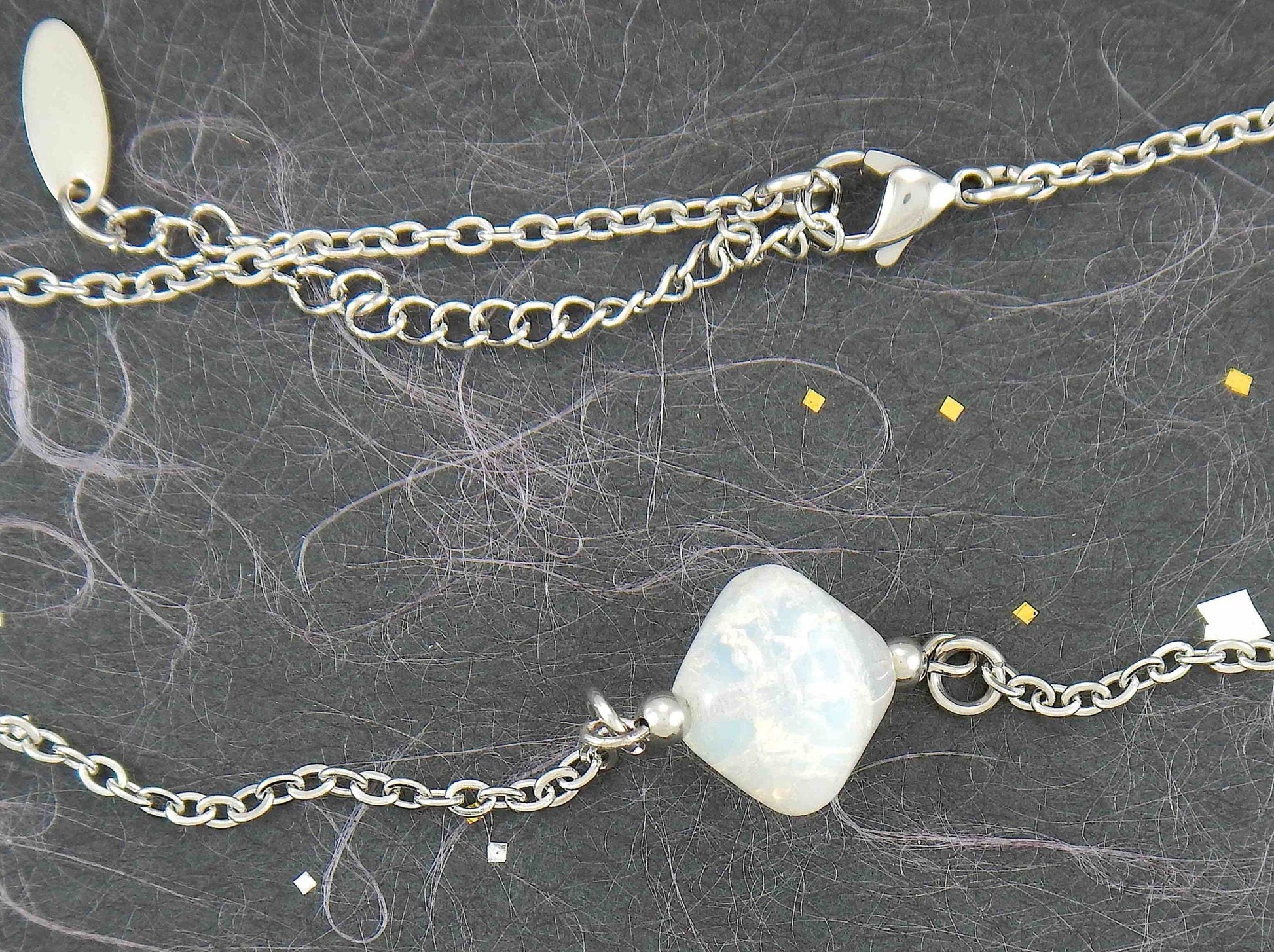 14-inch necklace with opalescent white vintage glass bicone, stainless steel chain
