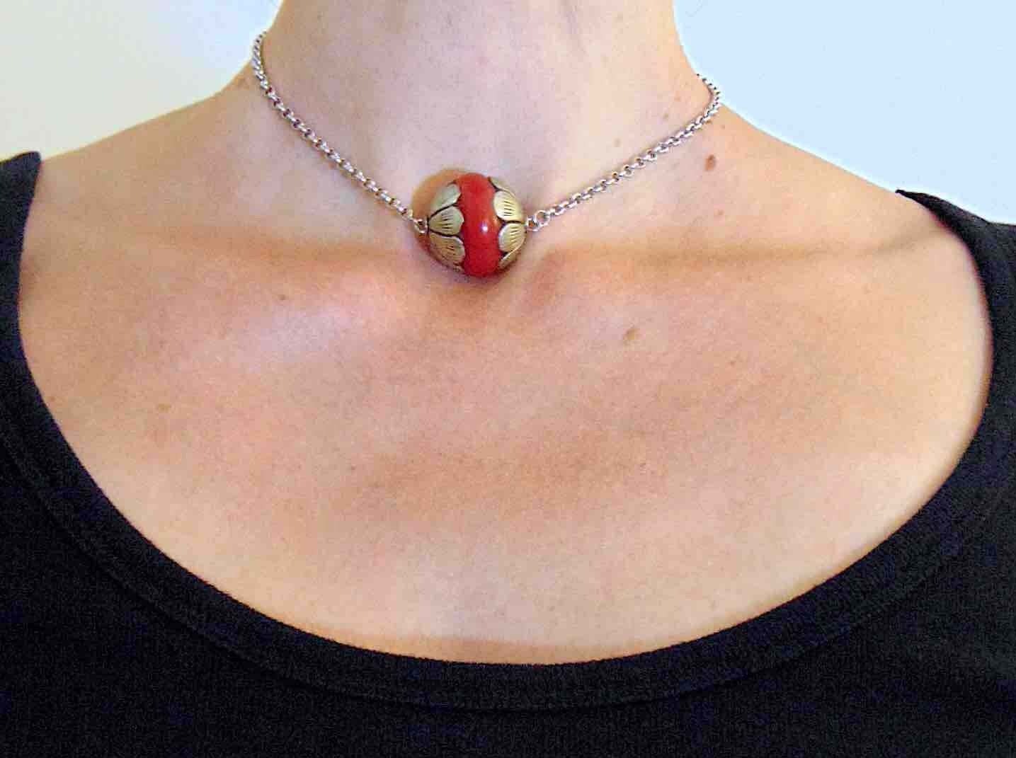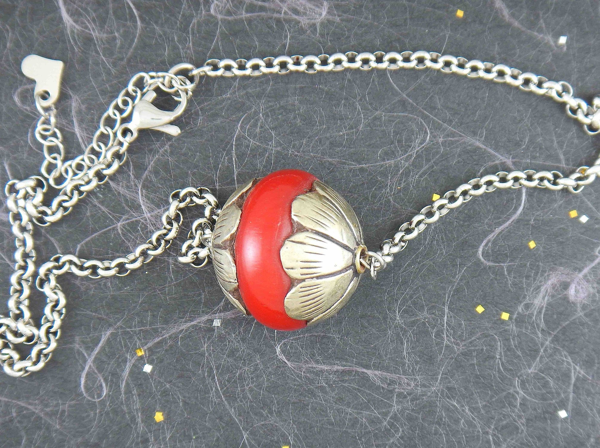 14-inch necklace with pewter and red resin Tibetan ball, stylized flower caps, stainless steel chain
