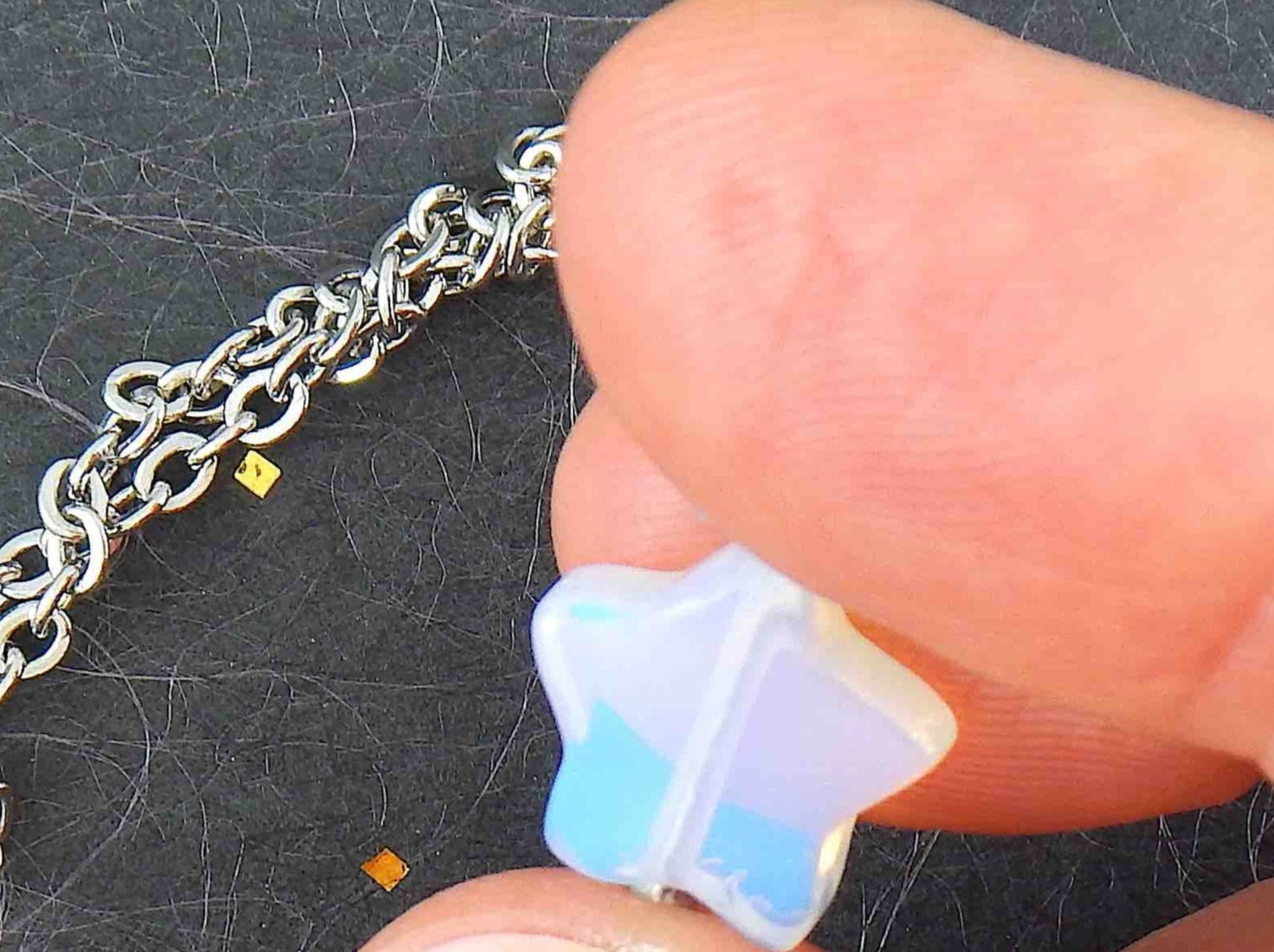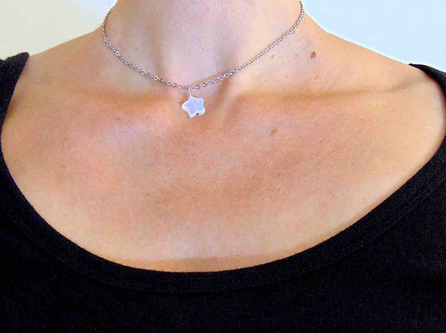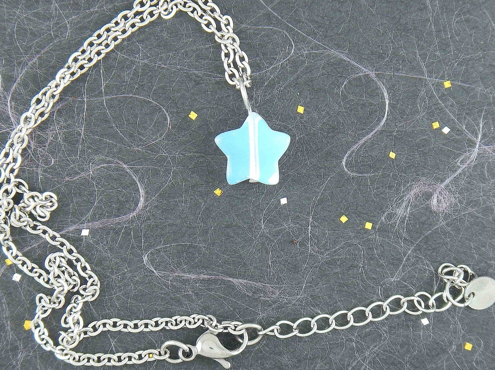 14-inch necklace with small opalescent white synthetic moonstone (opalite) star-shaped pendant, stainless steel chain