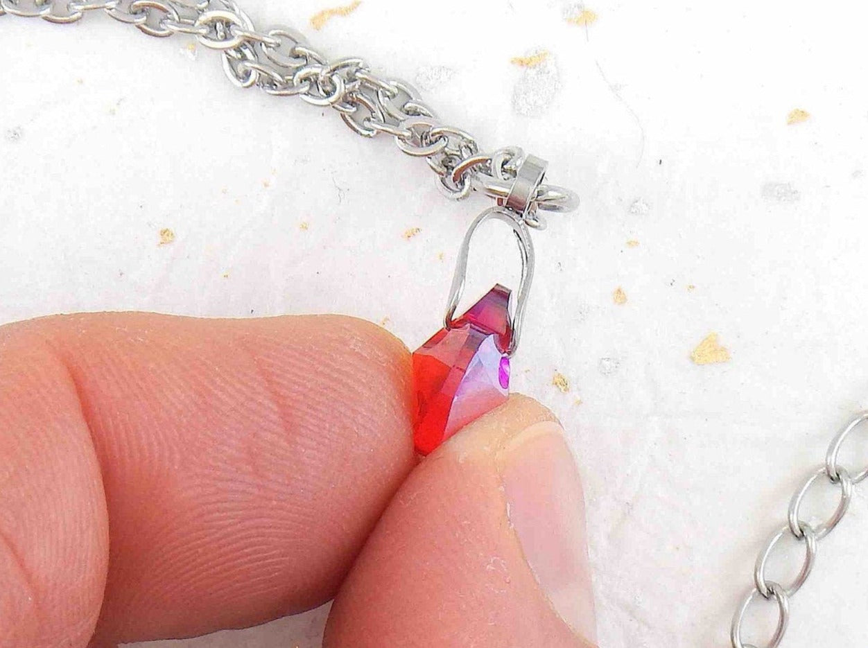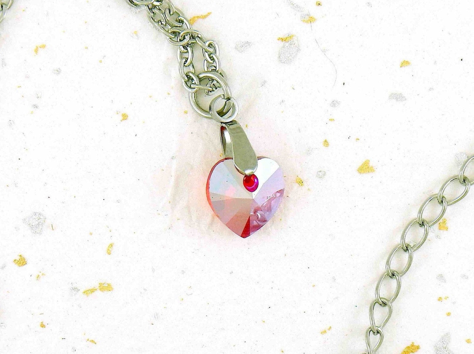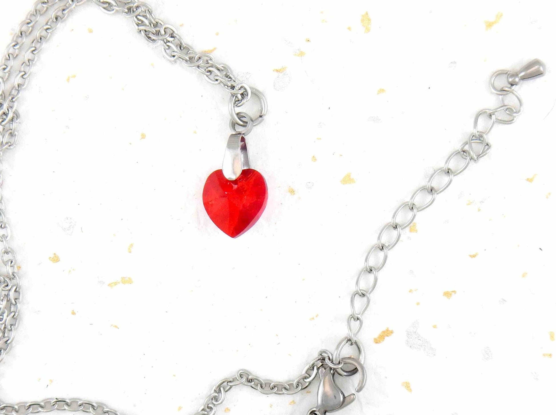 15-inch necklace with 10mm bright light red faceted Swarovski crystal heart pendant, stainless steel chain