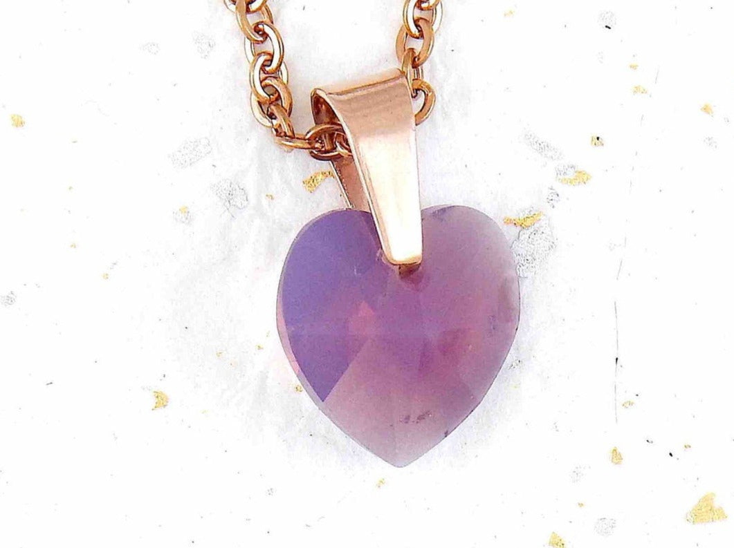 15-inch necklace with 15mm smoky lilac faceted Swarovski crystal heart pendant, rose gold-plated stainless steel chain
