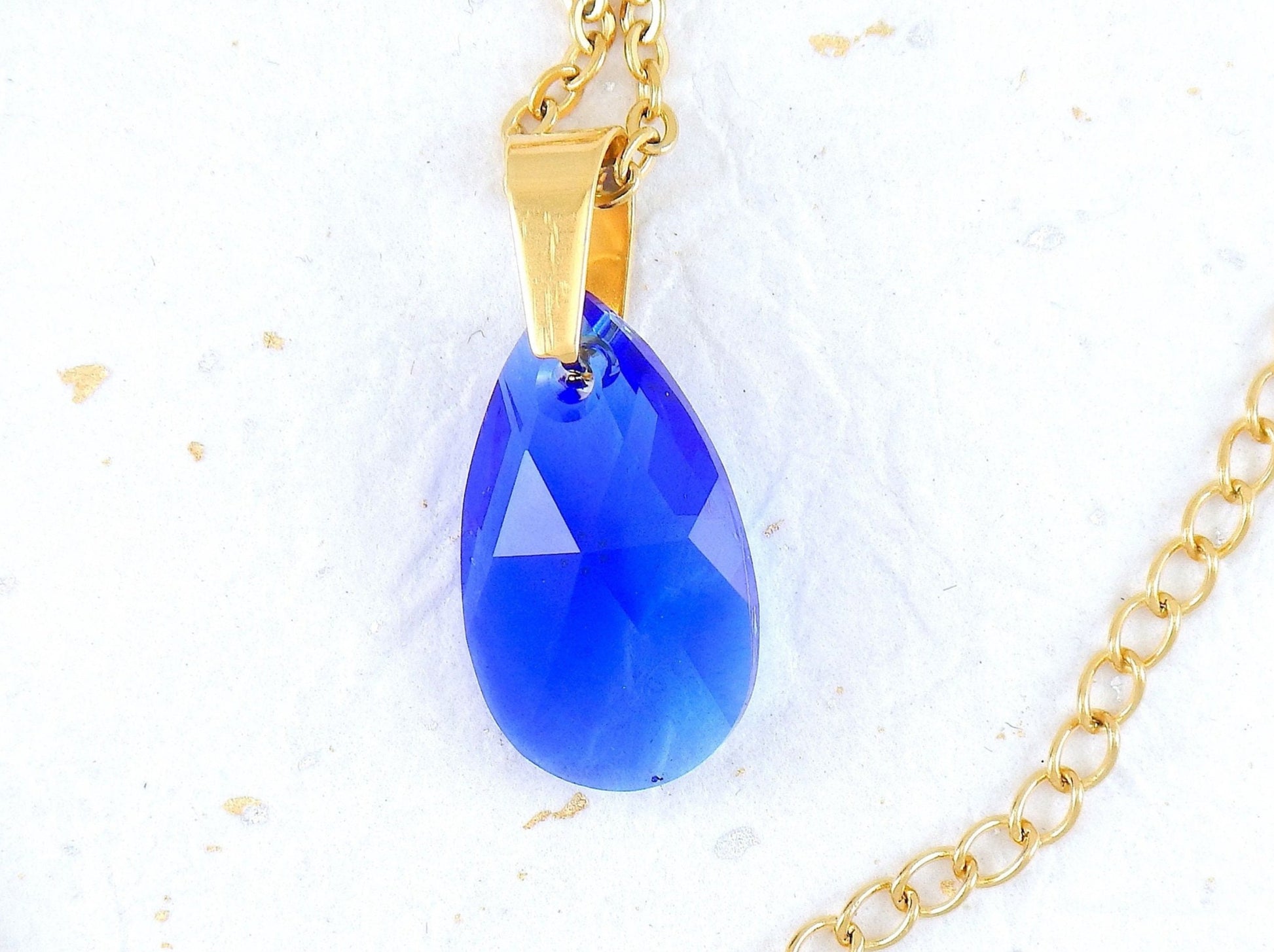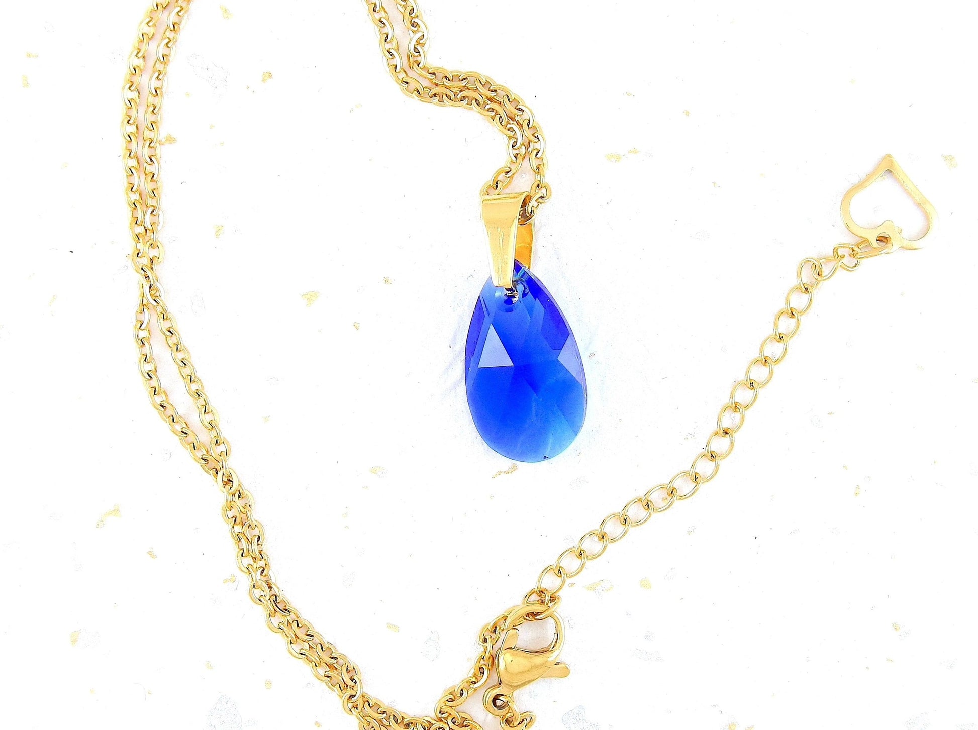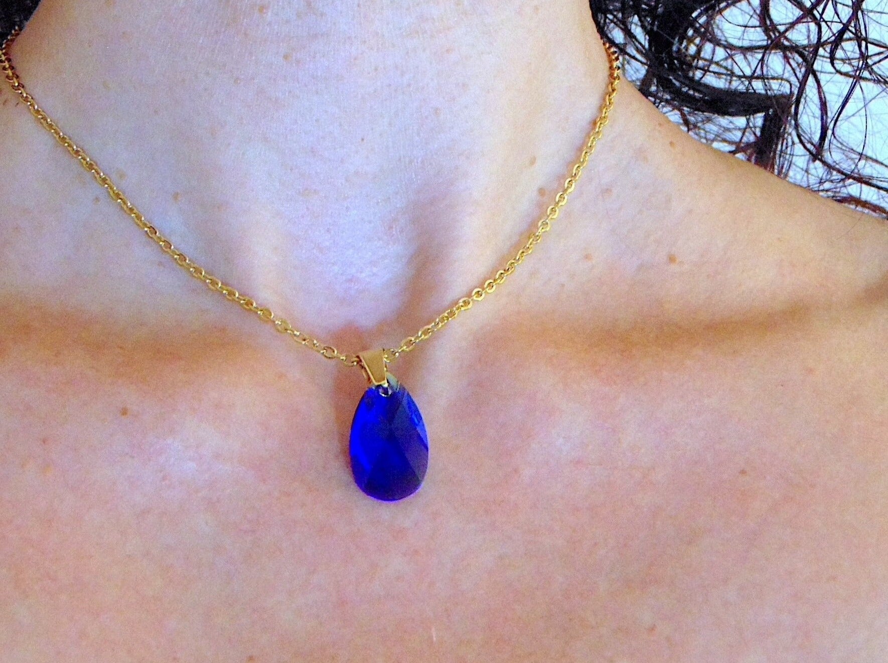 15-inch necklace with 20mm indigo Majestic Blue Swarovski crystal drop pendant, gold-toned stainless steel chain