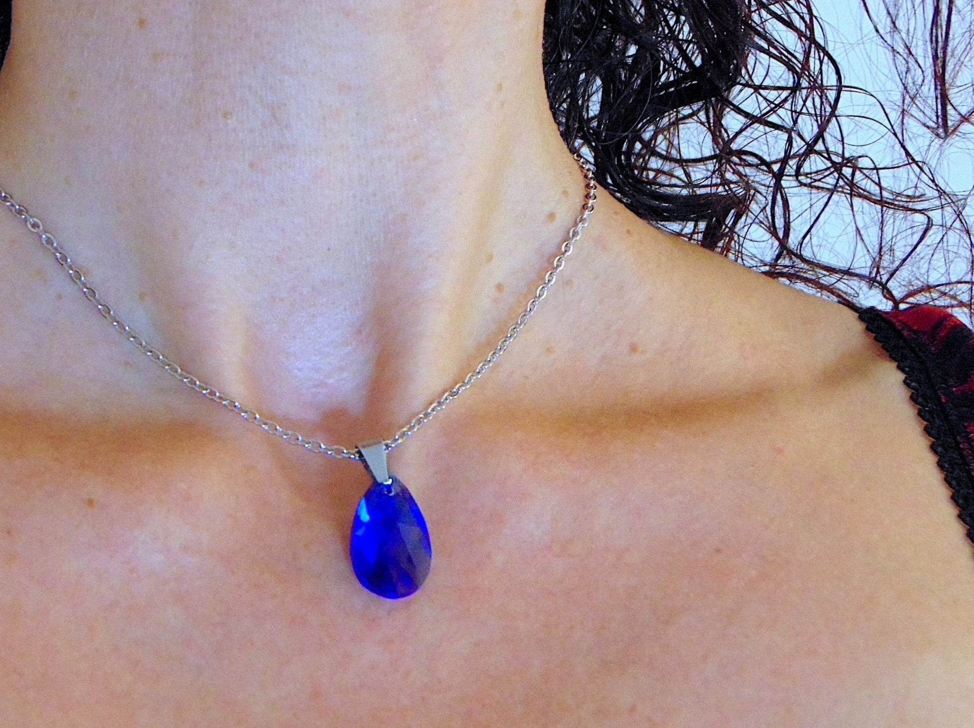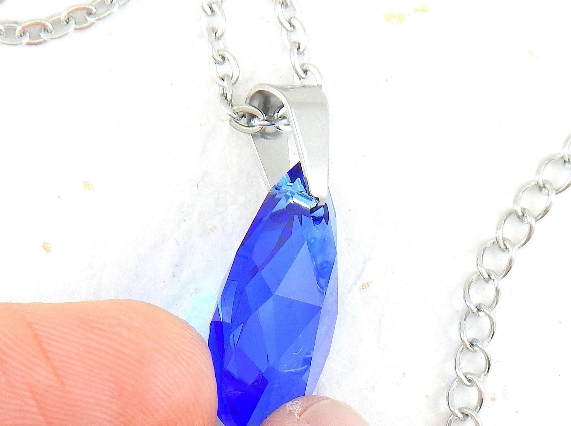 15-inch necklace with 20mm indigo Majestic Blue Swarovski crystal drop pendant, stainless steel chain