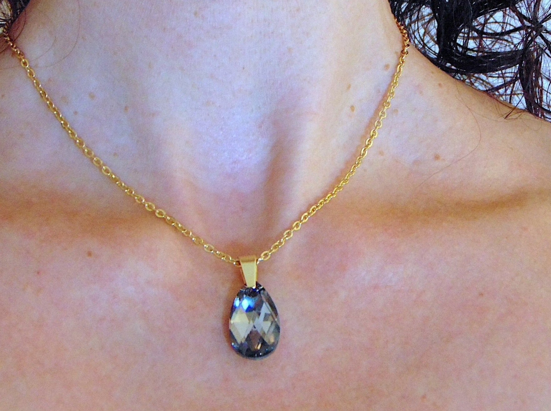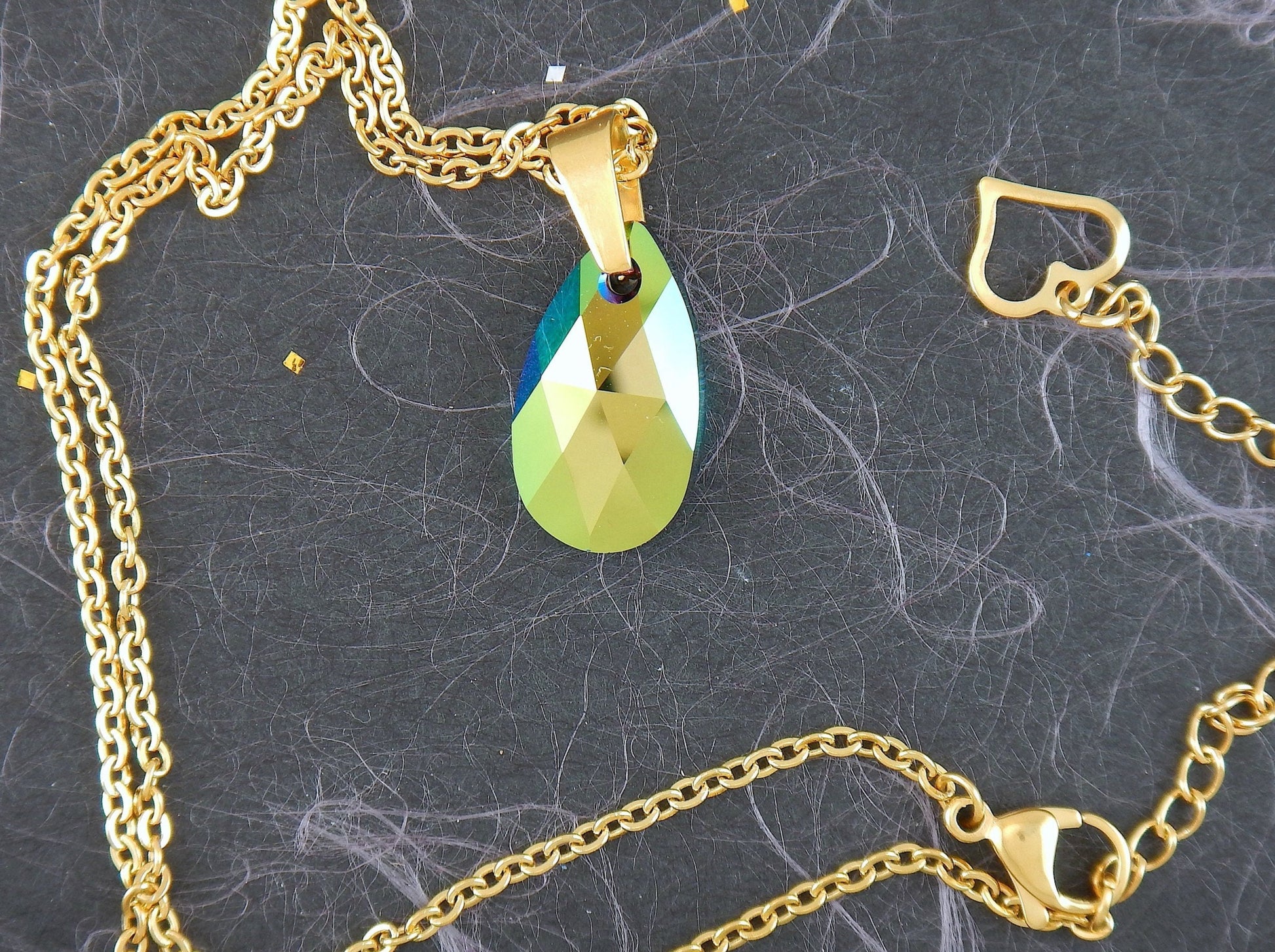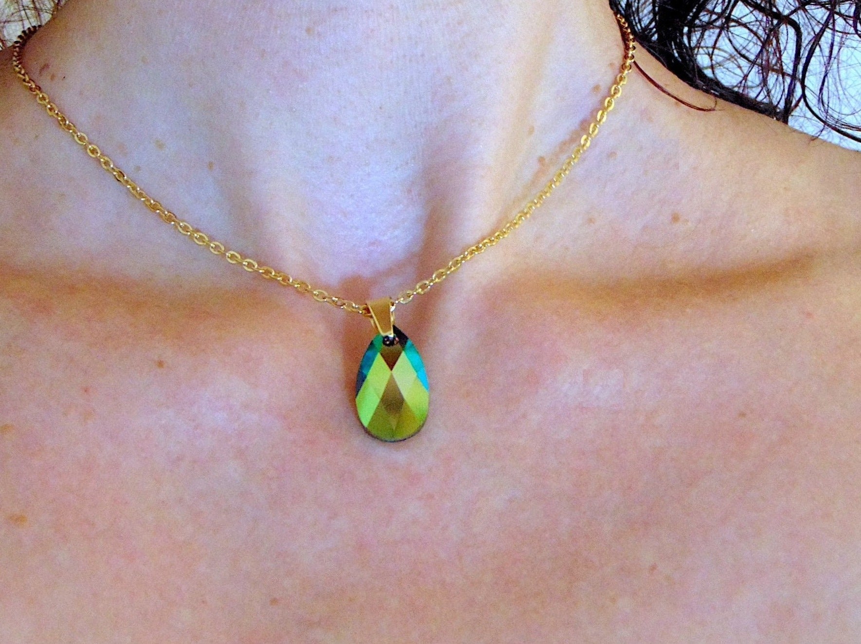 15-inch necklace with 20mm Swarovski crystal drop pendant, 1 side Scarabeus Green, 1 side Silver Gray, gold-toned stainless steel chain