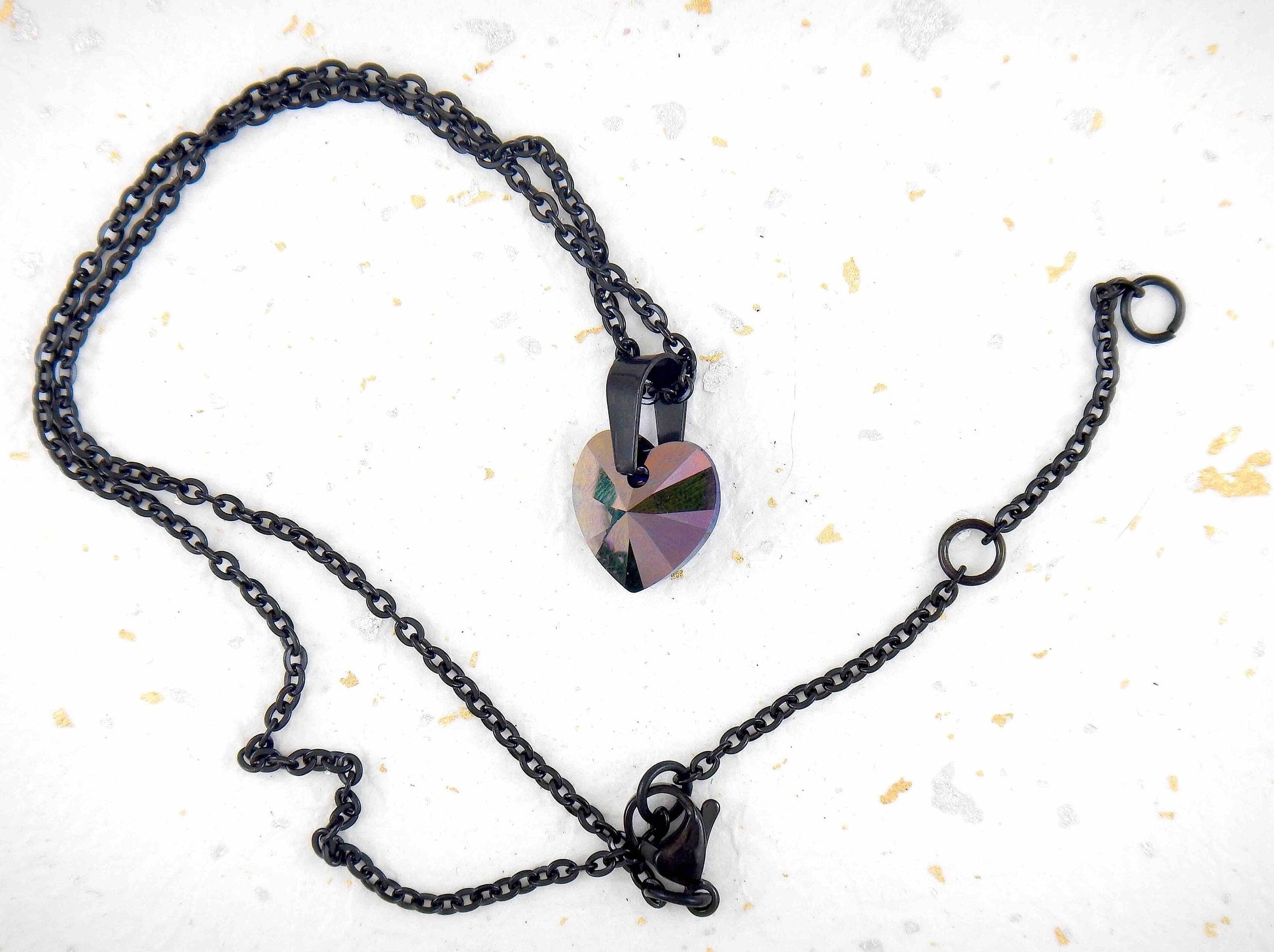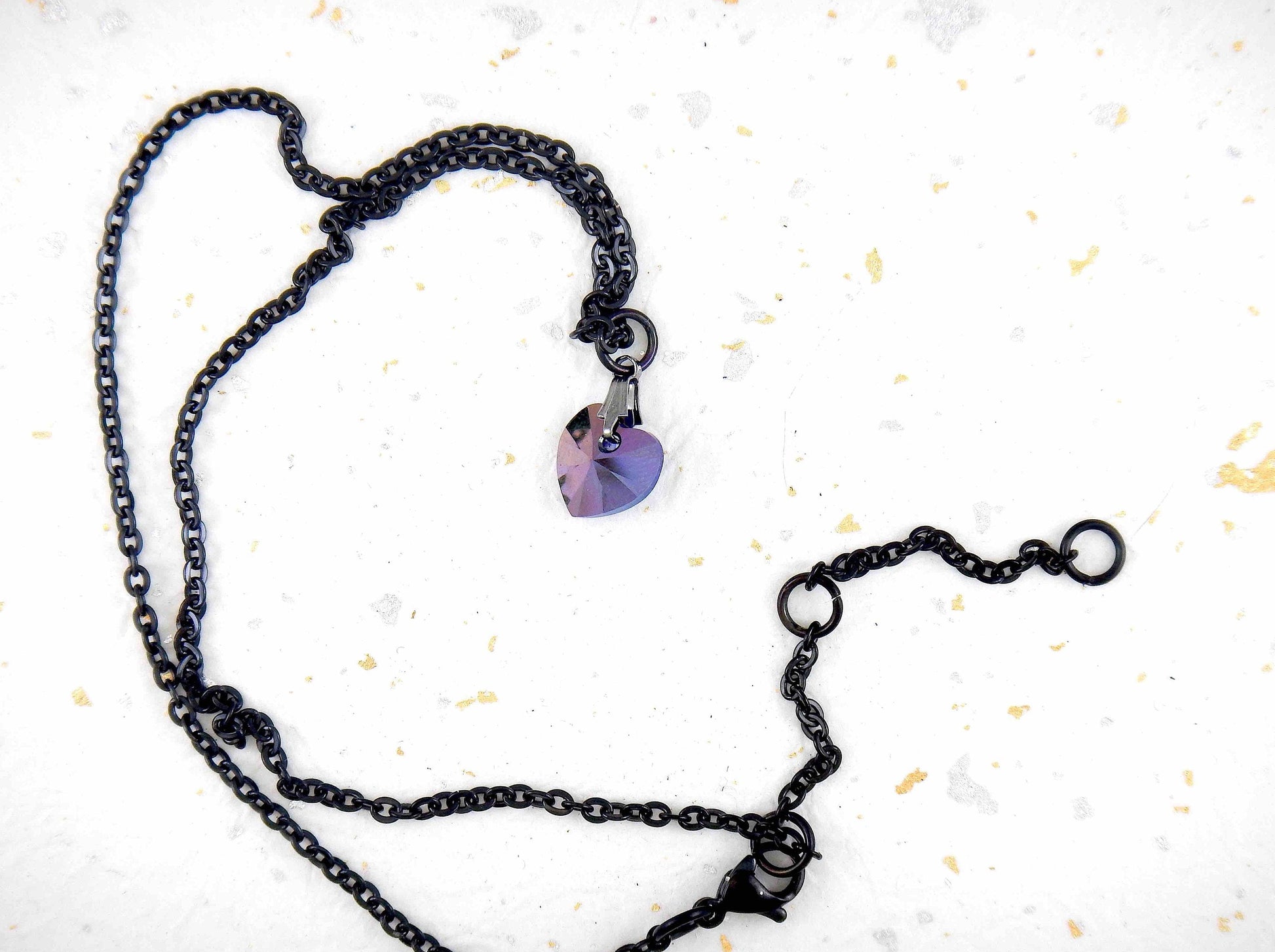 15-inch necklace with Heliotrope (deep violet-blue) faceted Swarovski crystal heart pendant (10mm or 15mm), black stainless steel chain