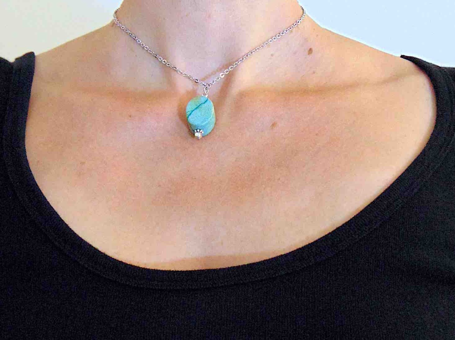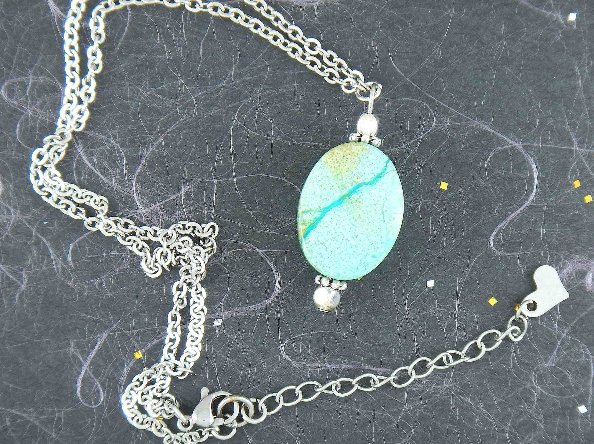 15-inch necklace with oval blue-green marbled chrysocolla stone, stainless steel chain chain