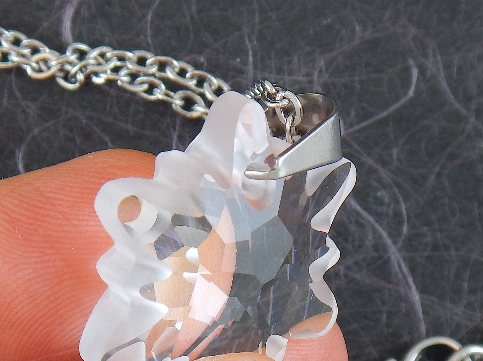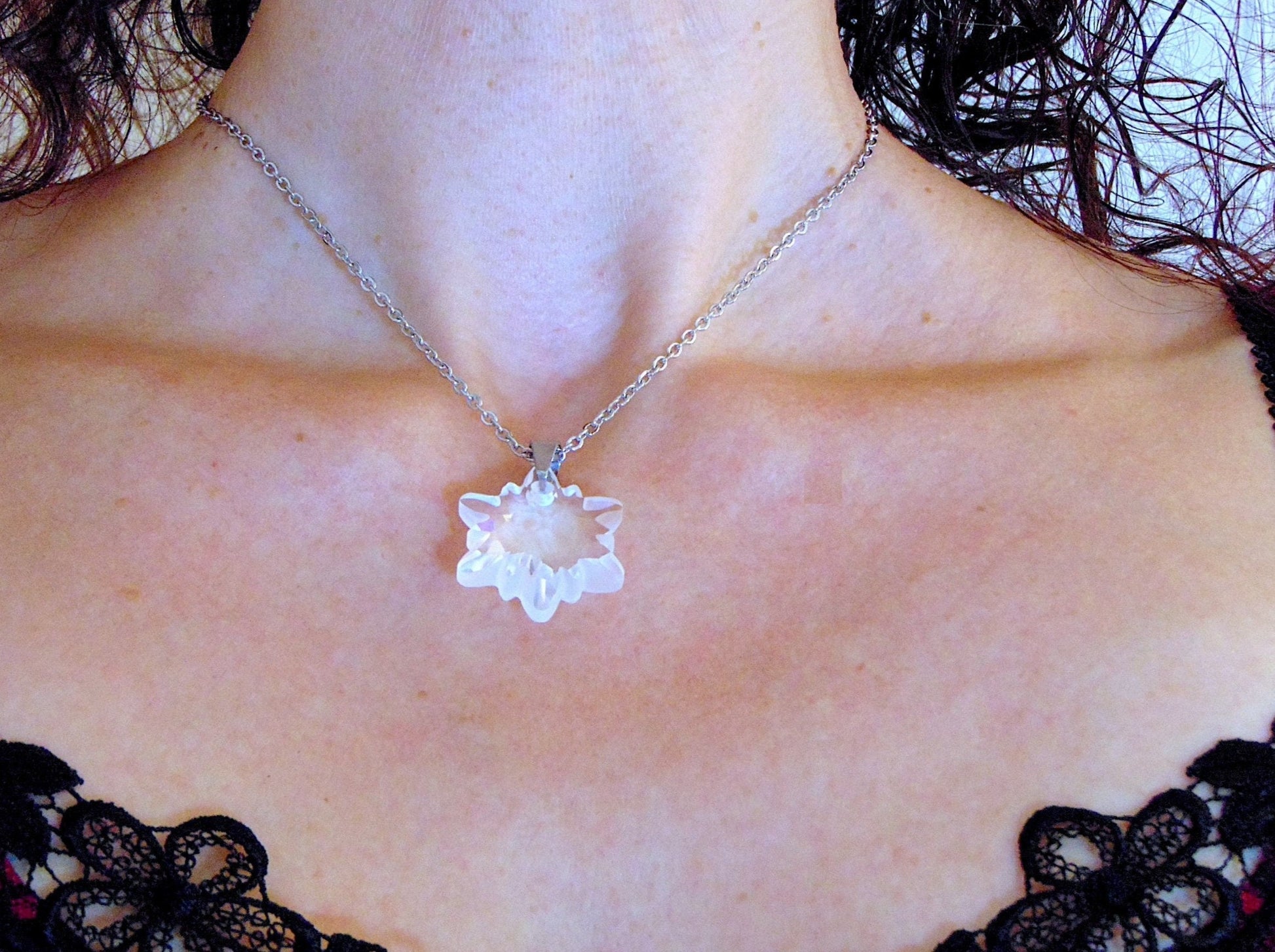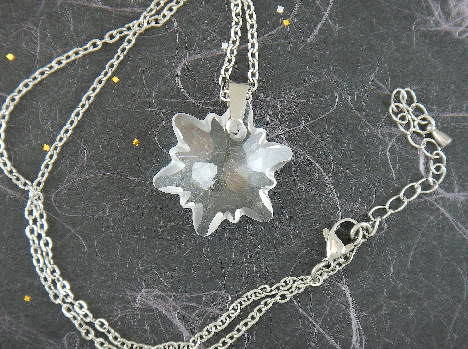 15-inch necklace with rare 30mm Edelweiss Swarovski crystal pendant, frosted edges, stainless steel chain