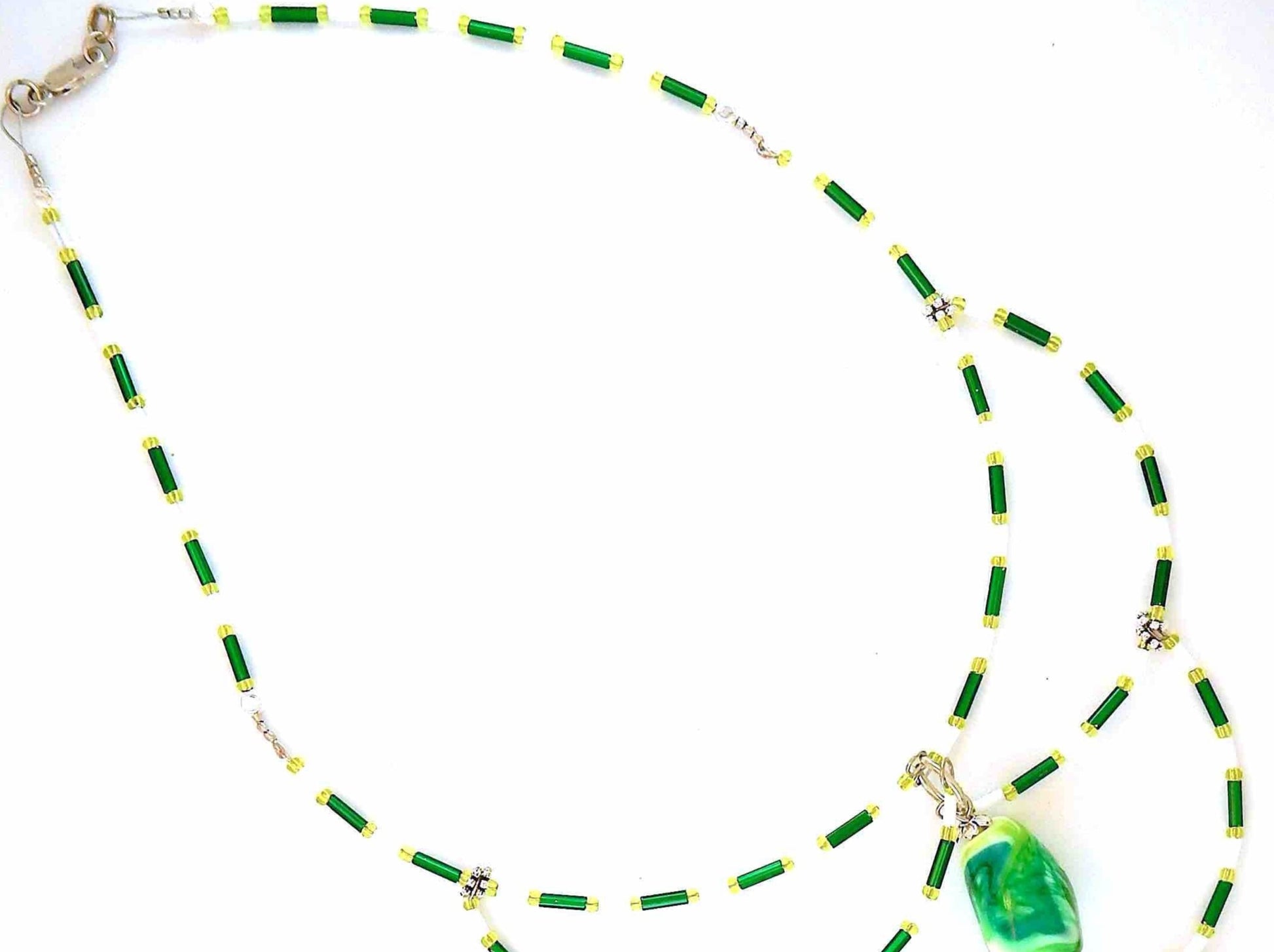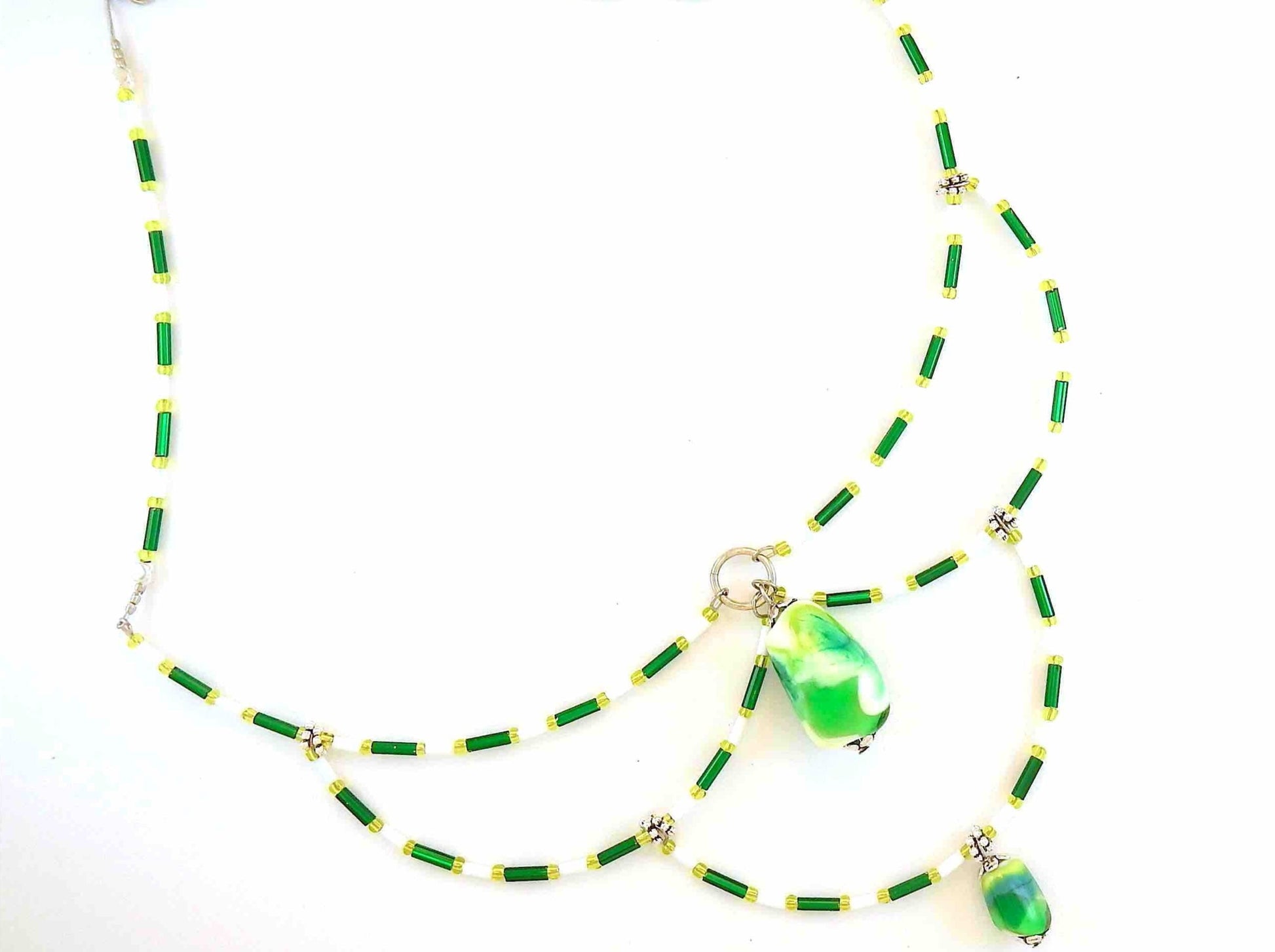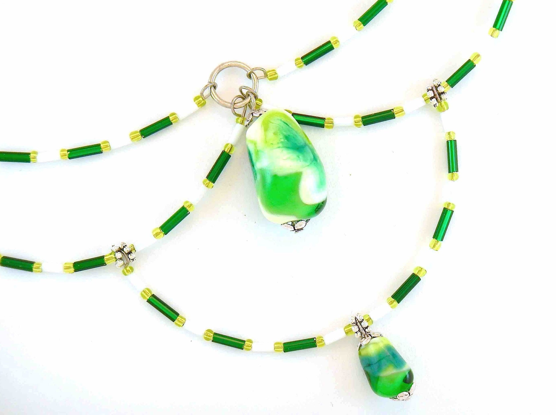 15-inch signature necklace with articulated green and white hoops and lampworked glass beads (Murano-style glass handmade in Montreal)