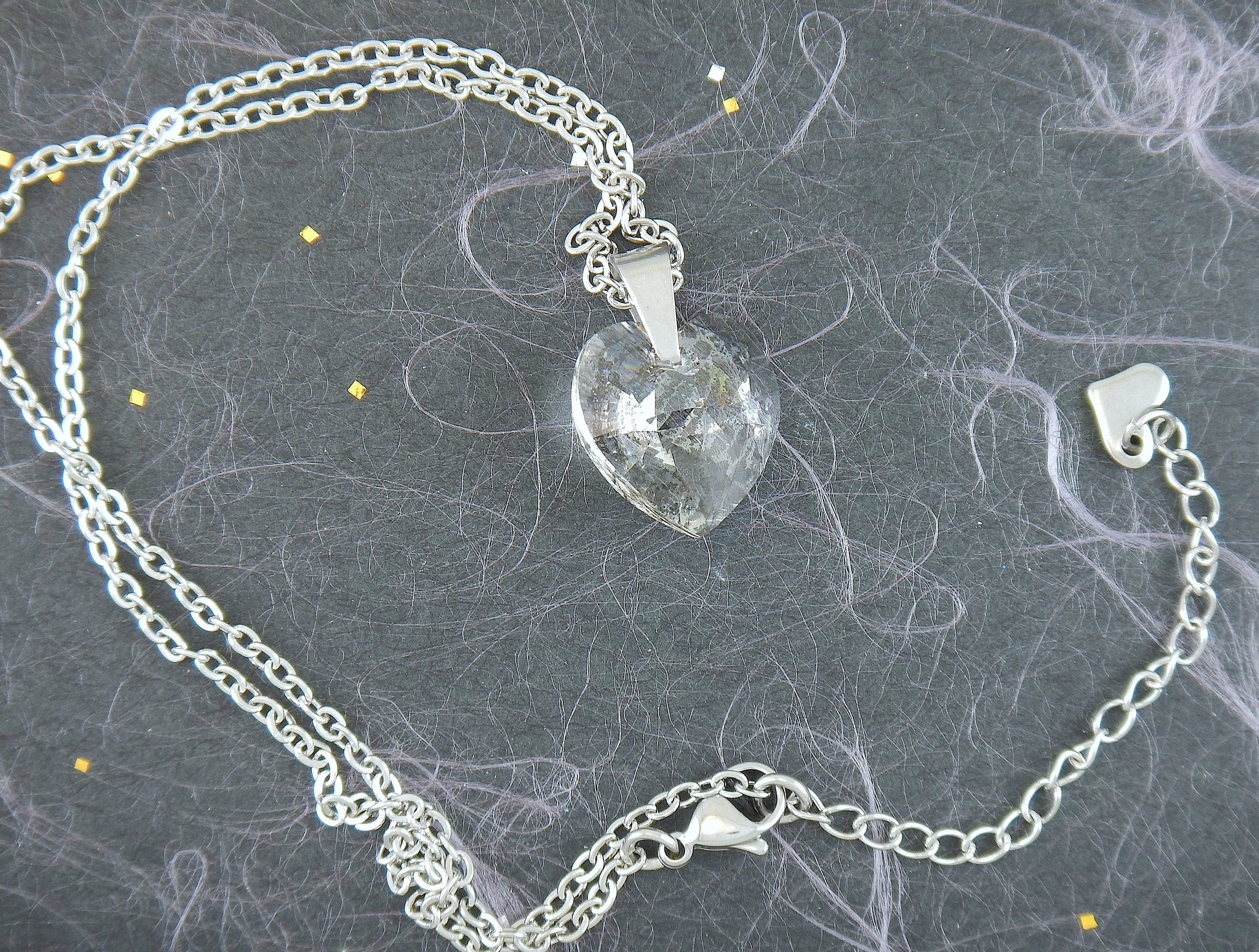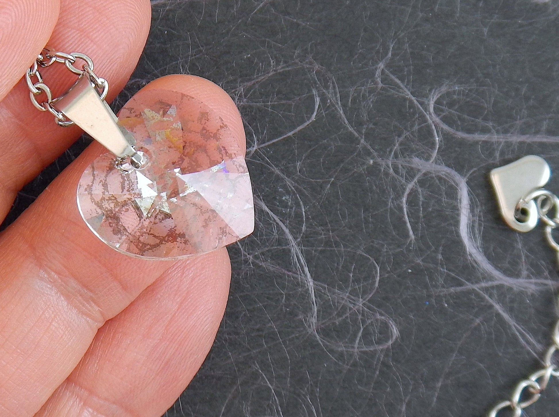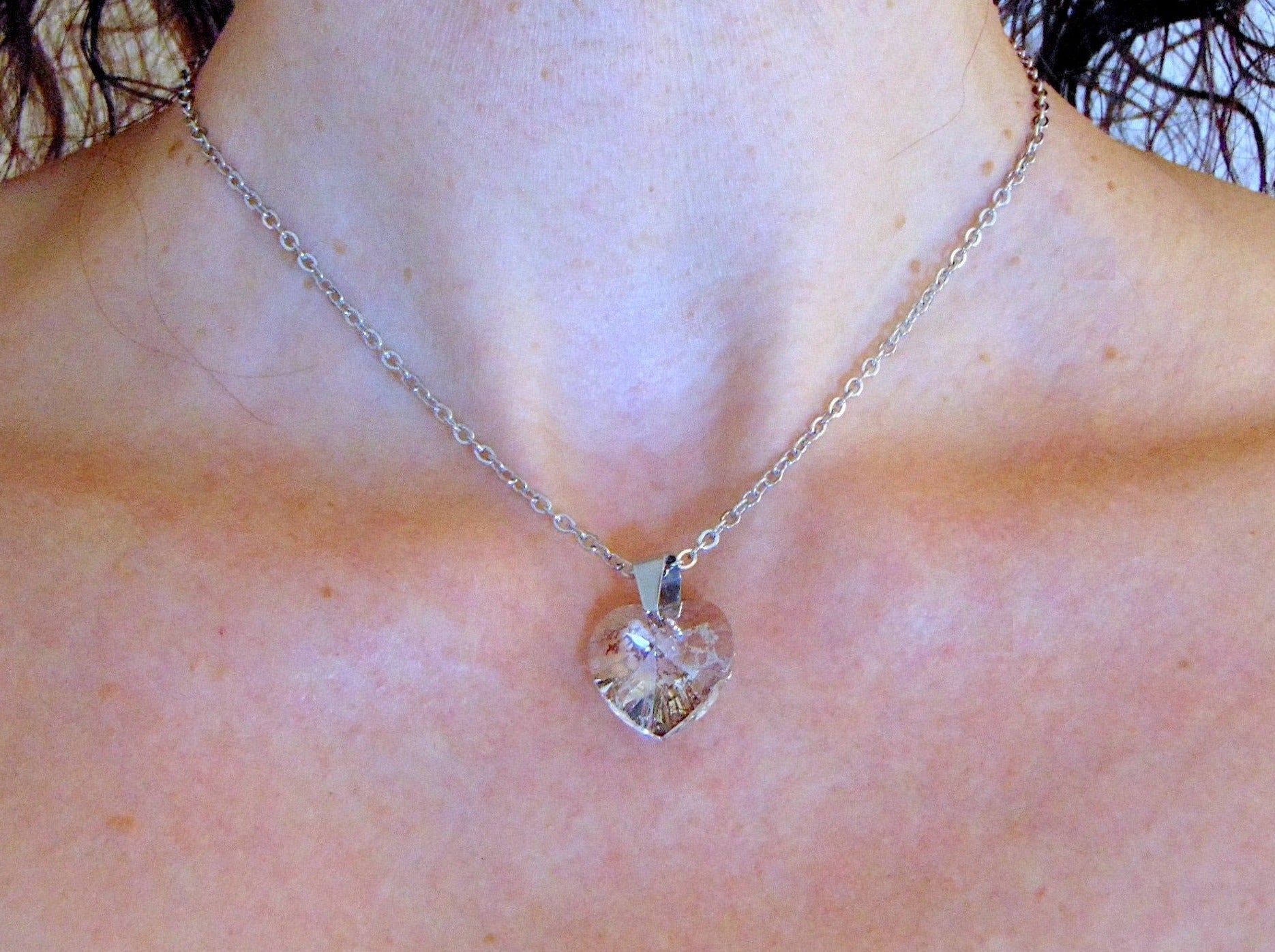 16-inch necklace with 15mm silver patina faceted Swarovski crystal heart pendant, stainless steel chain