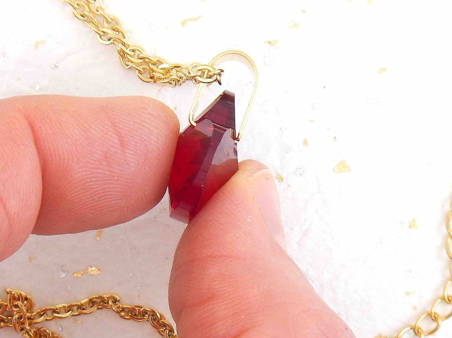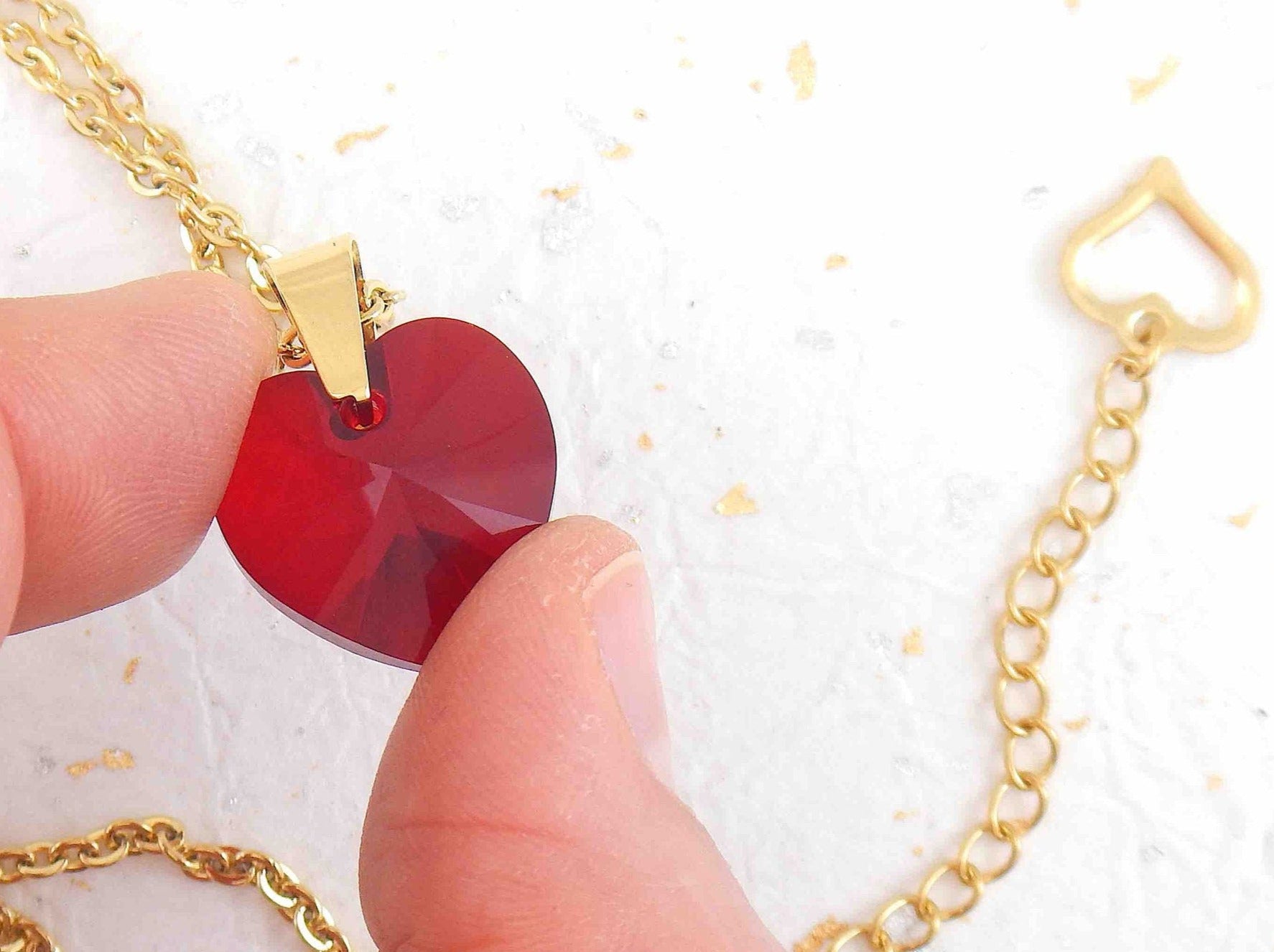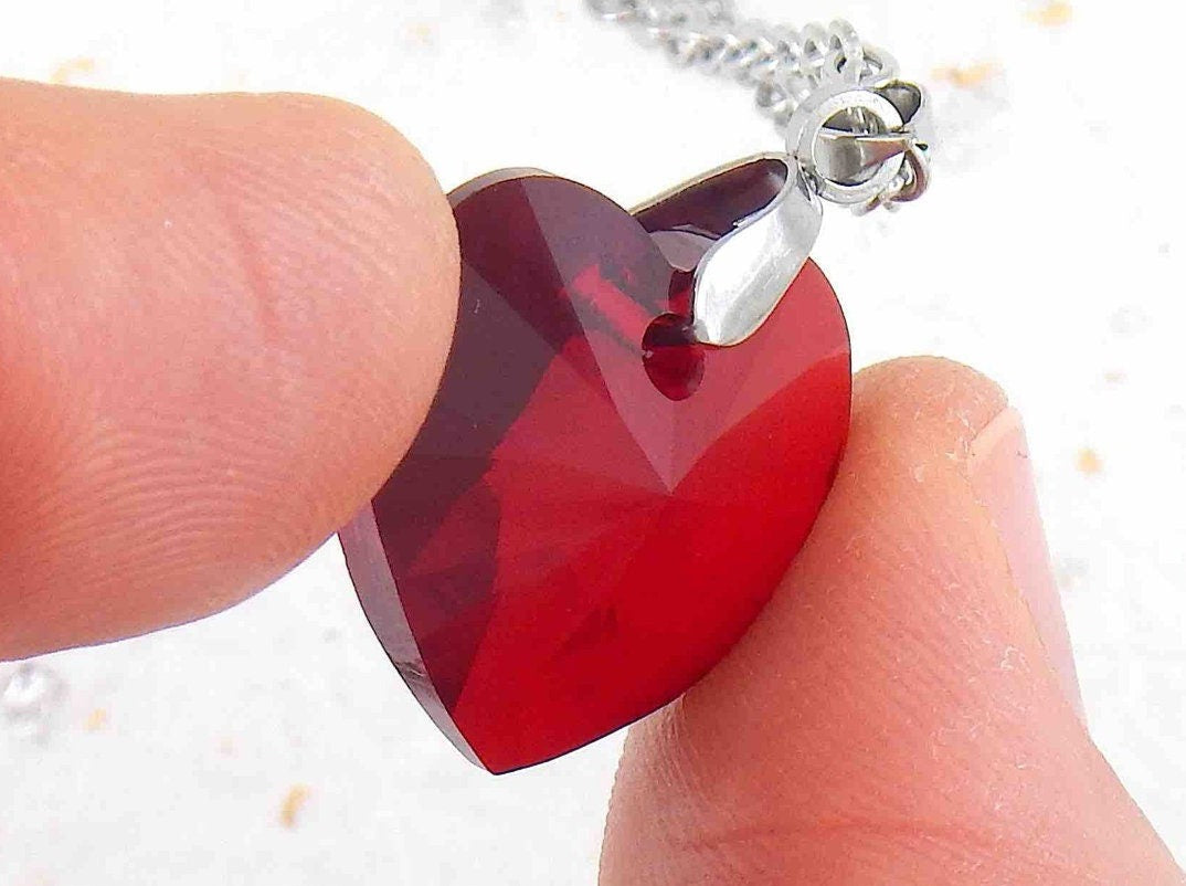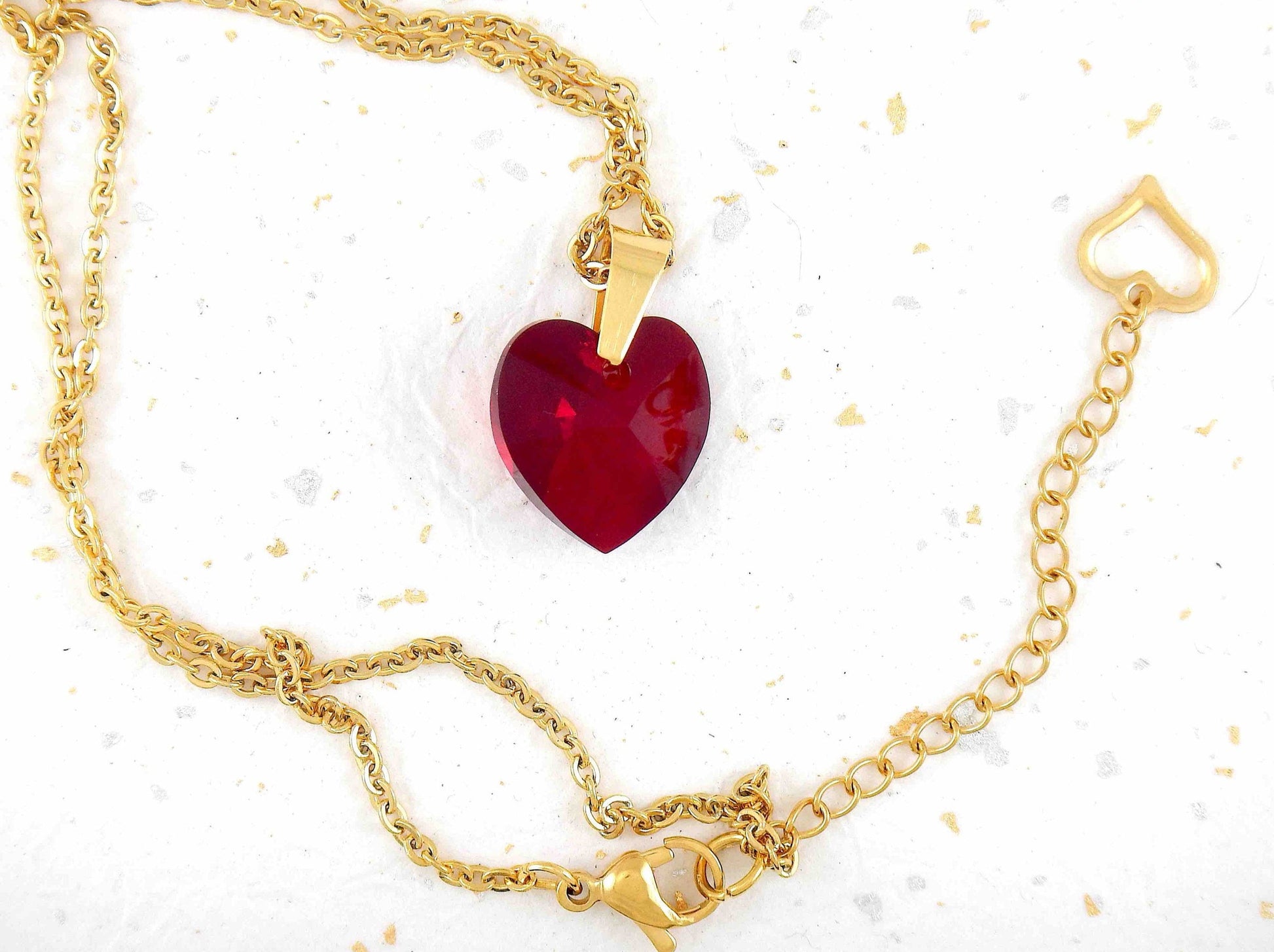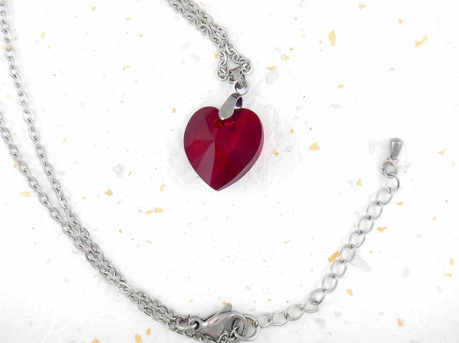 16-inch necklace with 20mm deep red faceted crystal heart pendant, regular or gold-toned stainless steel chain