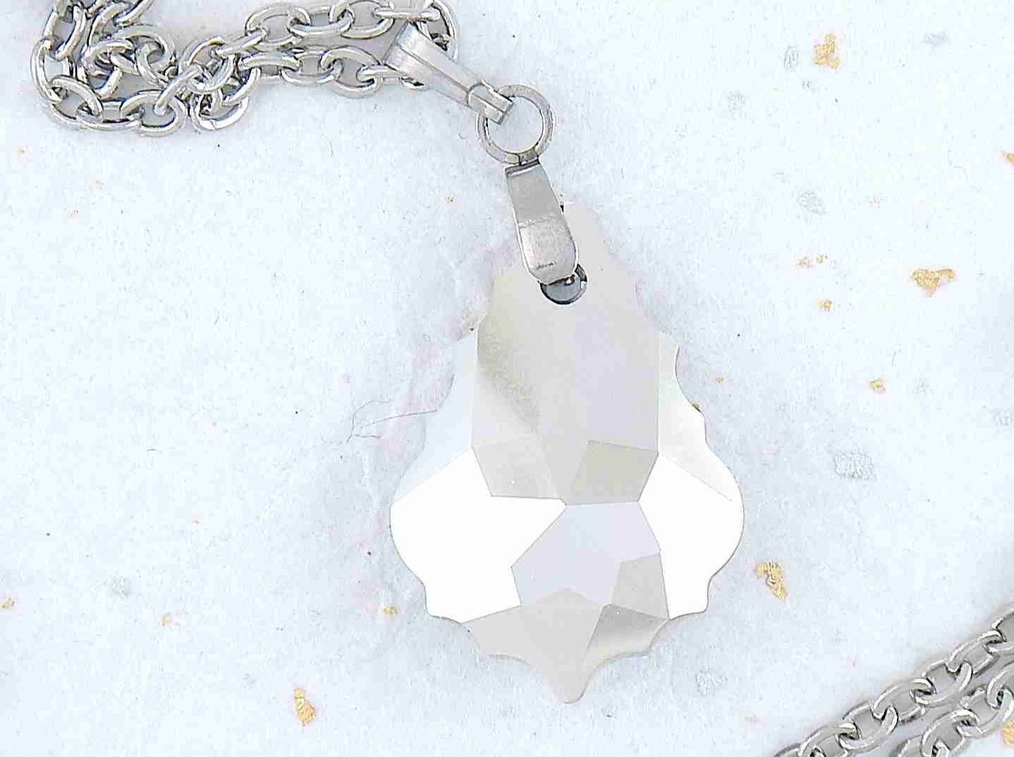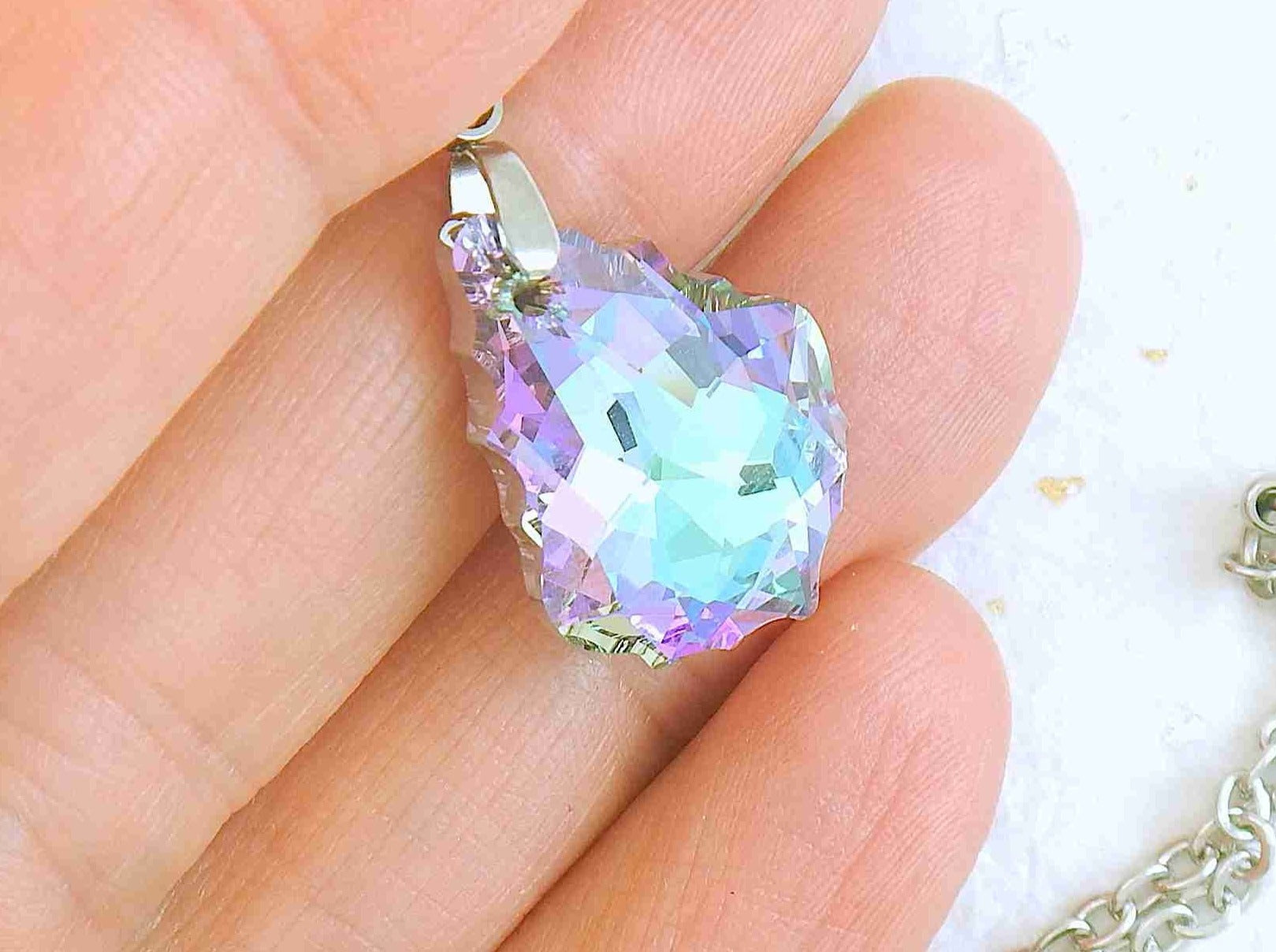 16-inch necklace with 22mm Vitrail Light (blue, turquoise, lilac) baroque Swarovski crystal pendant, stainless steel chain