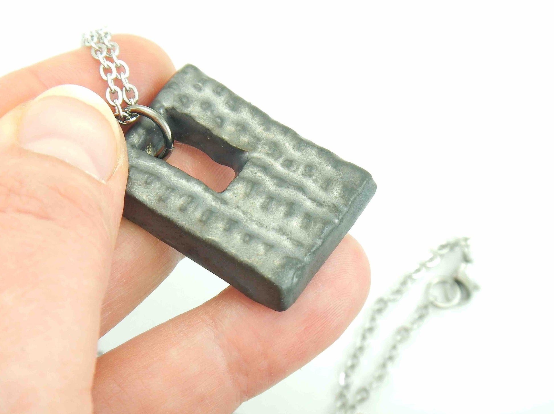 16-inch necklace with black nickel rectangular ceramics pendant handmade in Montreal, stainless steel chain