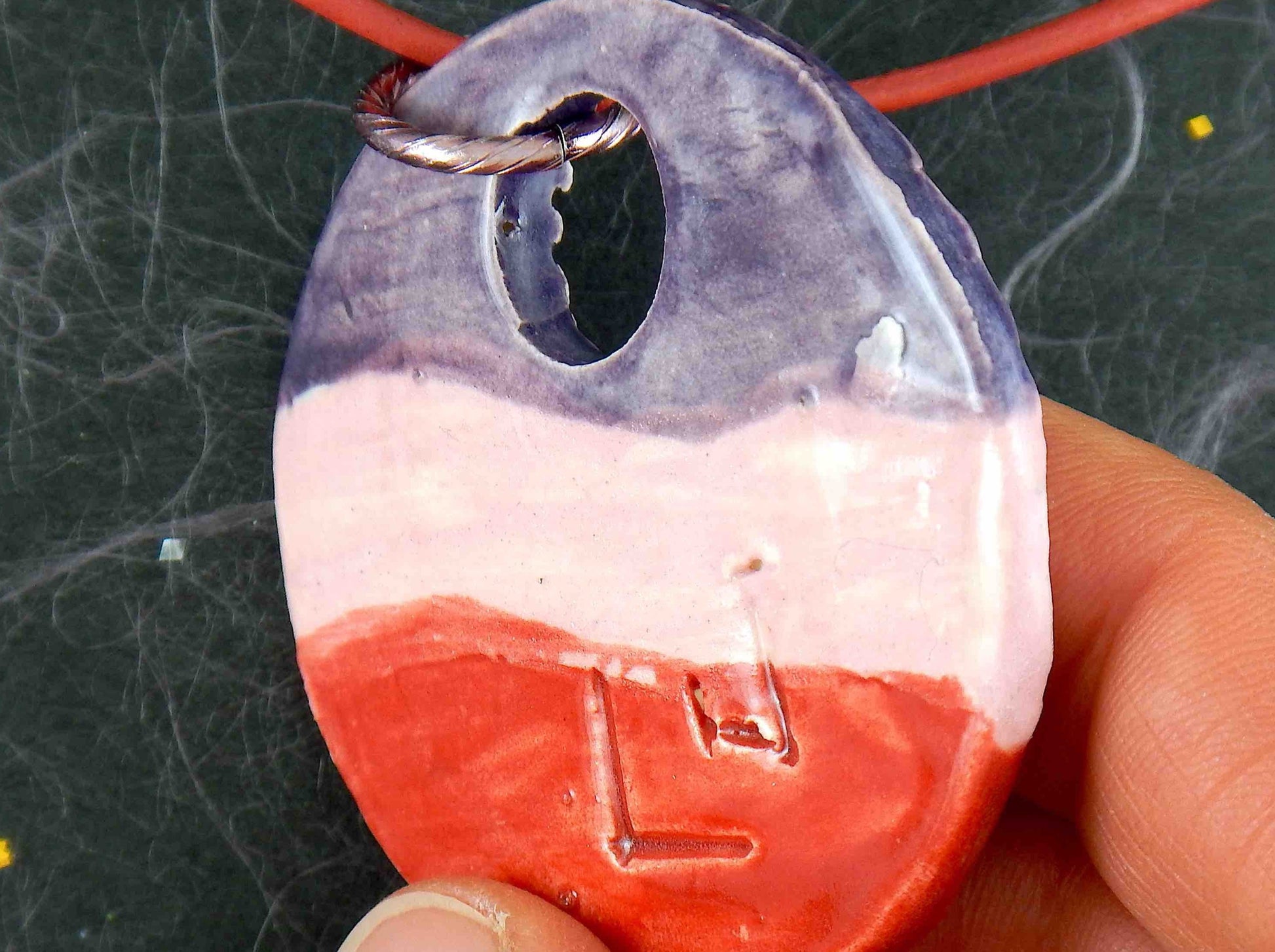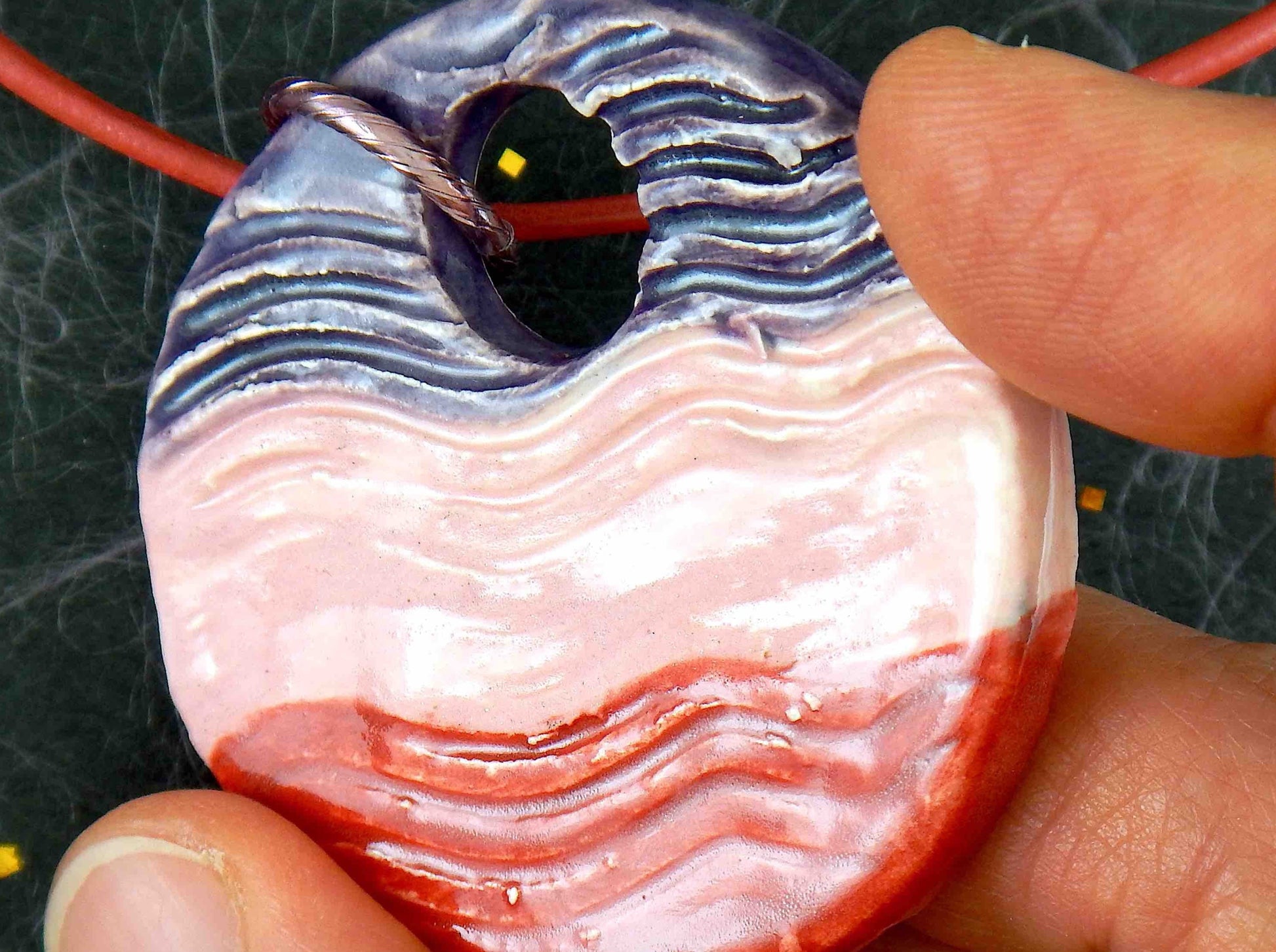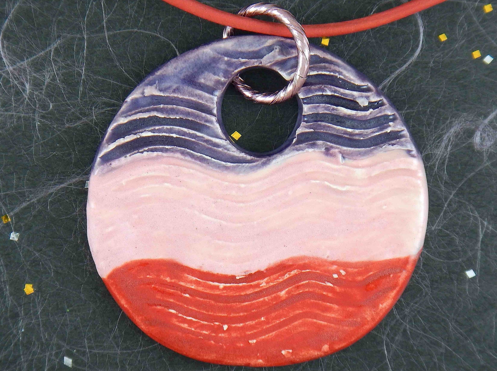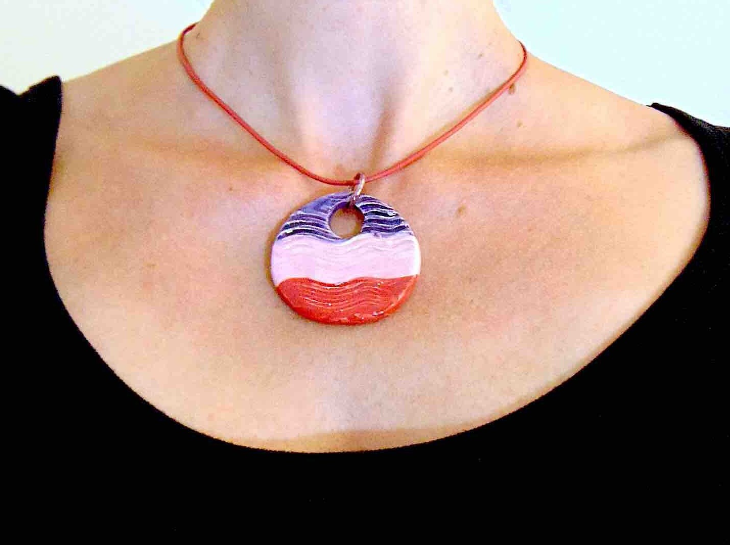 16-inch necklace with large round wavy ceramic pendant medallion handmade in Montreal in violet-pink-red, red leather cord, aluminum ring, stainless steel clasp