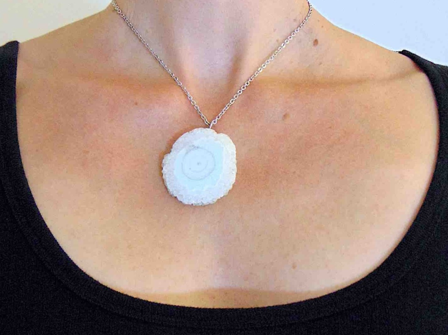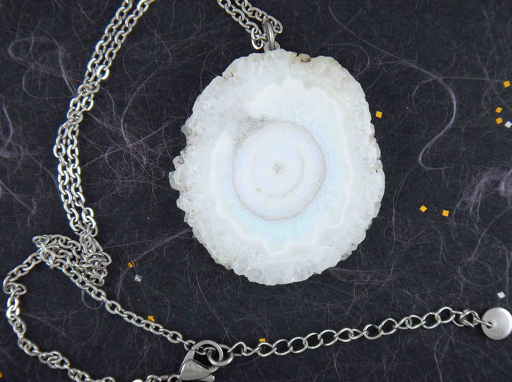 16-inch necklace with large solar quartz stone circular pendant, white with a hint of blue, stainless steel chain