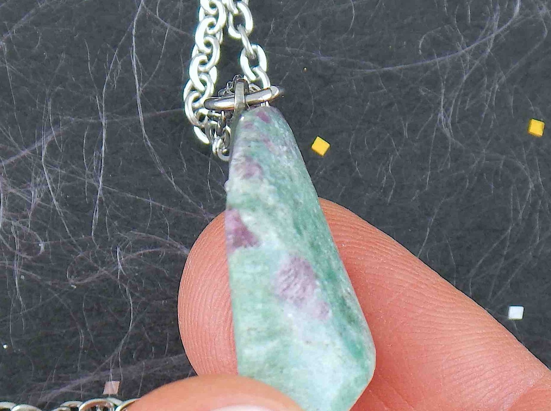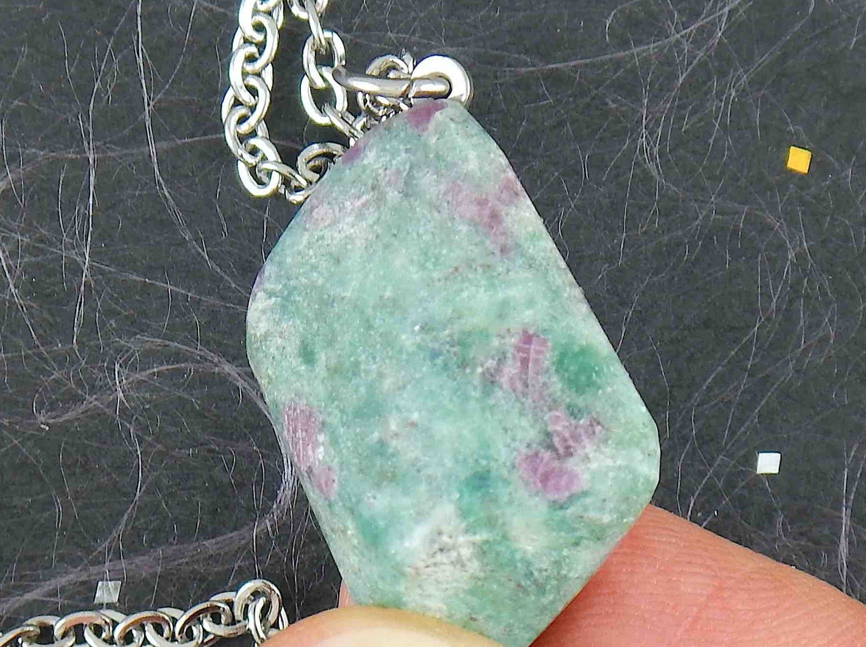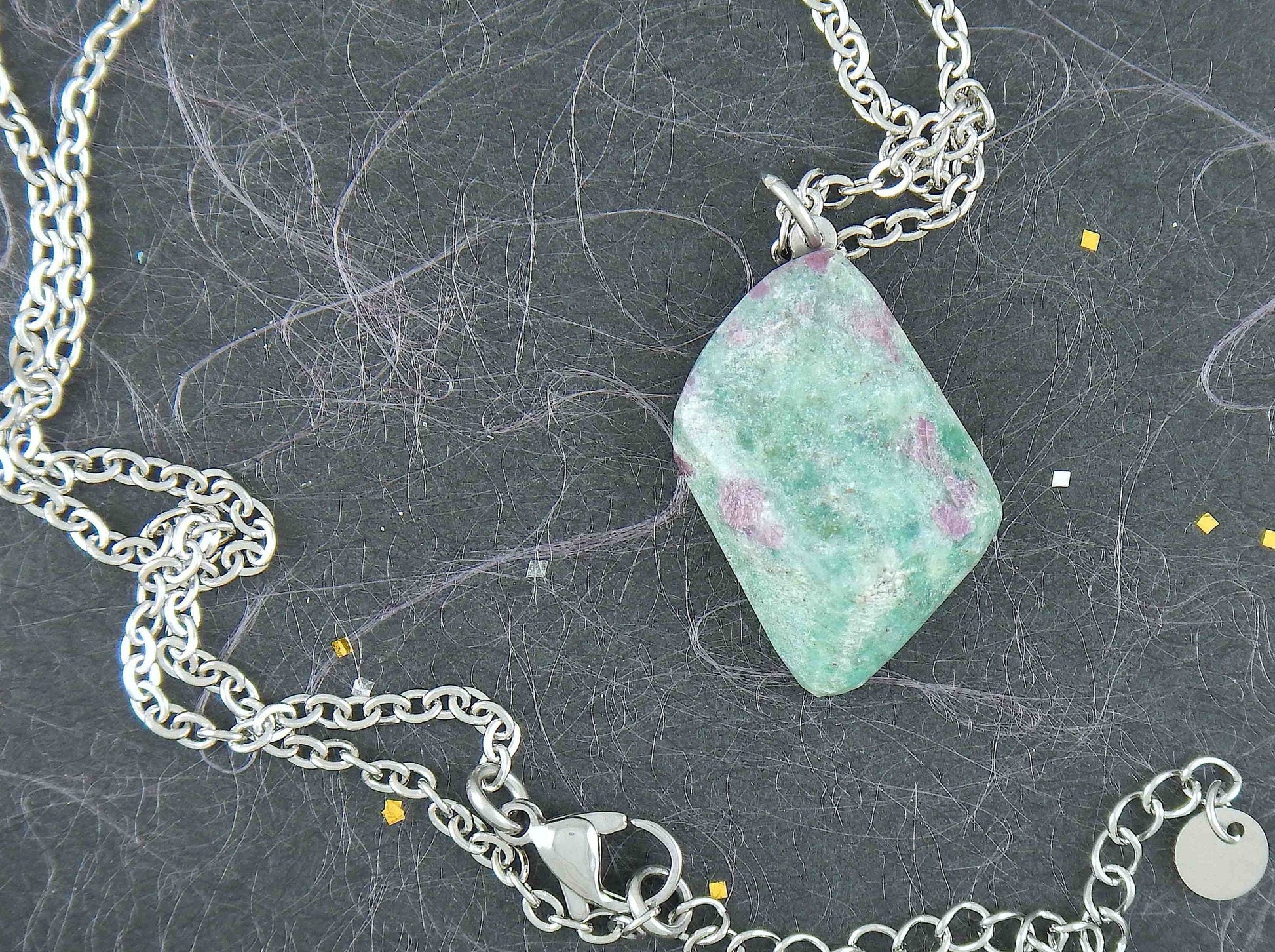 16-inch necklace with marbled emerald green fuchsite ruby stone lozenge pendant, purple inclusions, stainless steel chain