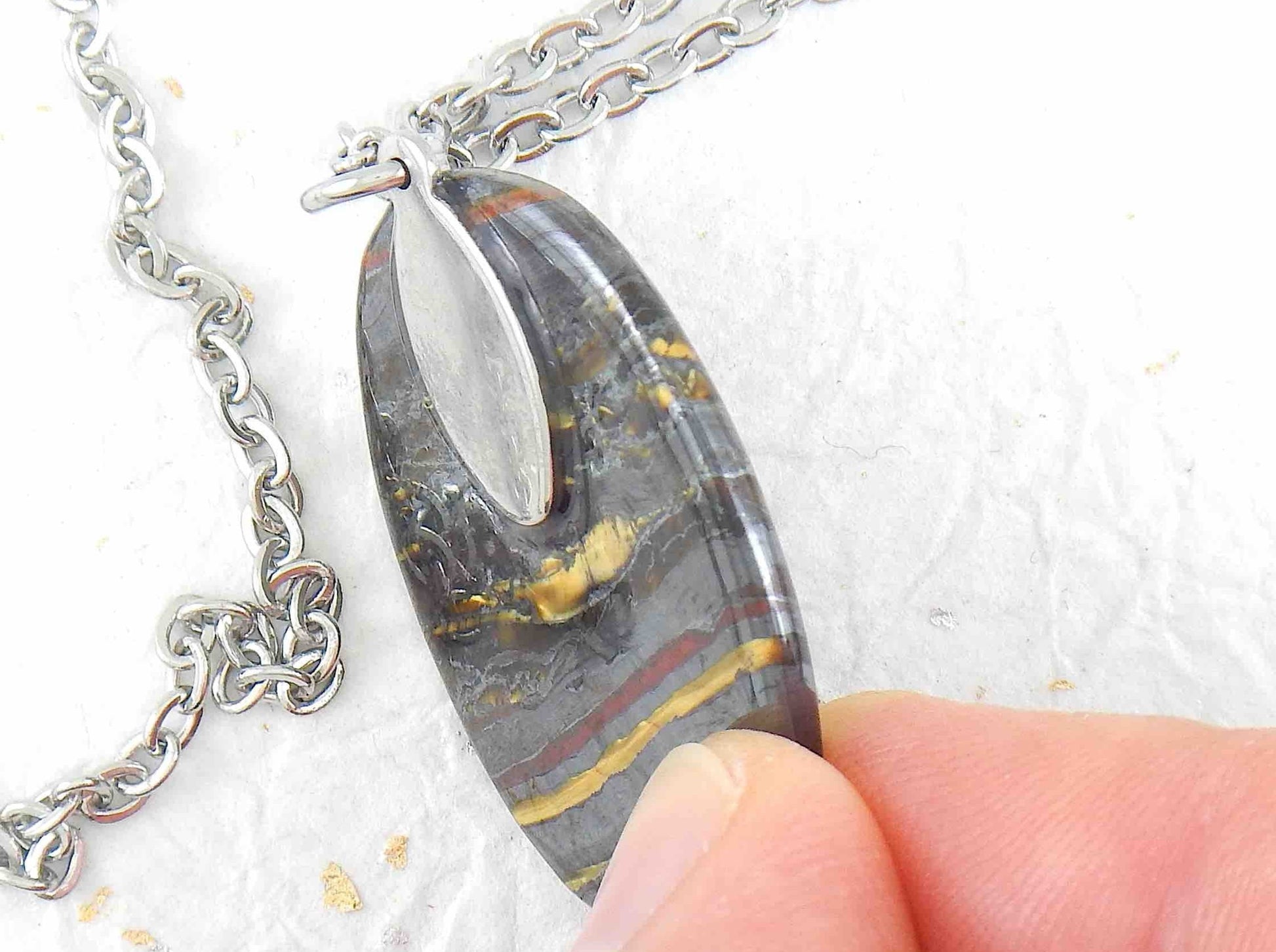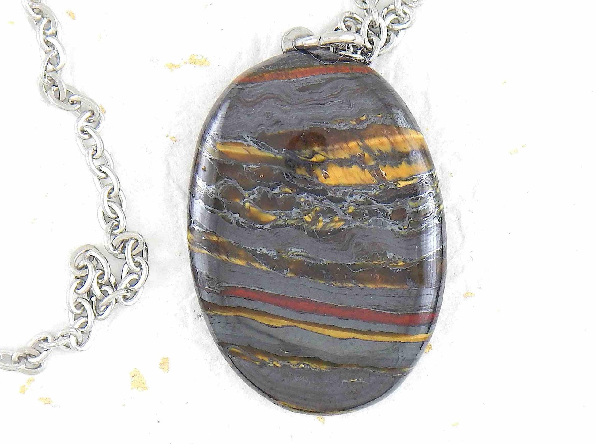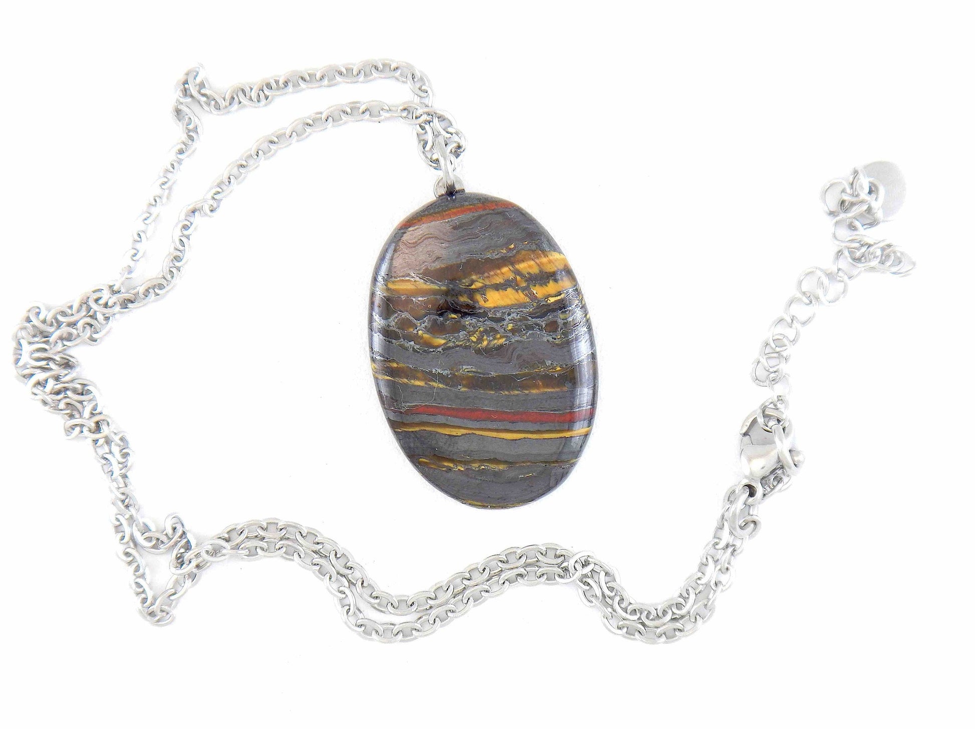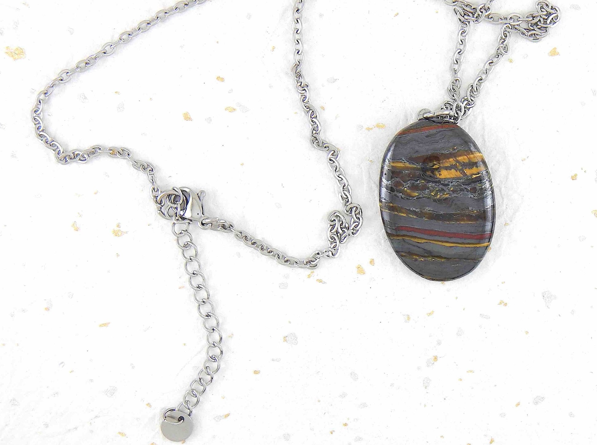 16-inch necklace with oval iron tiger stone pendant, gray-red-golden brown stripes, stainless steel chain