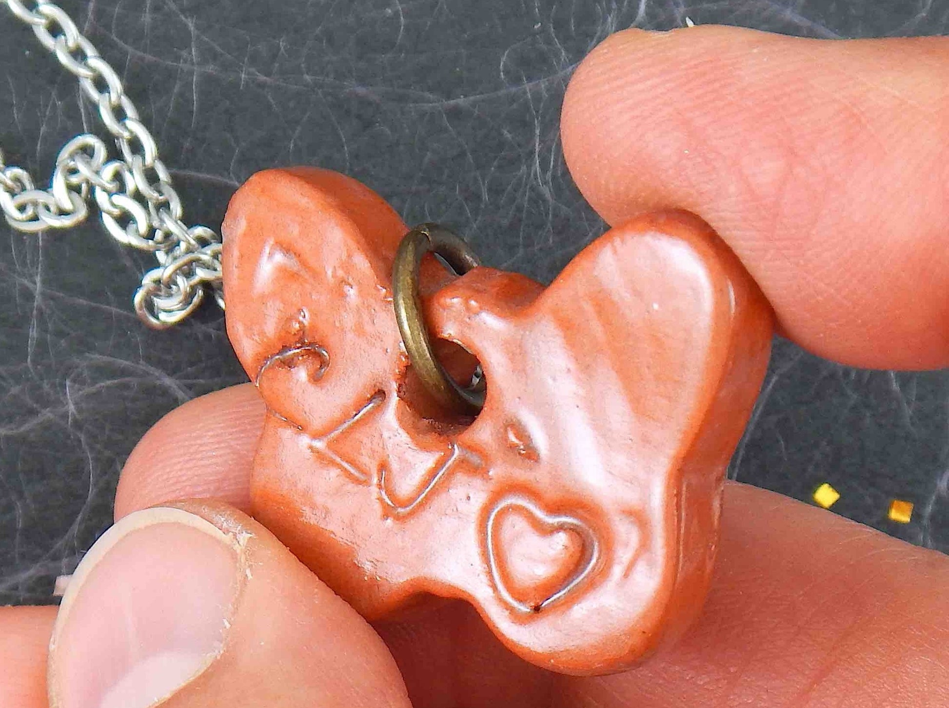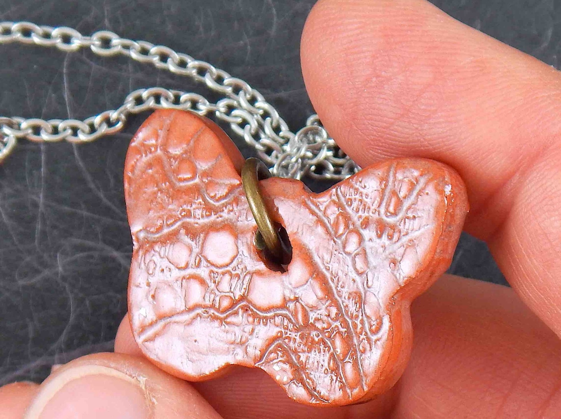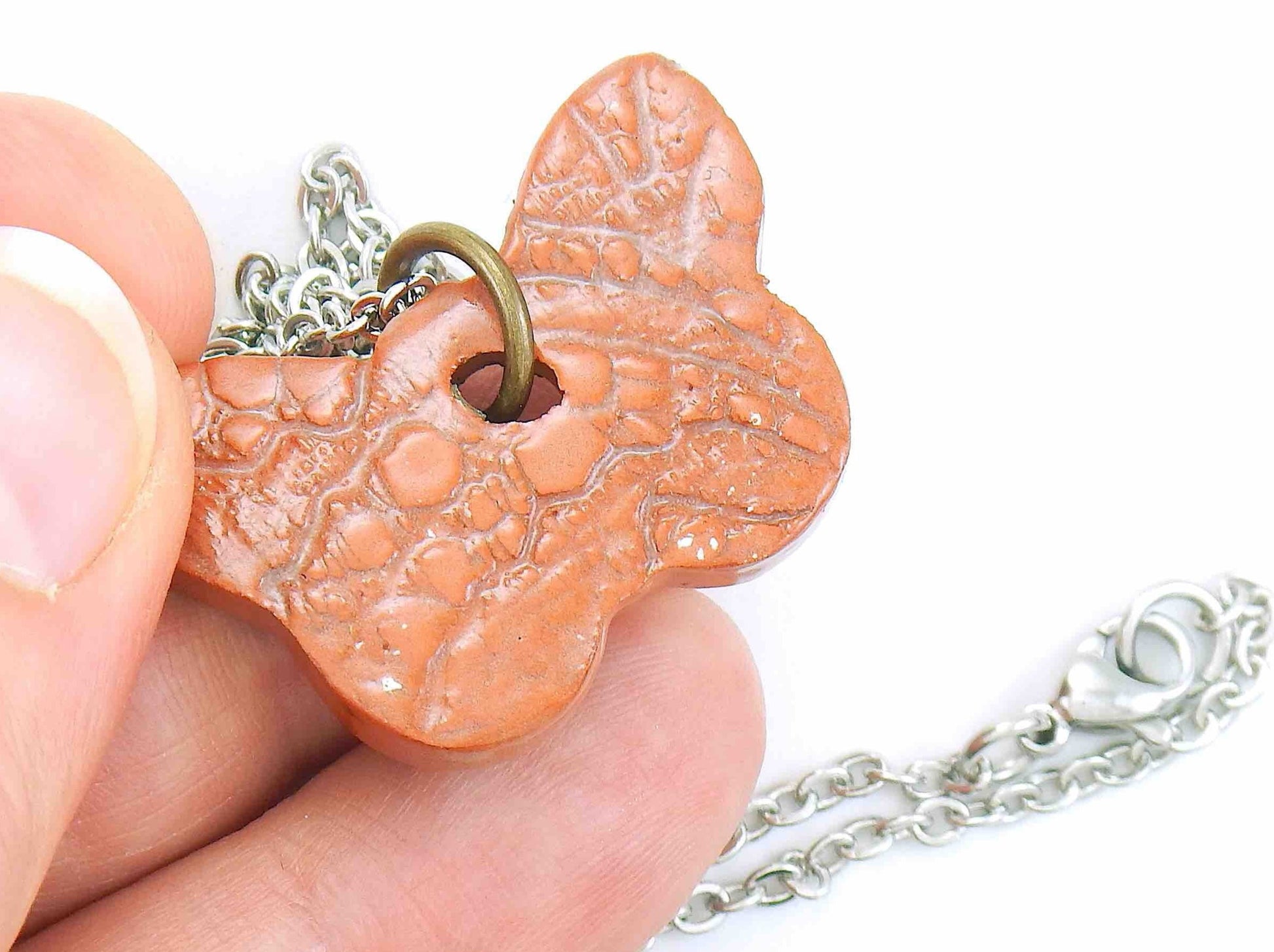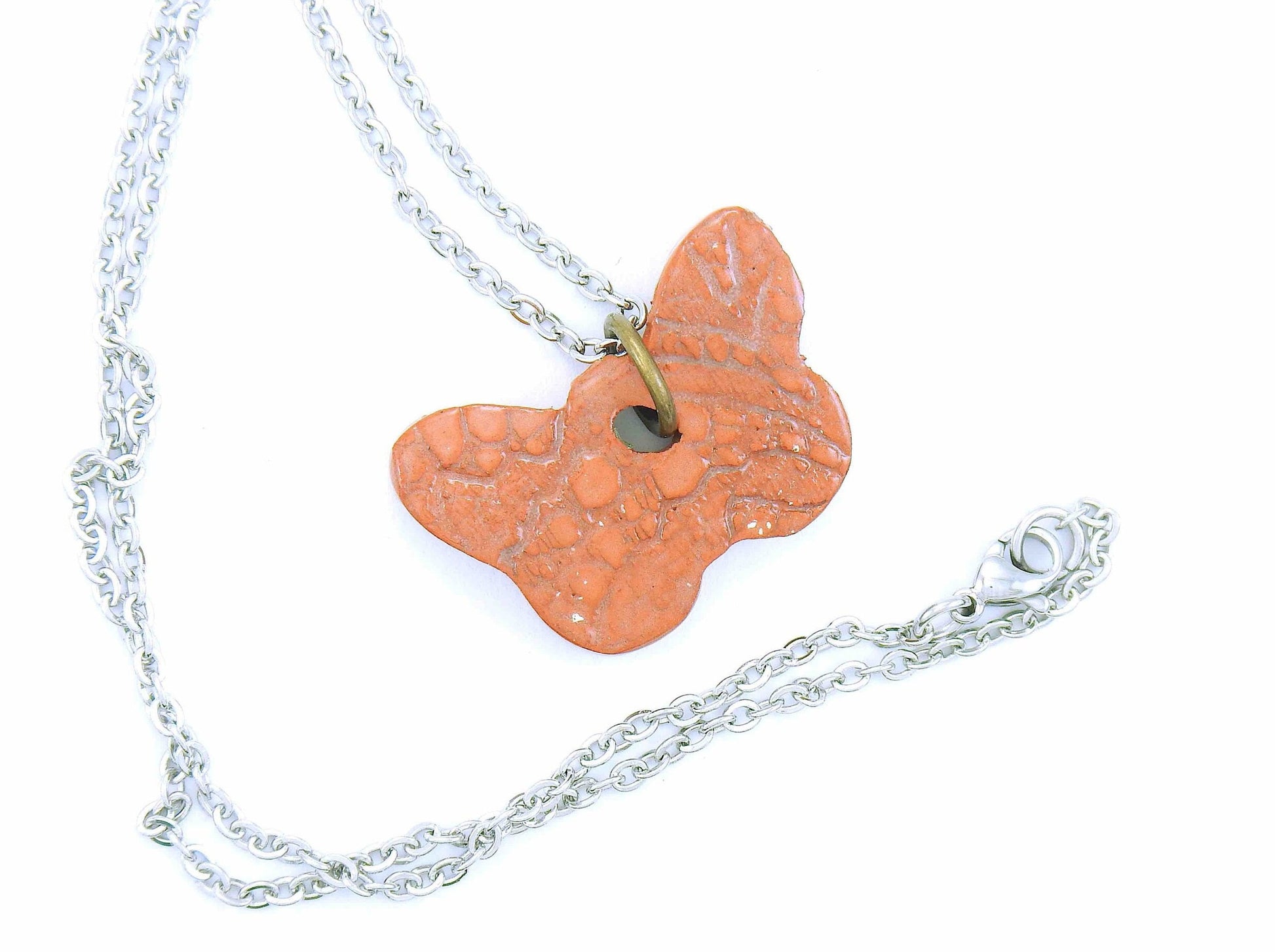 16-inch necklace with terra cotta butterfly ceramic pendant handmade in Montreal, lace pattern, stainless steel chain