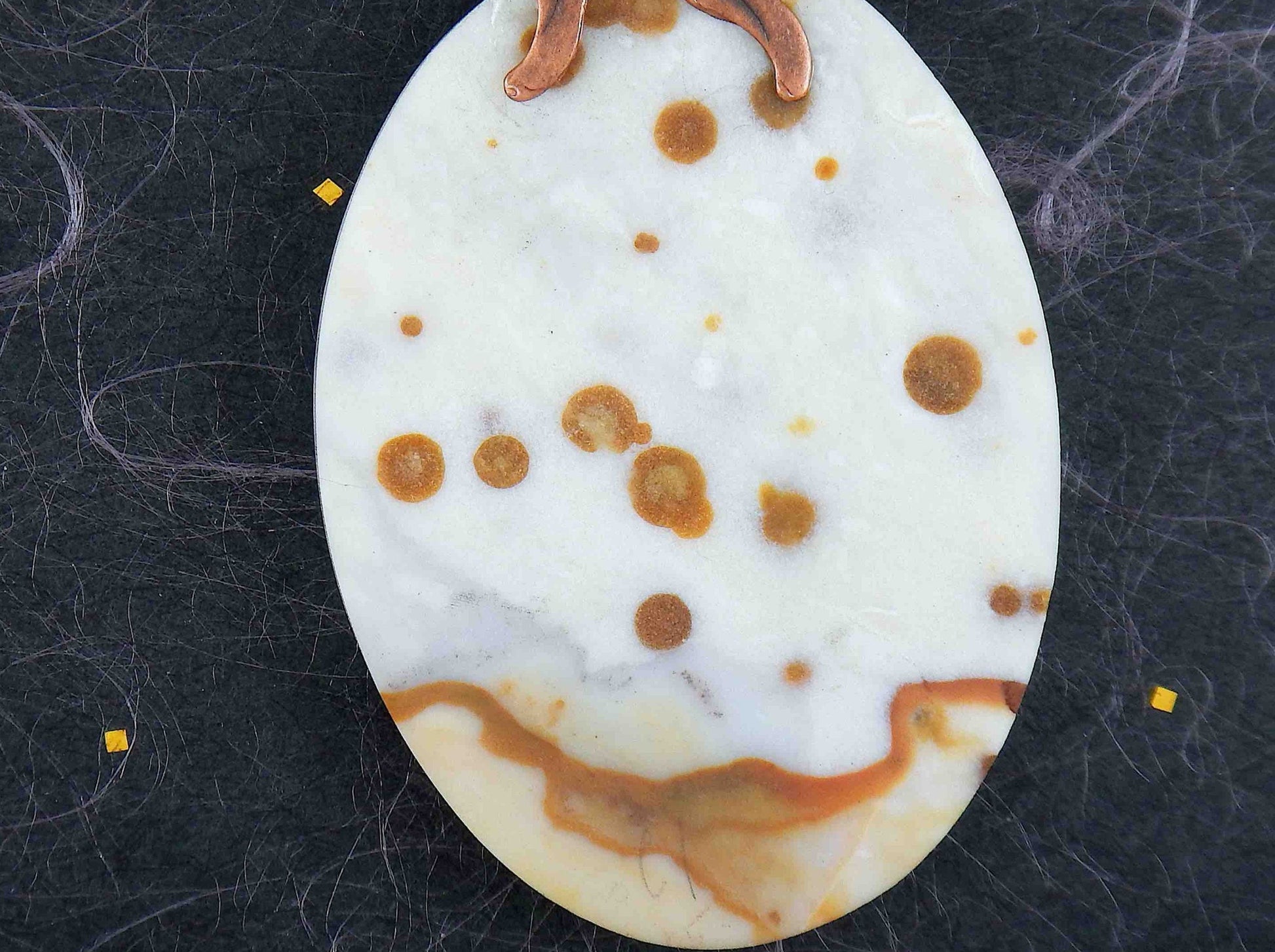 17-inch necklace with matte white and caramel jasper pendant on brown leather cord, antique glass cylinder beads, copper clasp