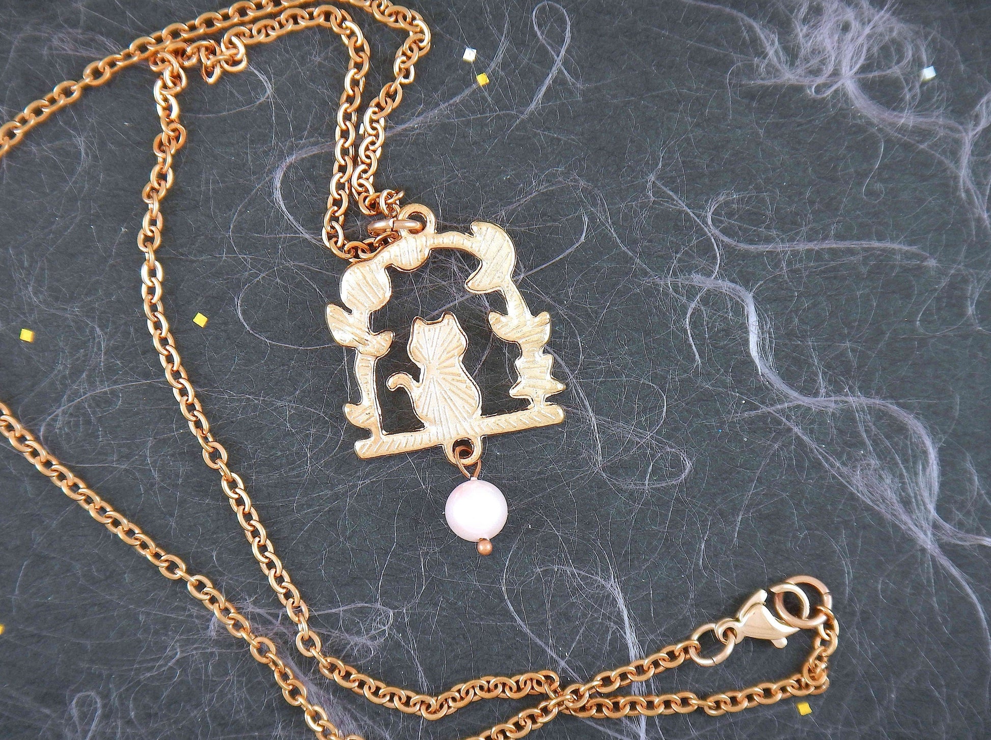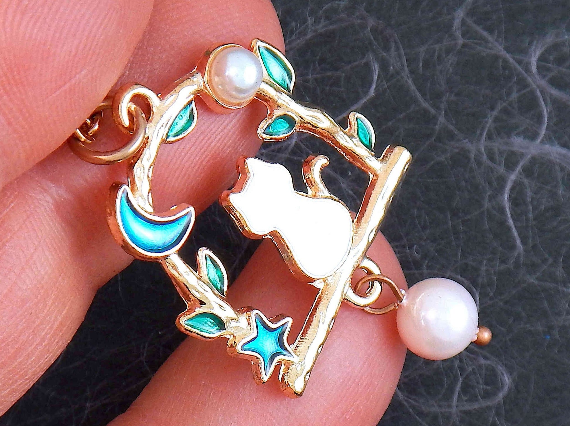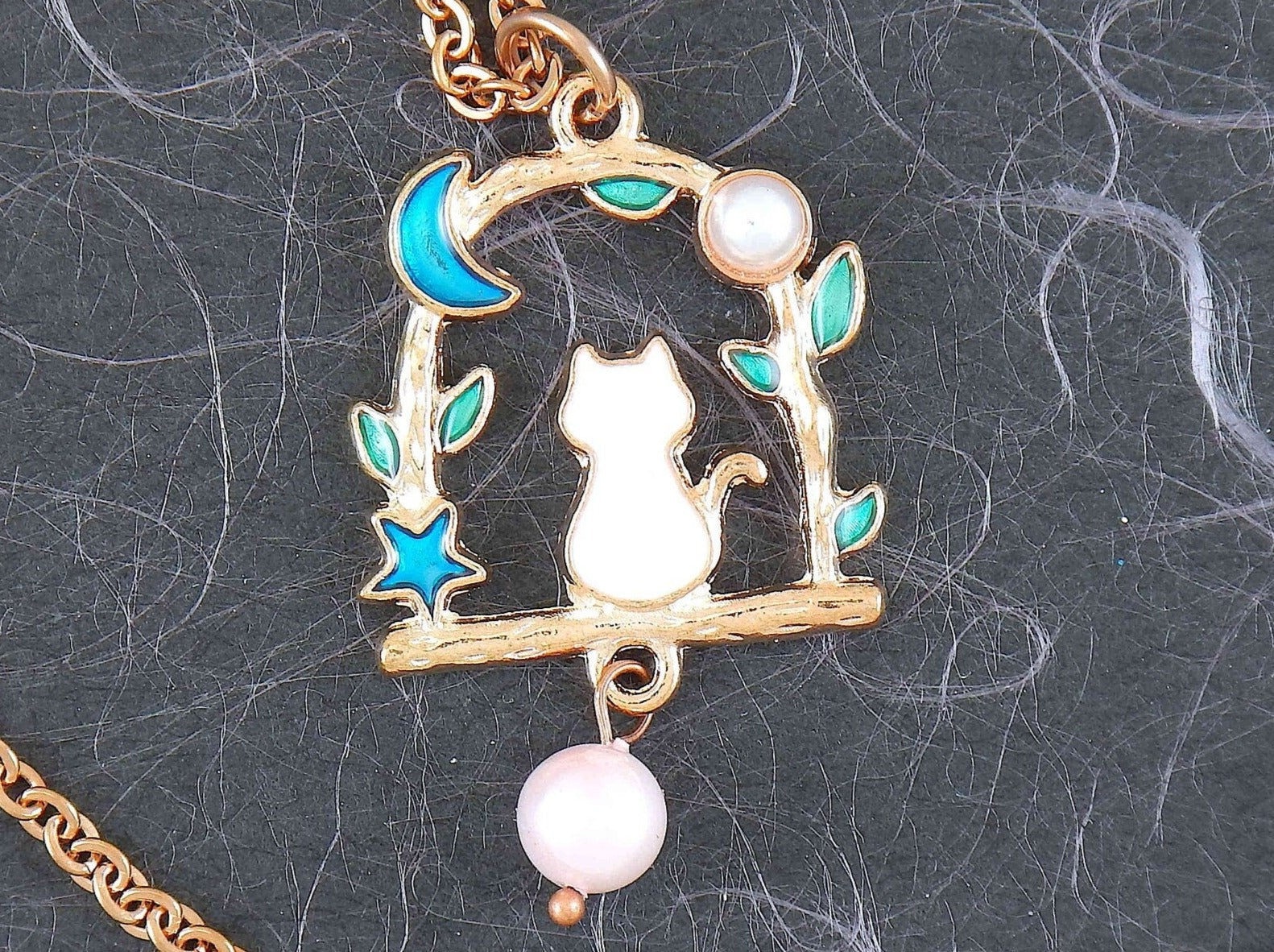 17-inch necklace with tiny enamelled white cat sitting on a branch, blue moon and star, pearl detail, rose gold-toned stainless steel chain