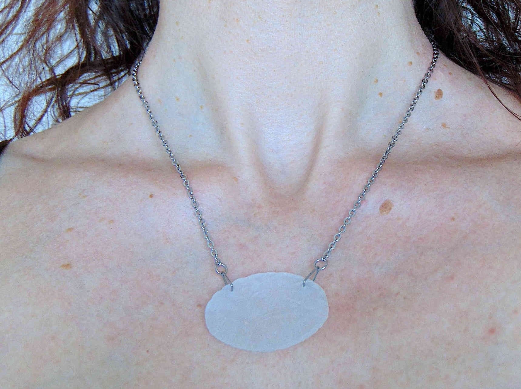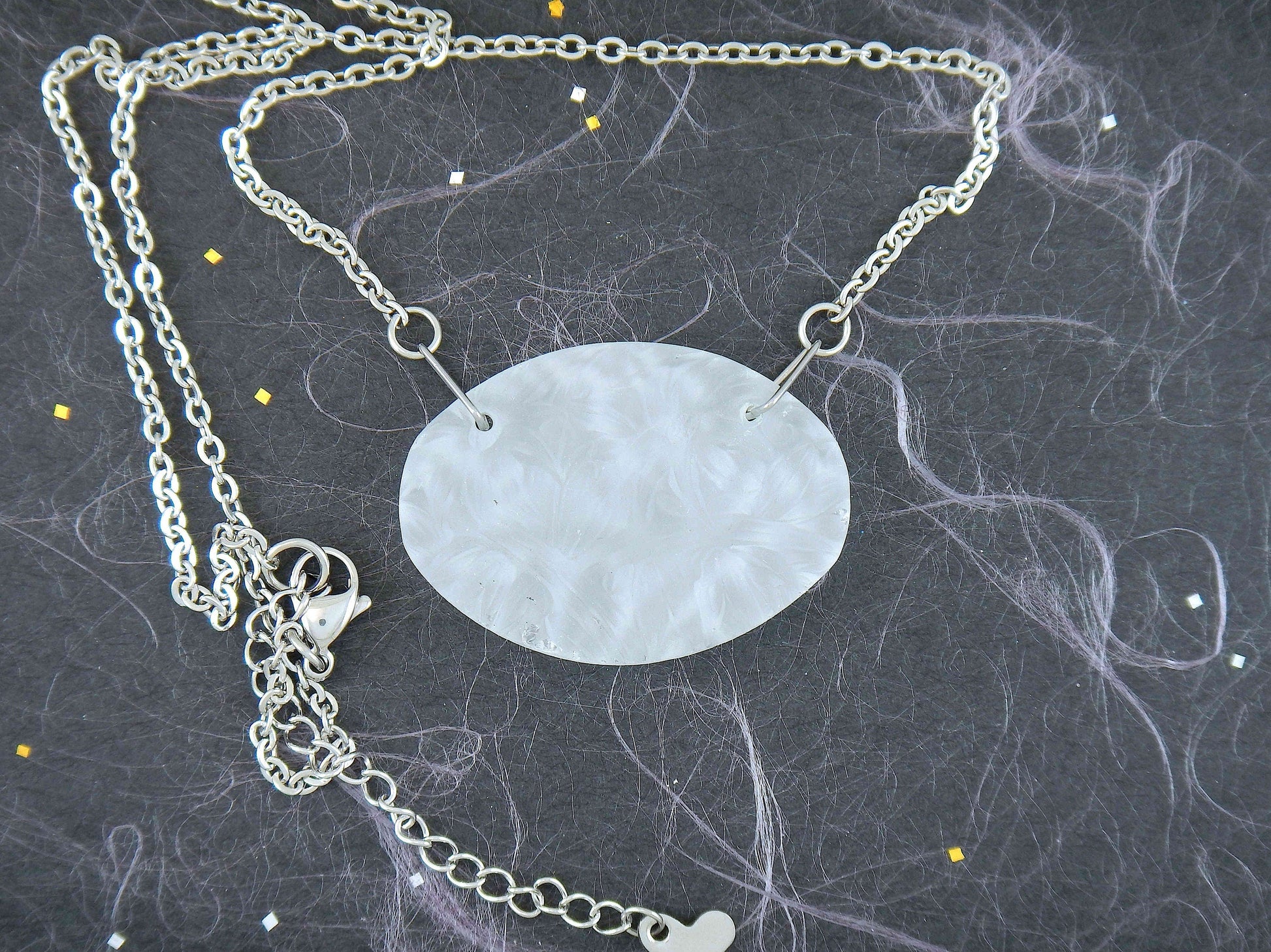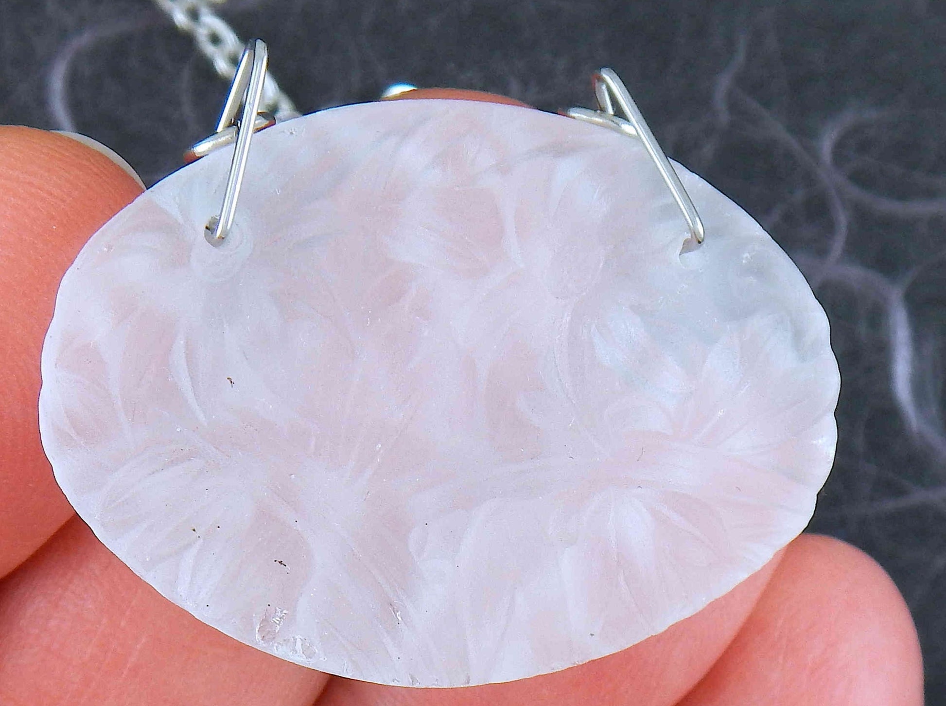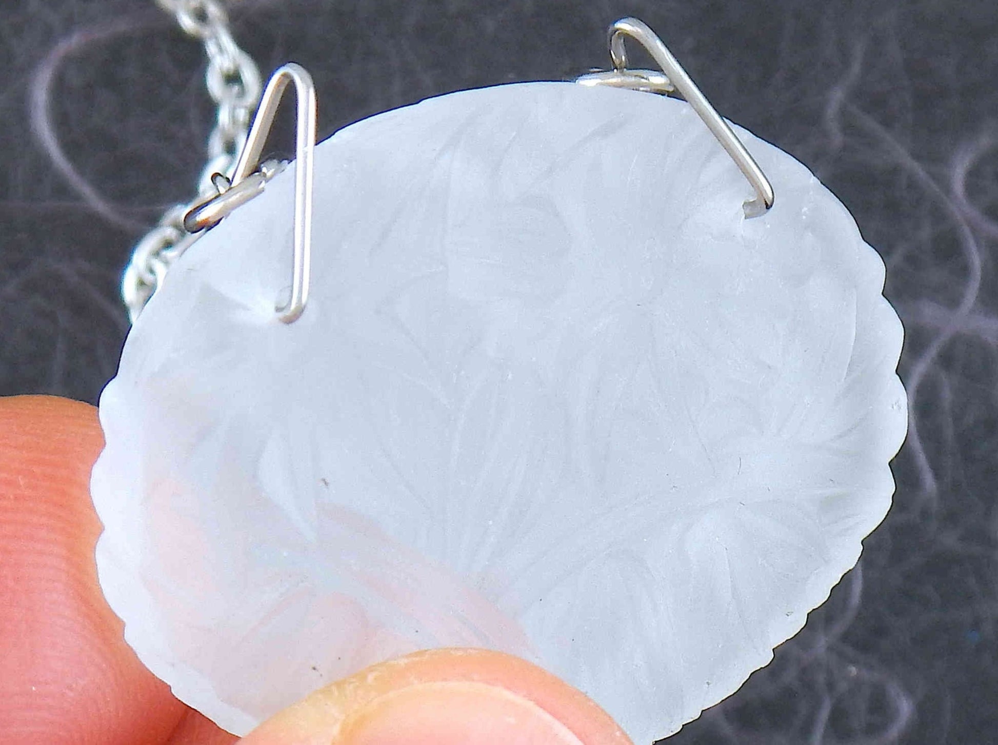 18-inch necklace with large oval matte vintage crystal pendant, sculpted on both sides (Lalique-style flower and leaf pattern), stainless steel chain