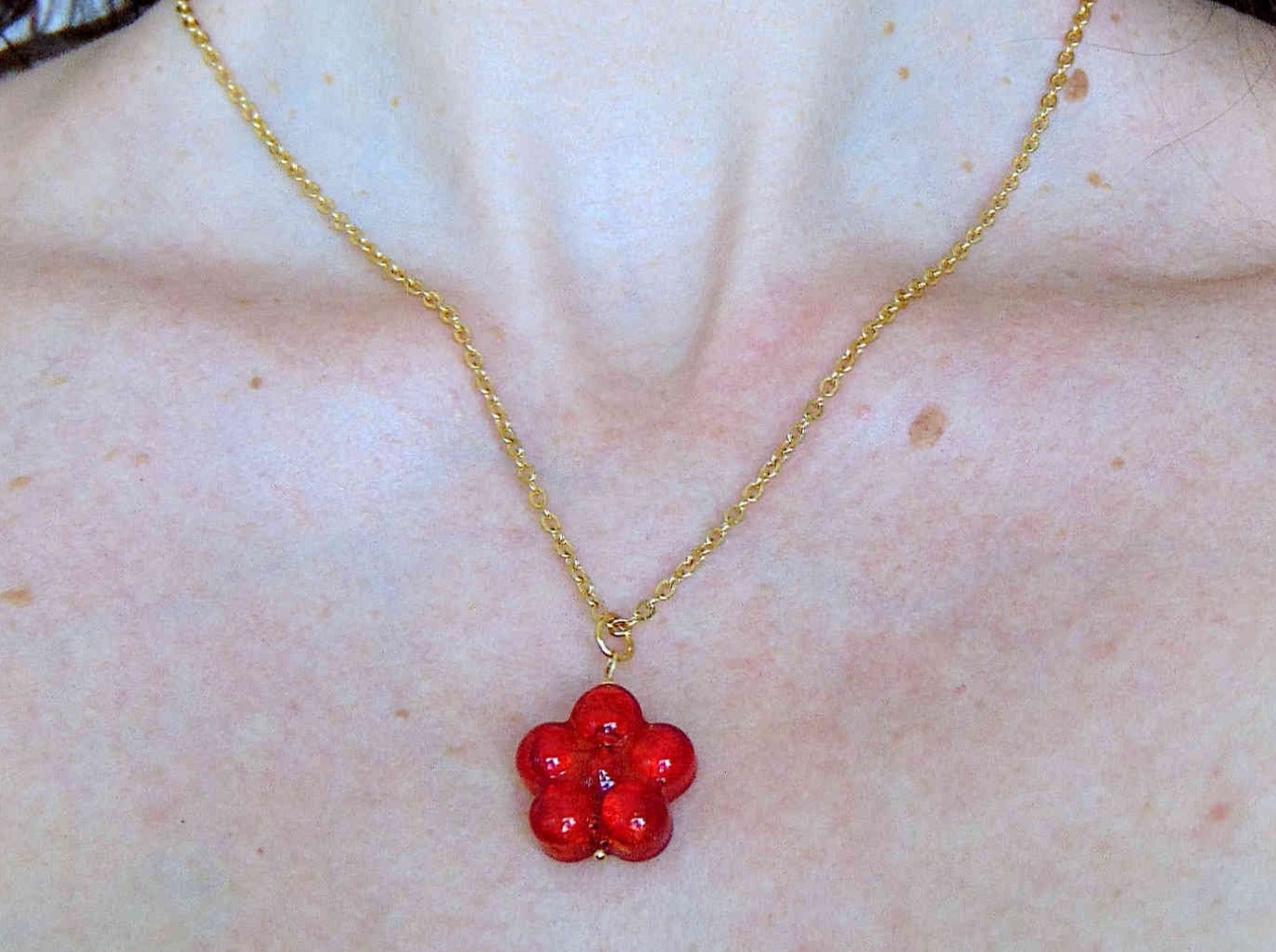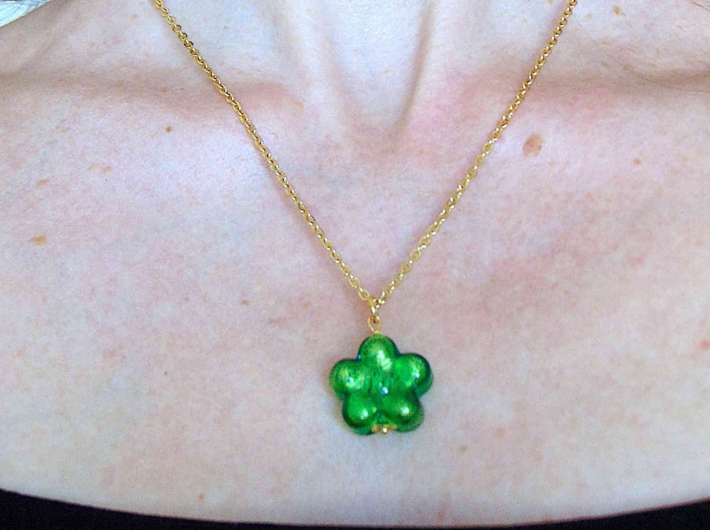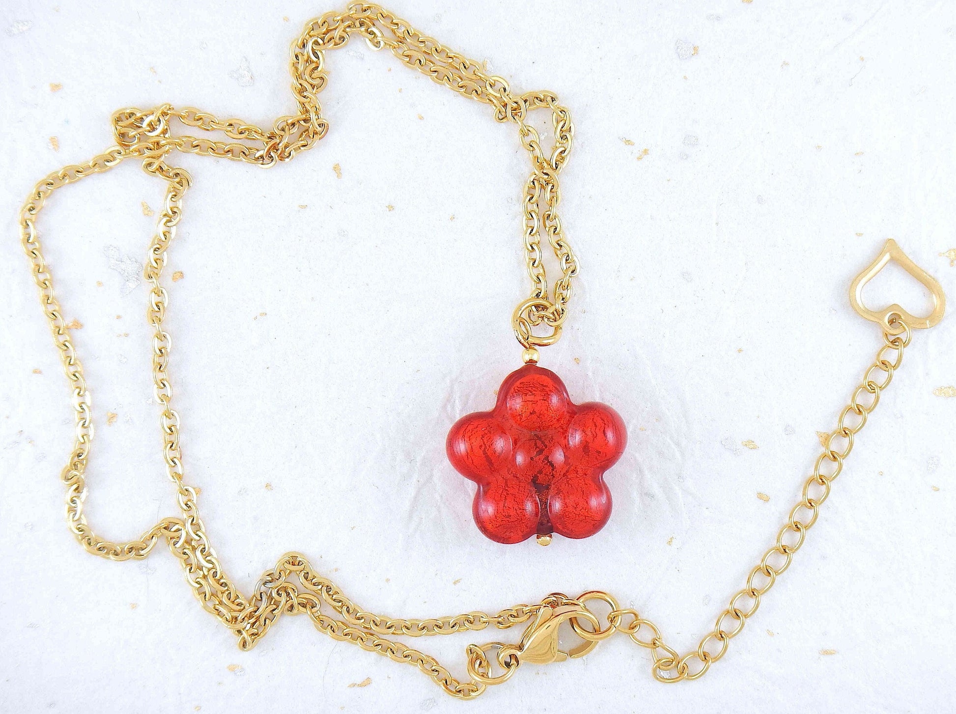 19-inch necklace with apple green, deep red or clear translucent Murano glass on gold foil, gold-toned stainless steel chain