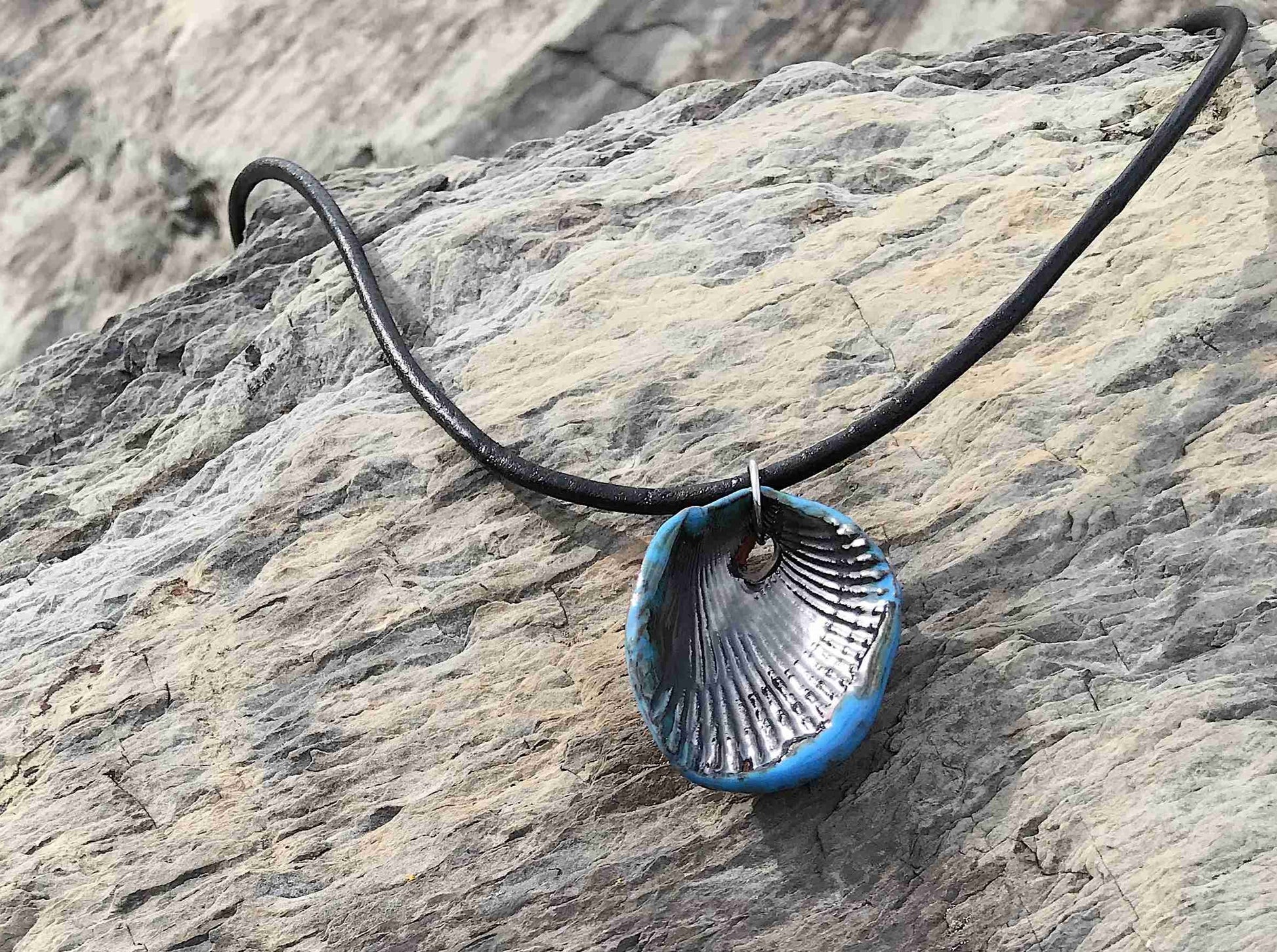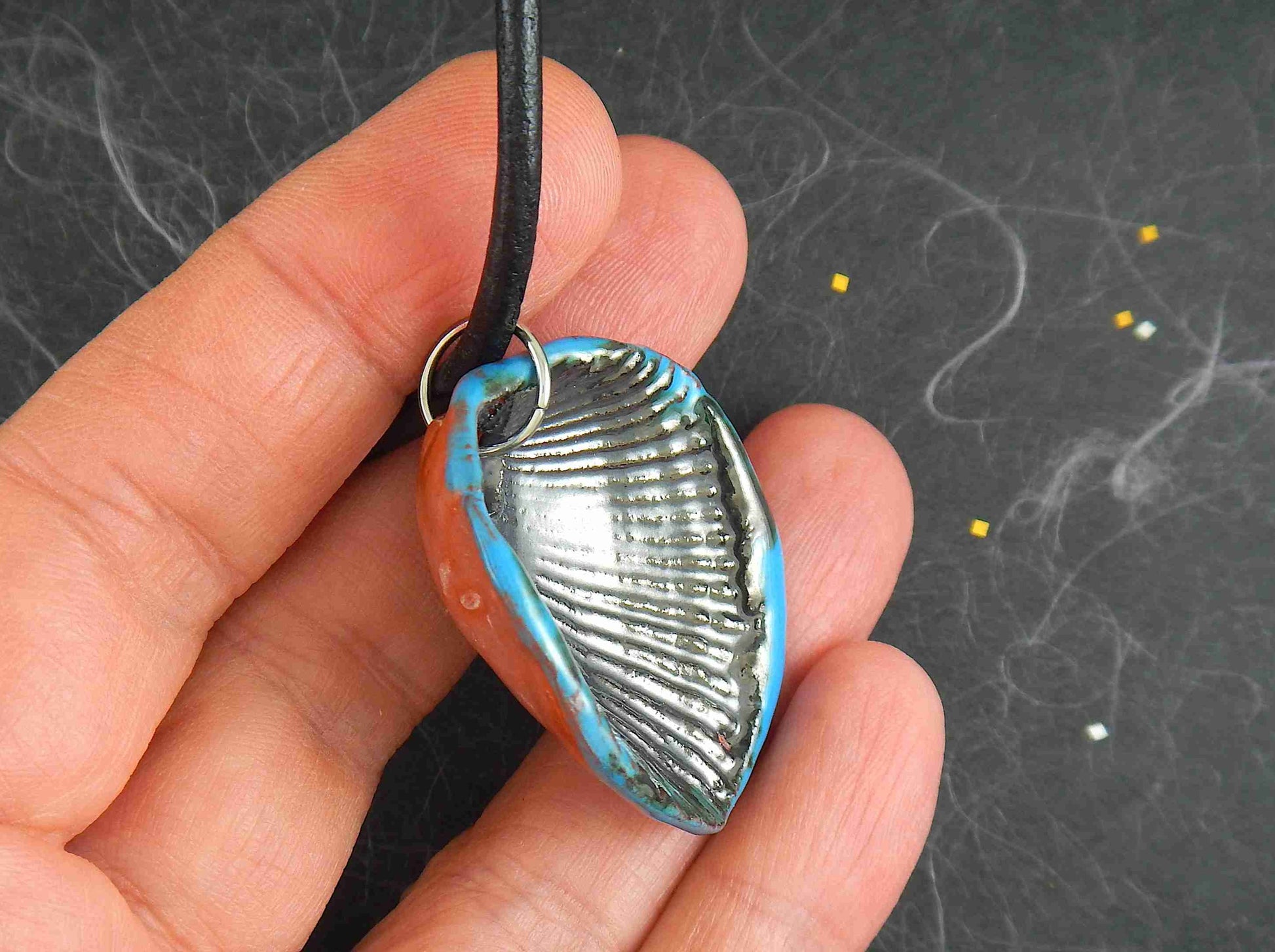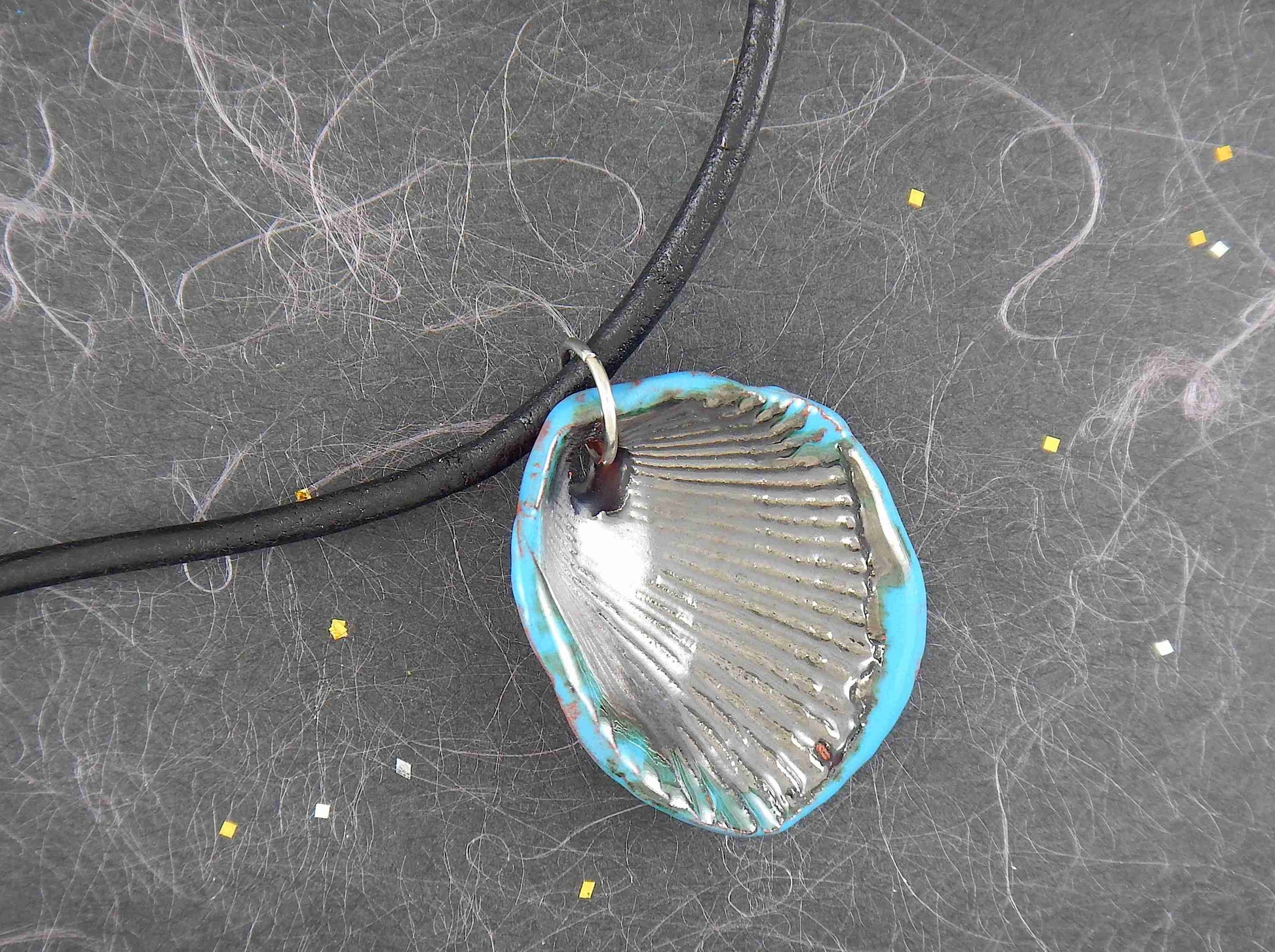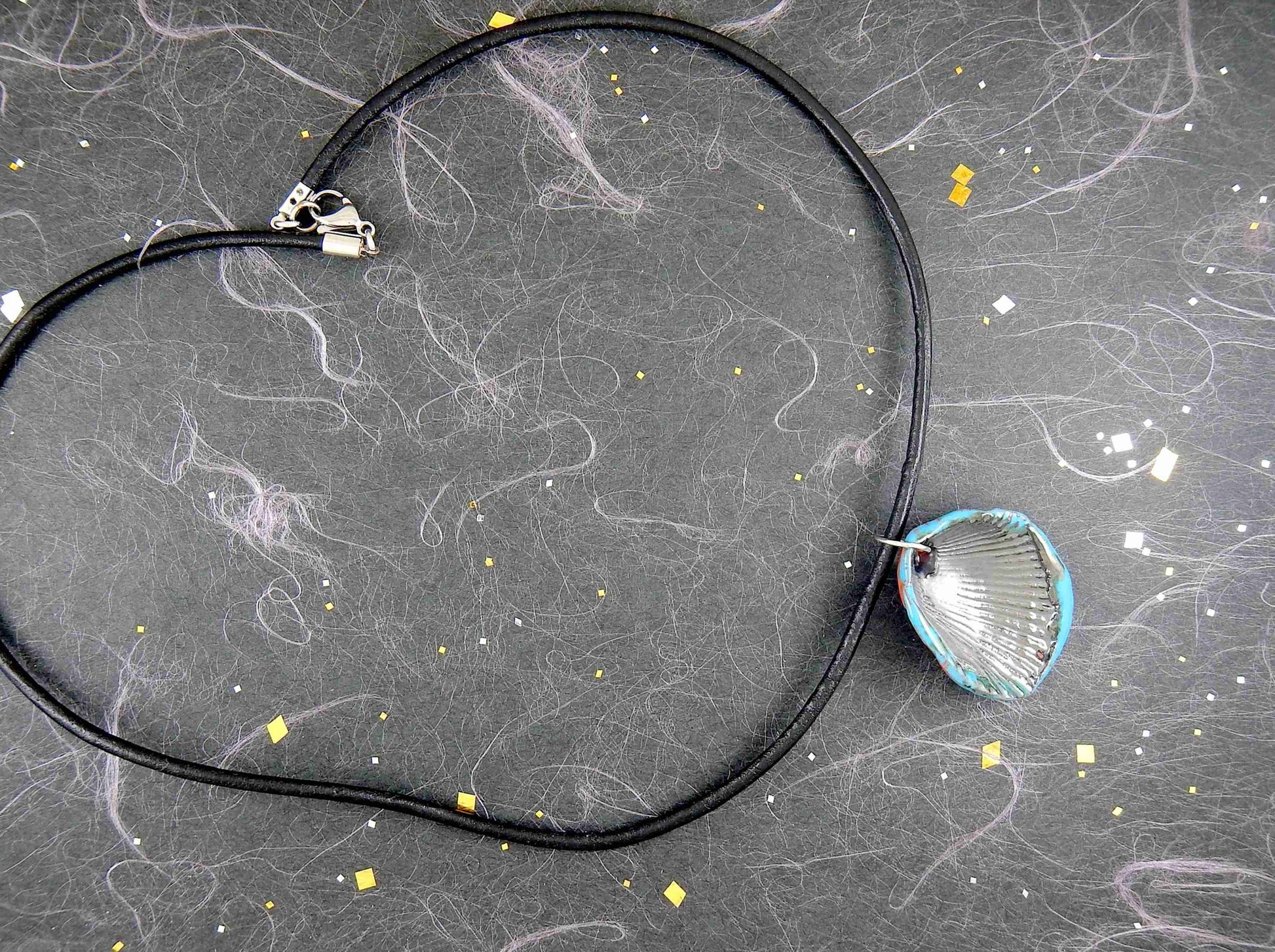 20-inch necklace with black nickel and turquoise shell pendant handmade in Montreal, black leather cord, stainless steel clasp