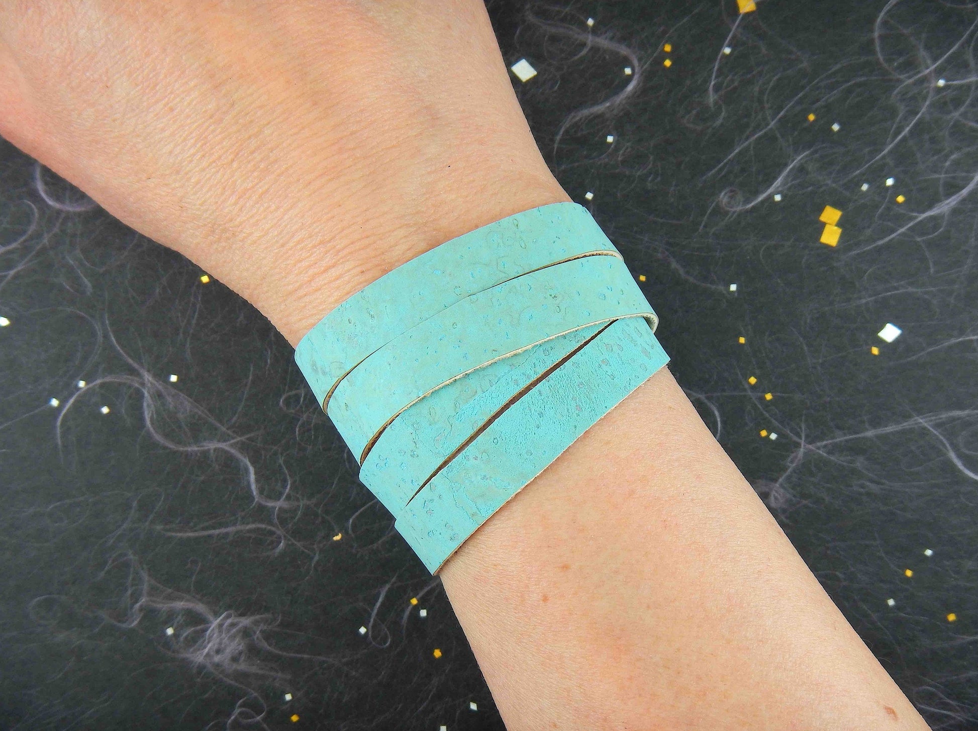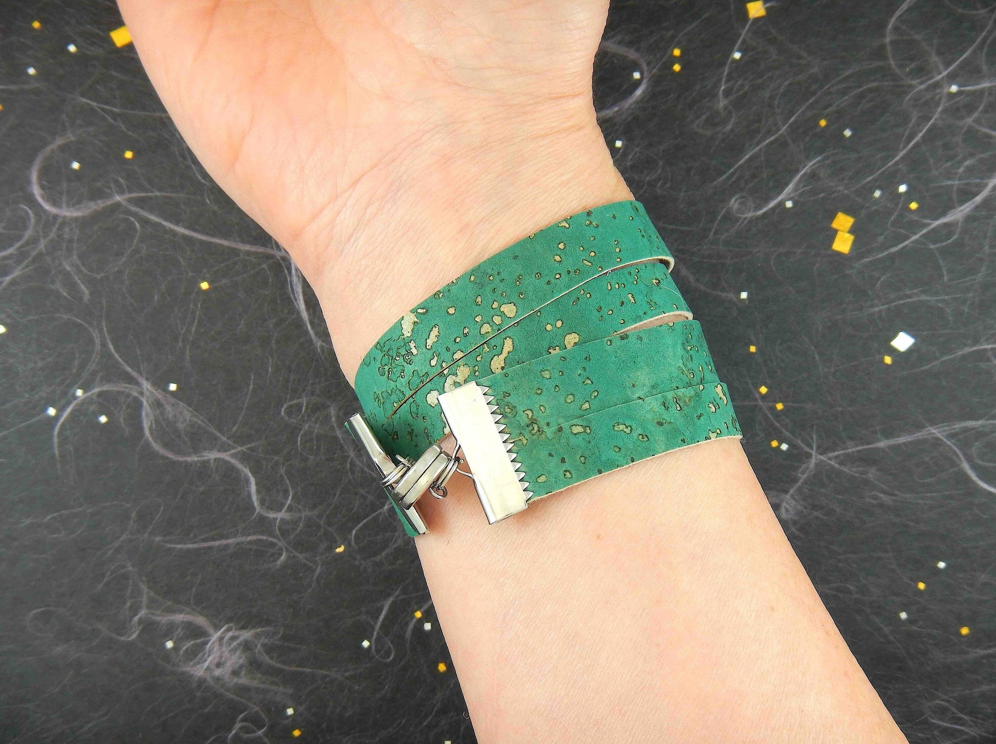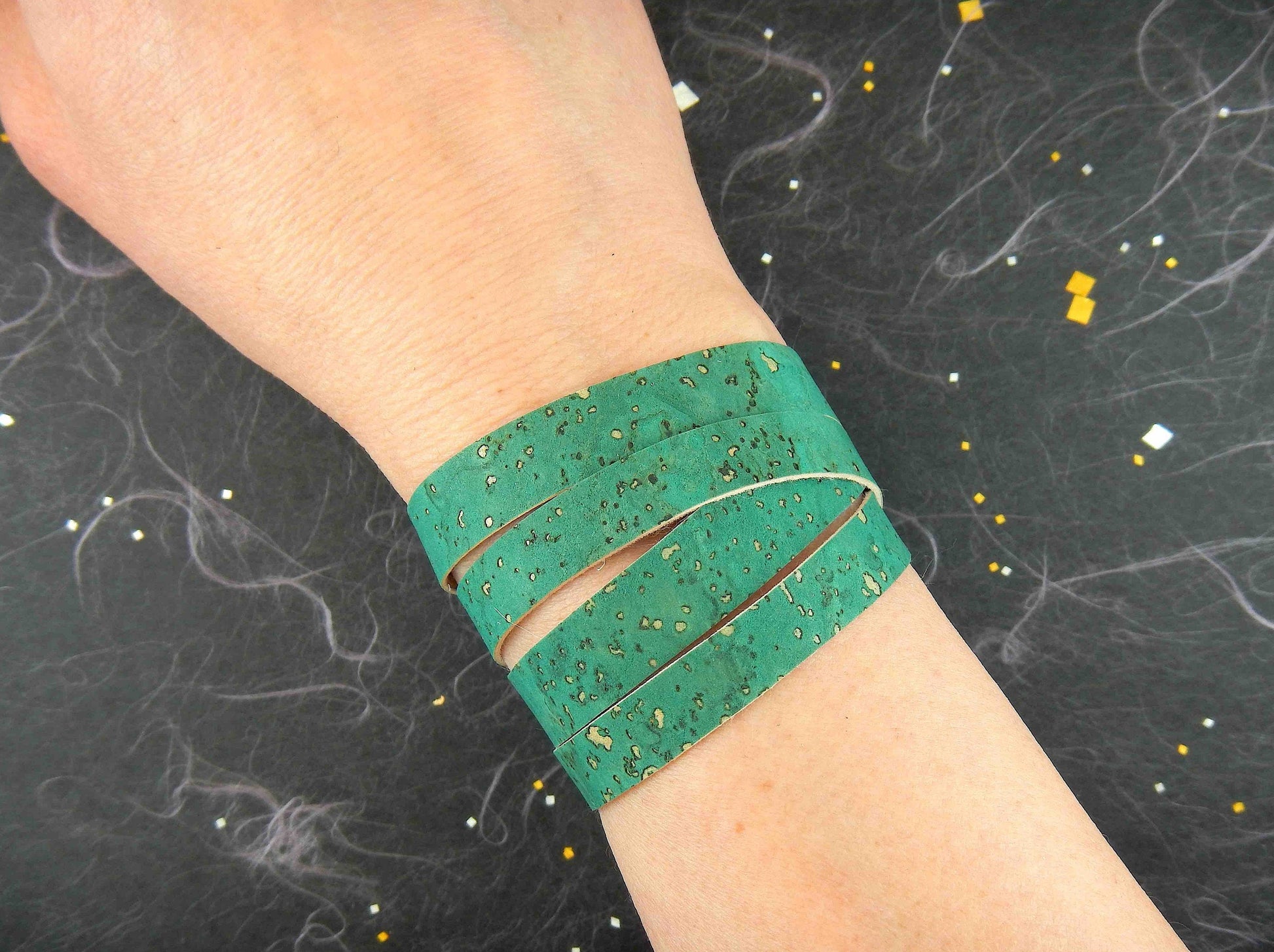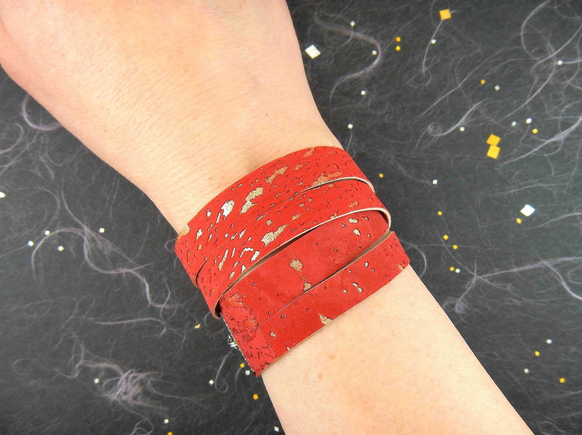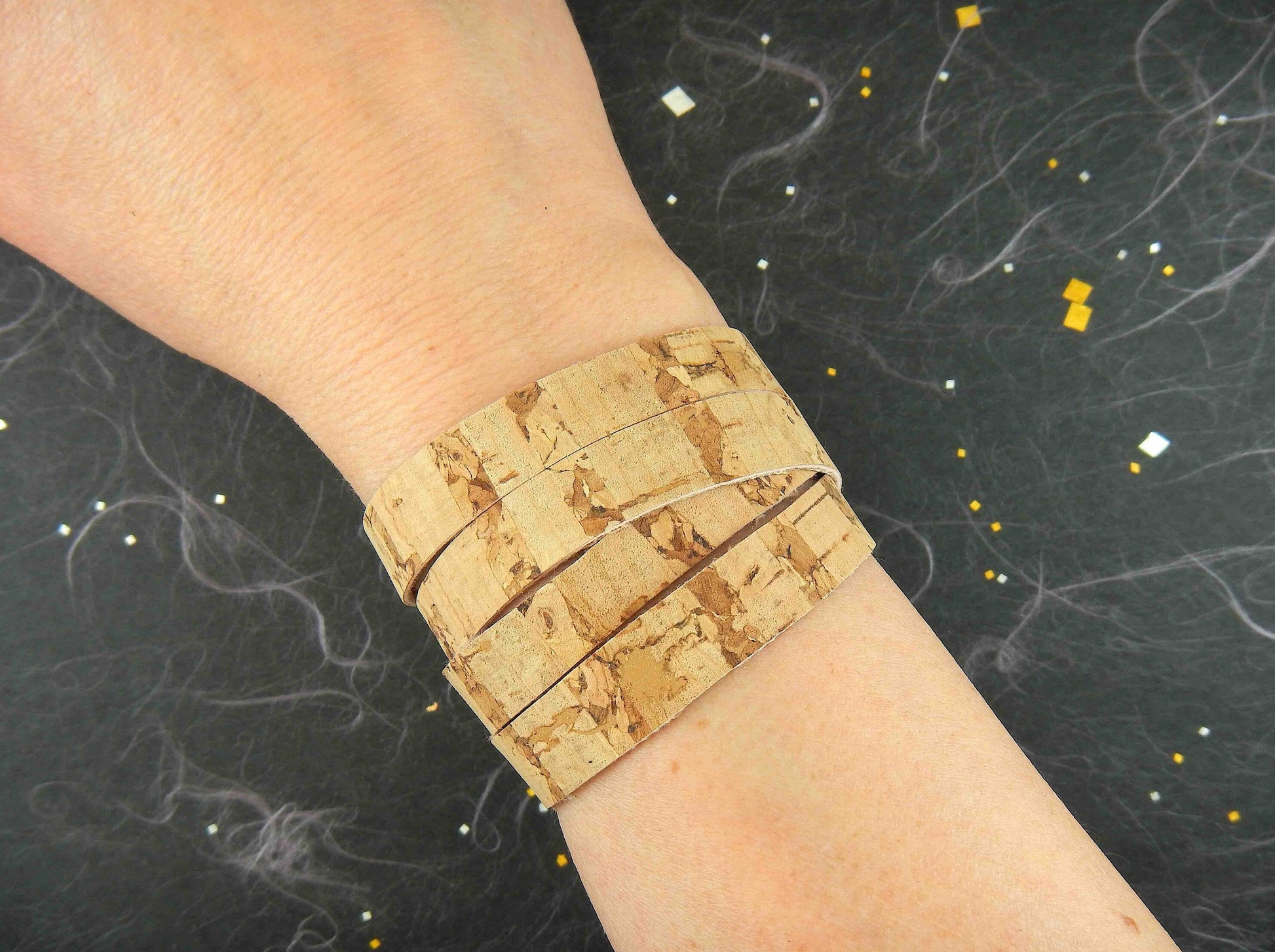 20mm wrap bracelet made of cork in 6 colours (brown tiling, brown zebra, natural, sky blue, emerald green, red and gold speckles), magnetic stainless steel clasp