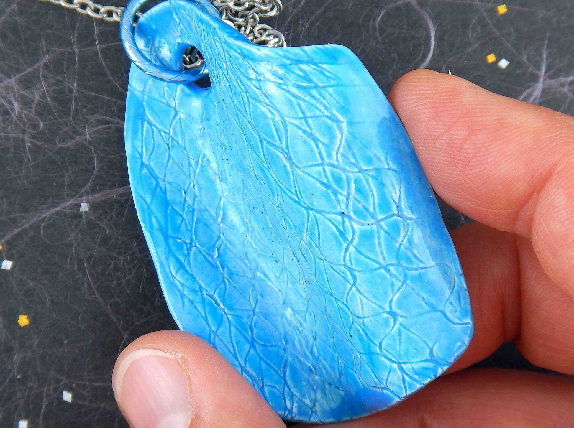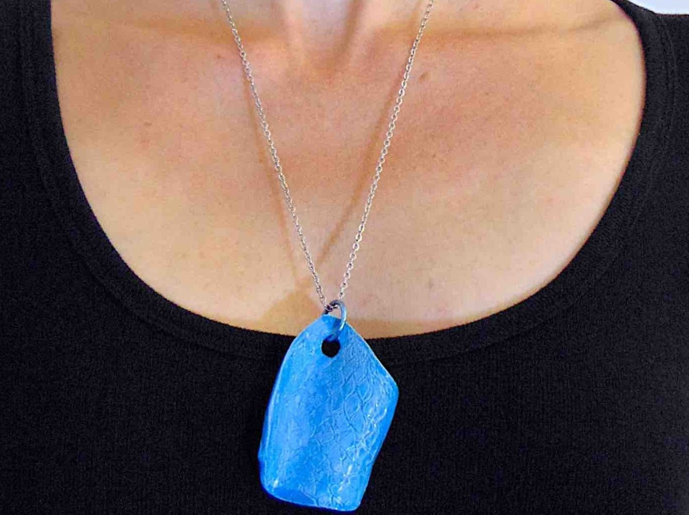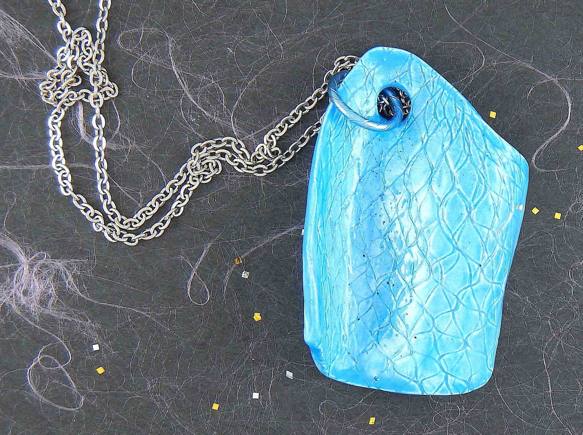 22-inch necklace with large textured bright turquoise wave ceramic pendant handmade in Montreal, stainless steel chain