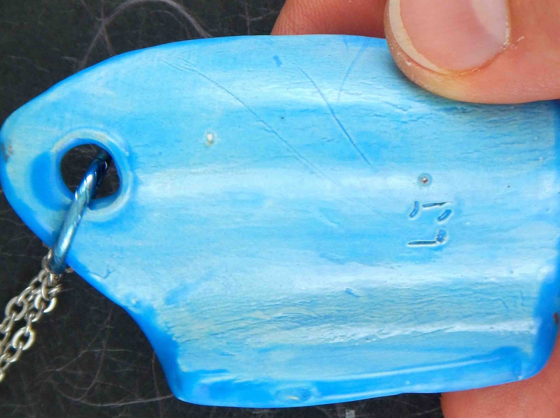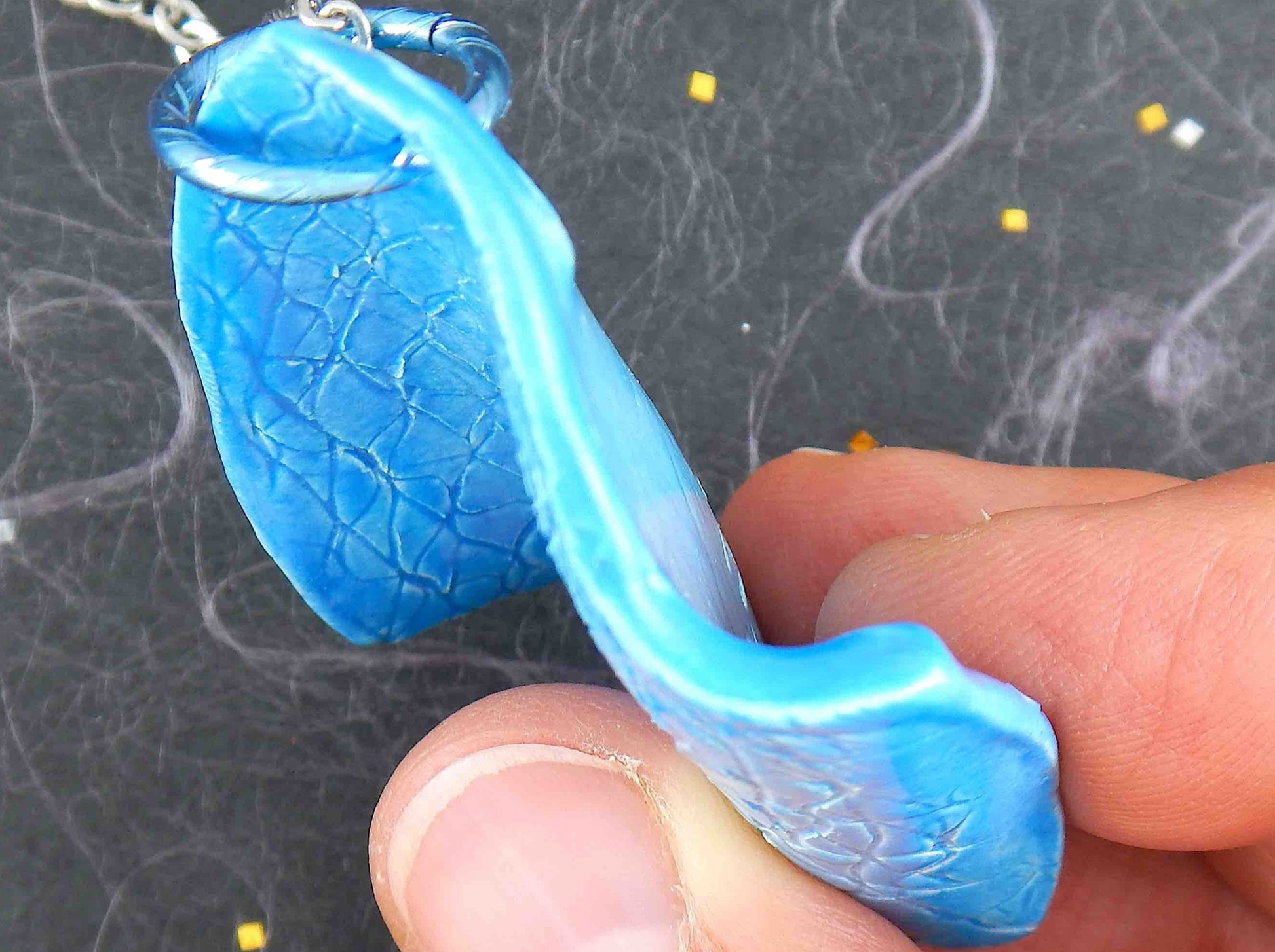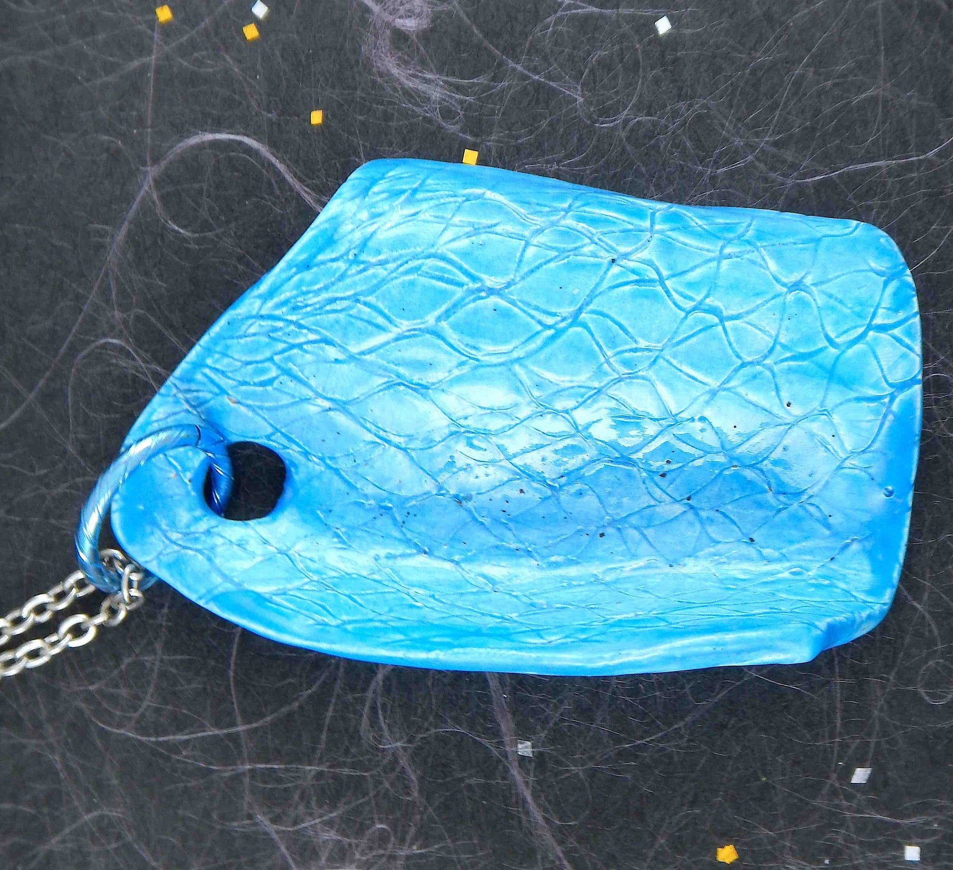 22-inch necklace with large textured bright turquoise wave ceramic pendant handmade in Montreal, stainless steel chain