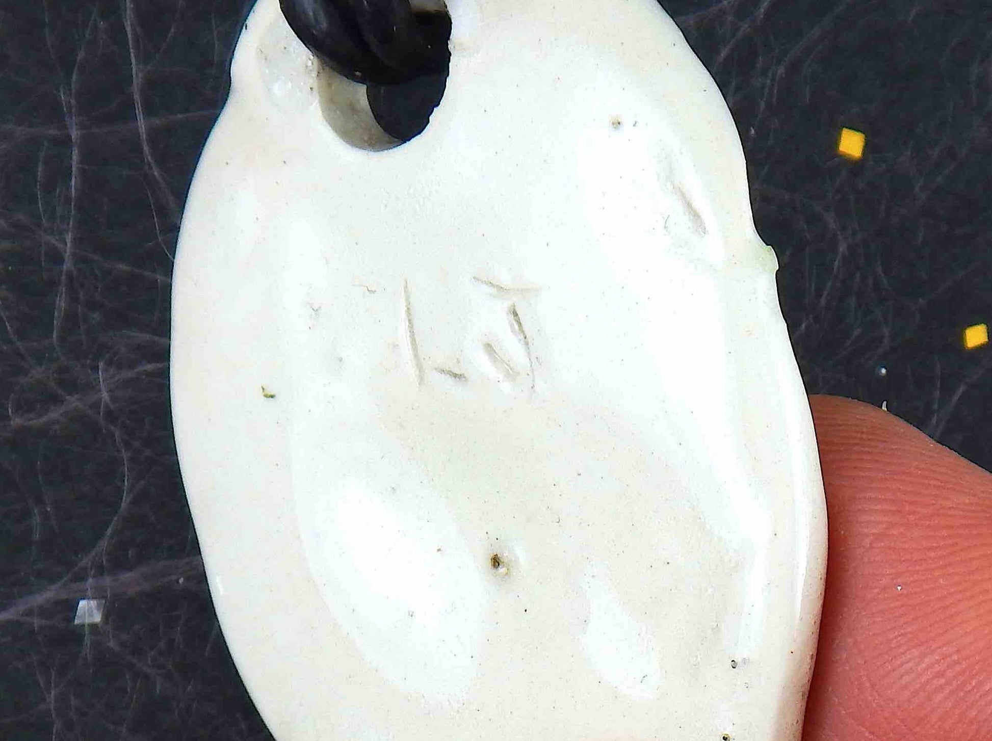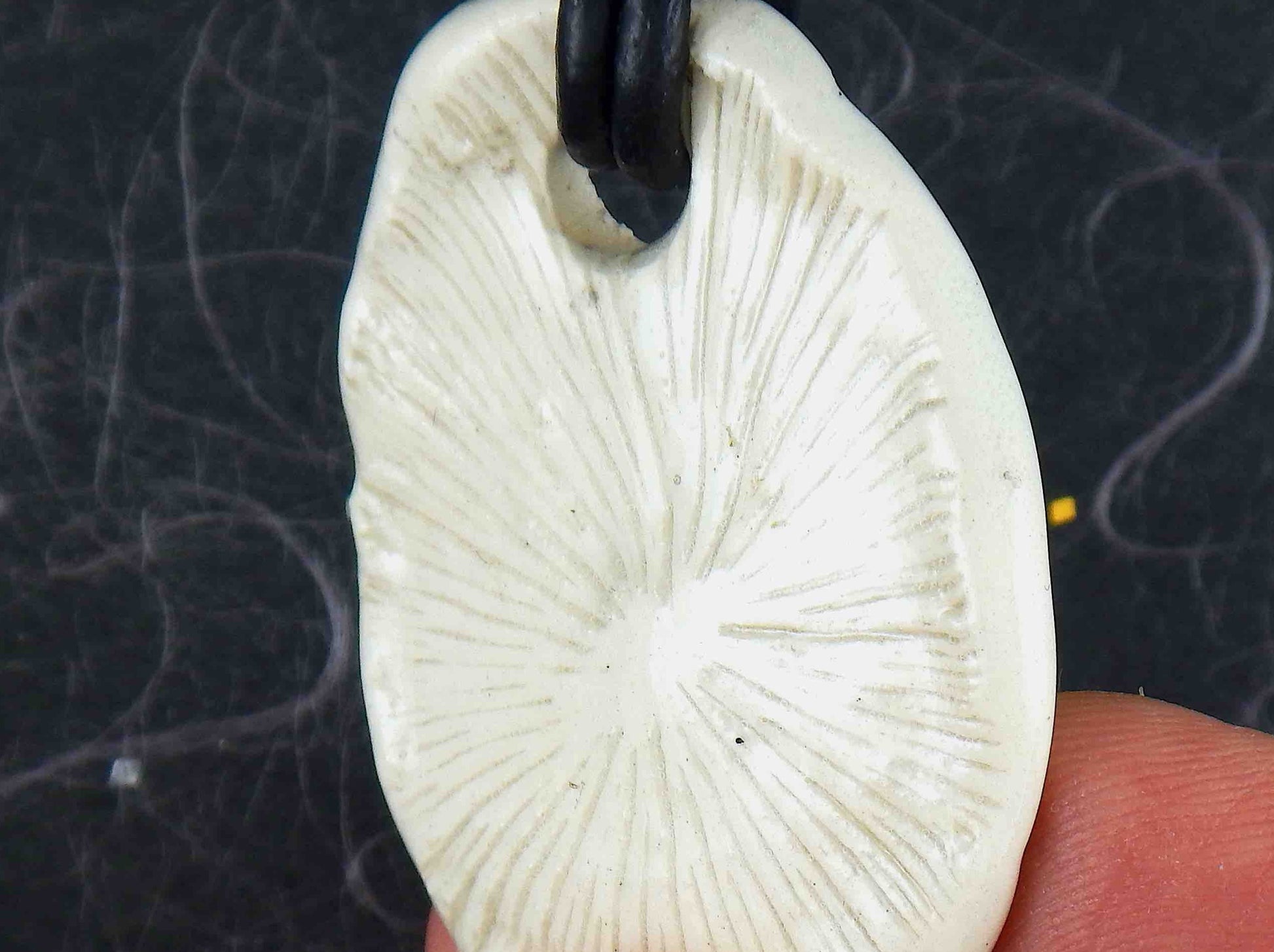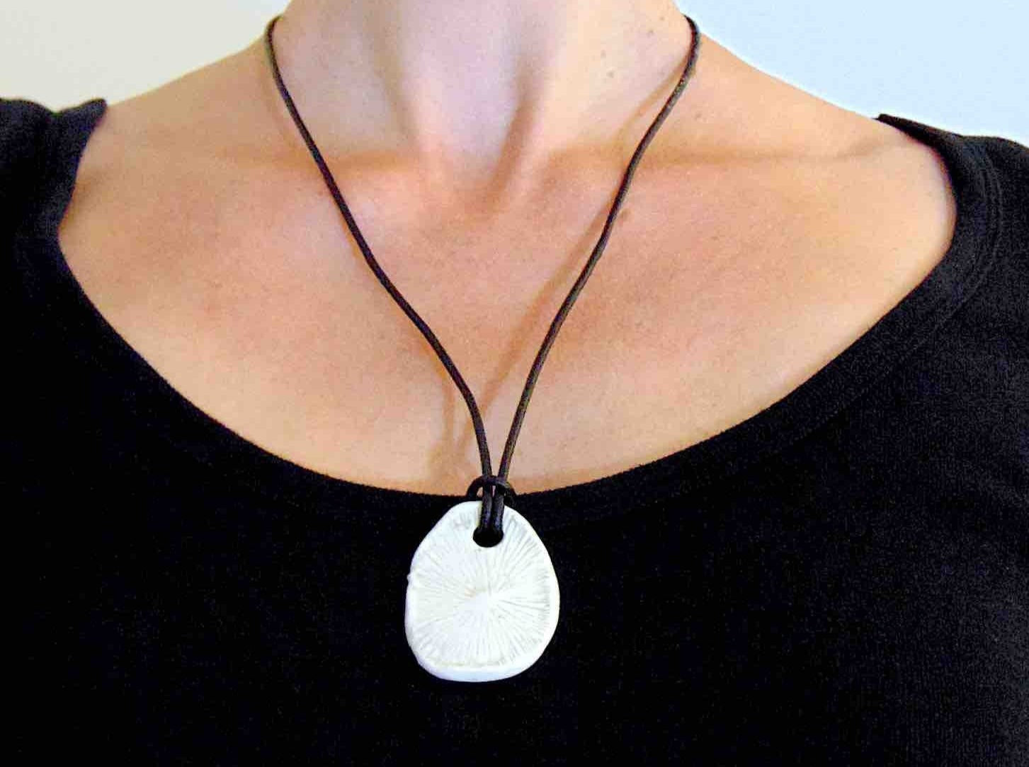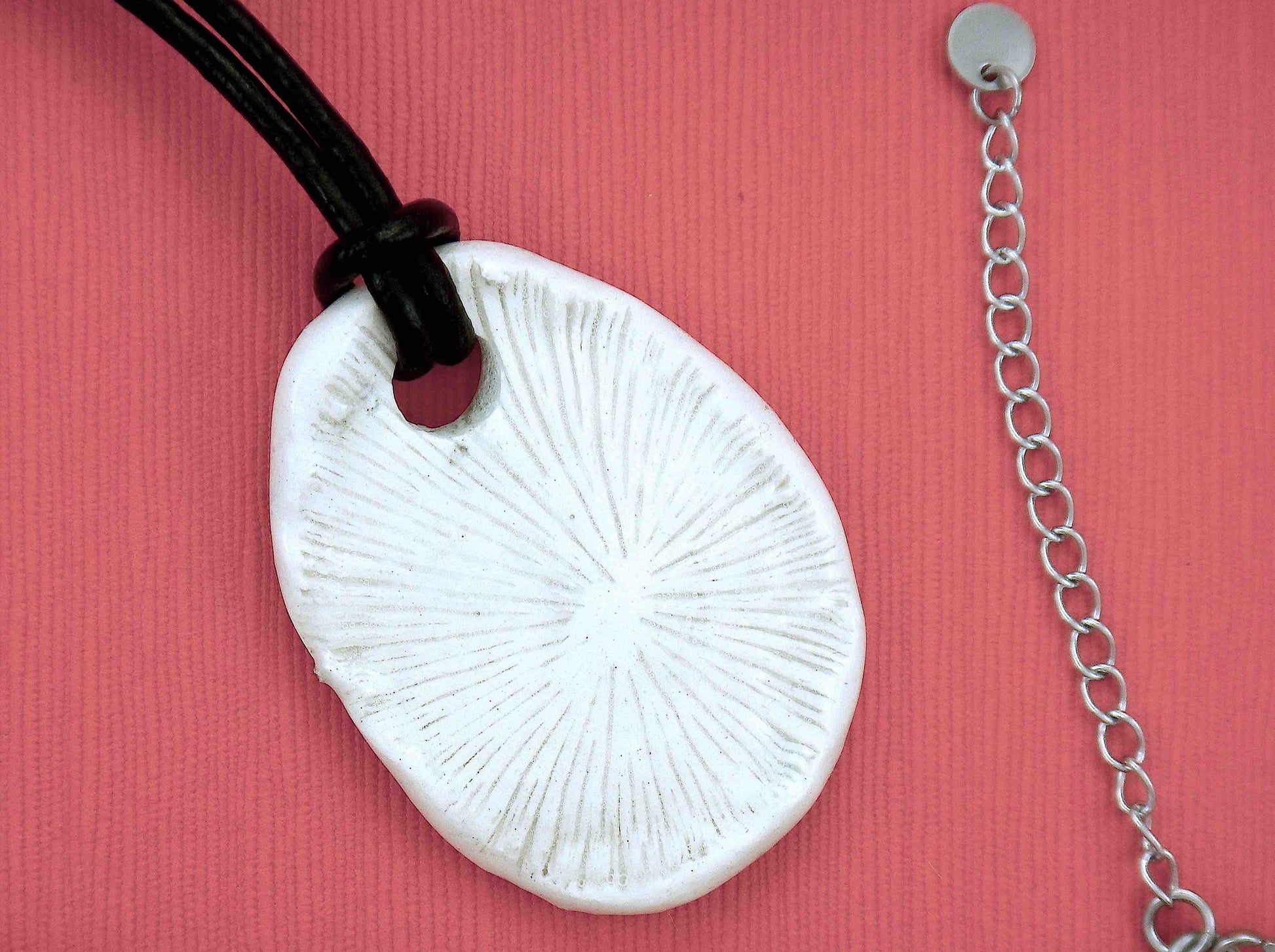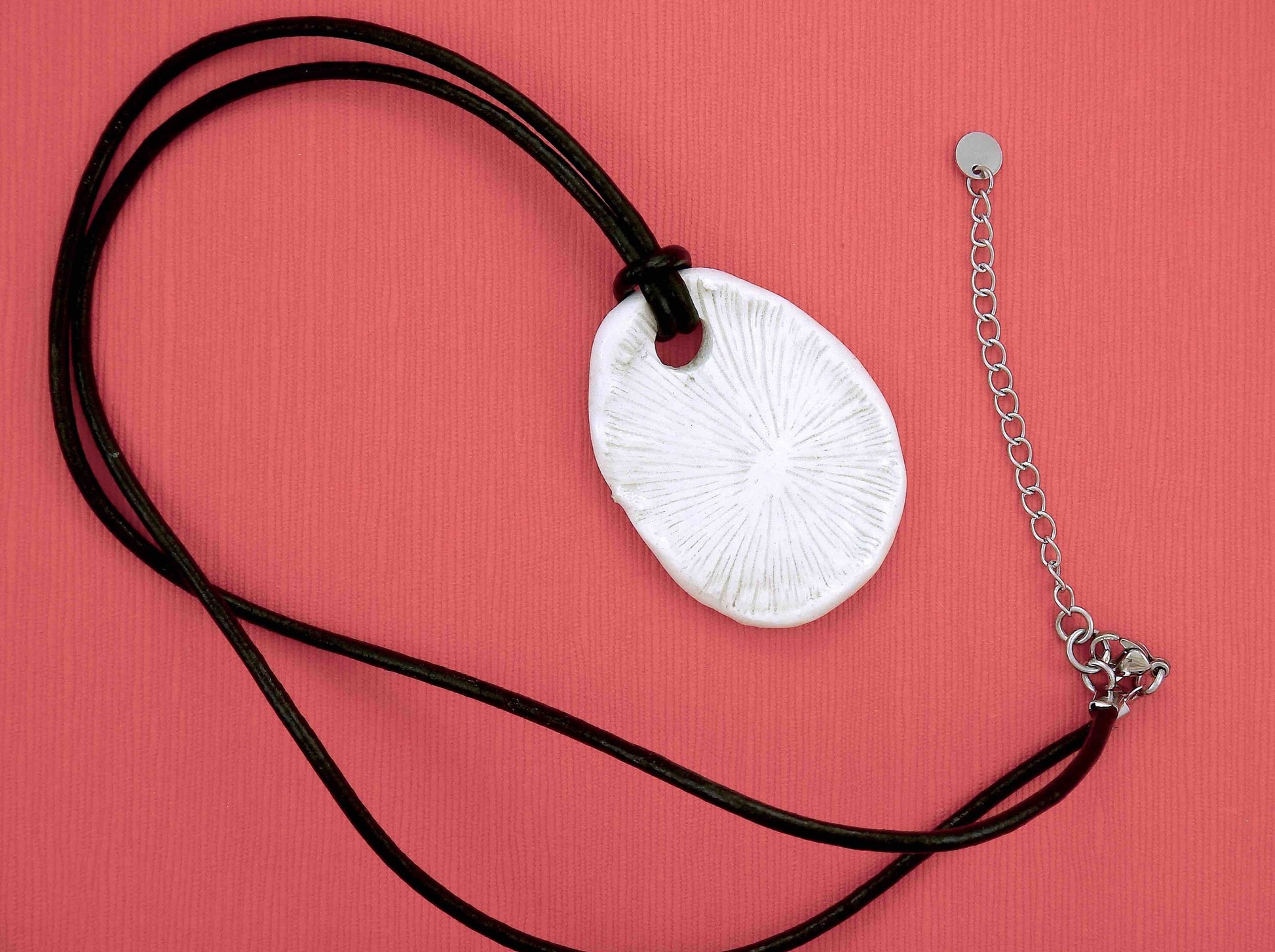 22-inch necklace with off-white ceramic coral pendant handmade in Montreal, black leather cord, stainless steel clasp