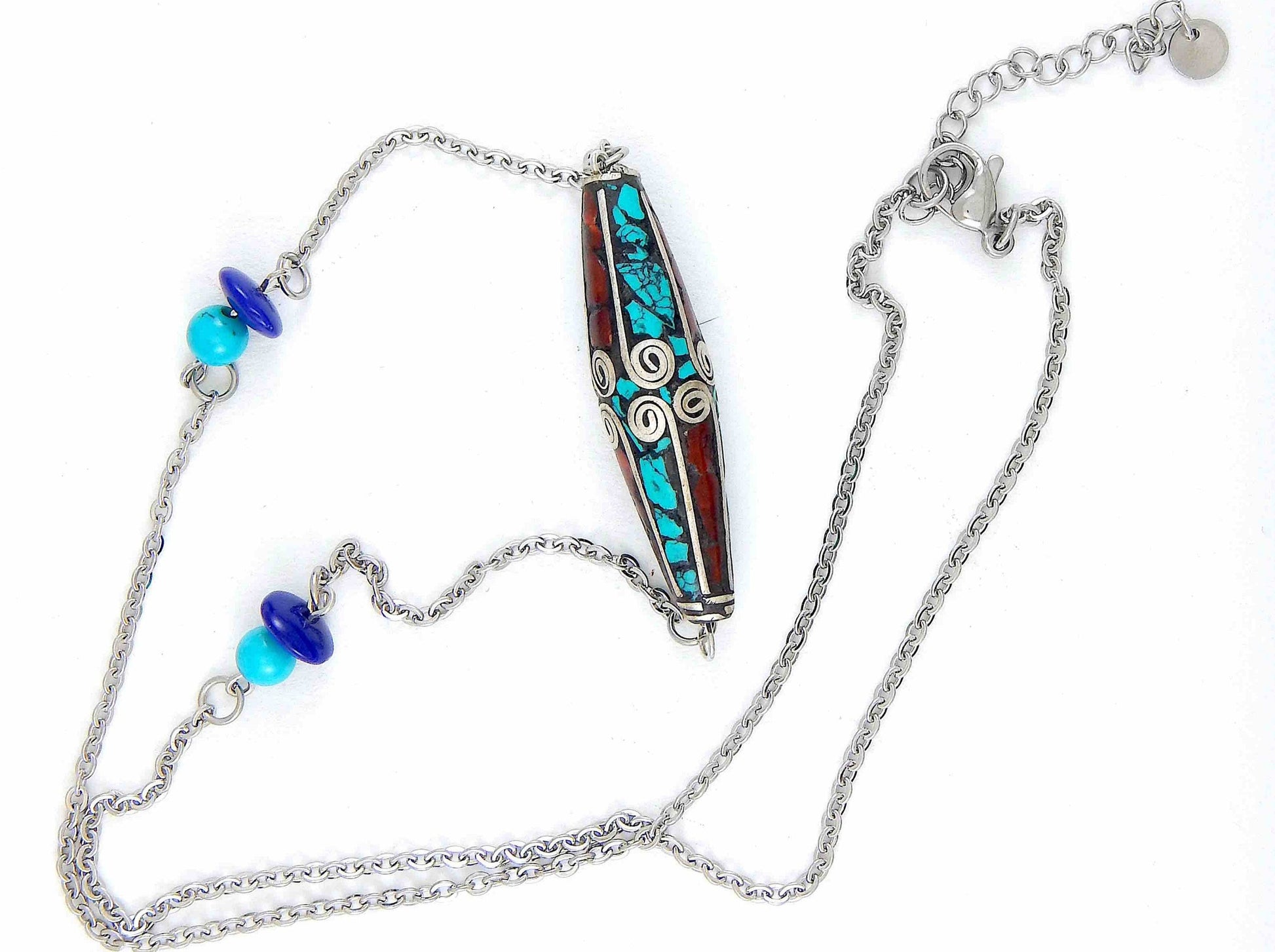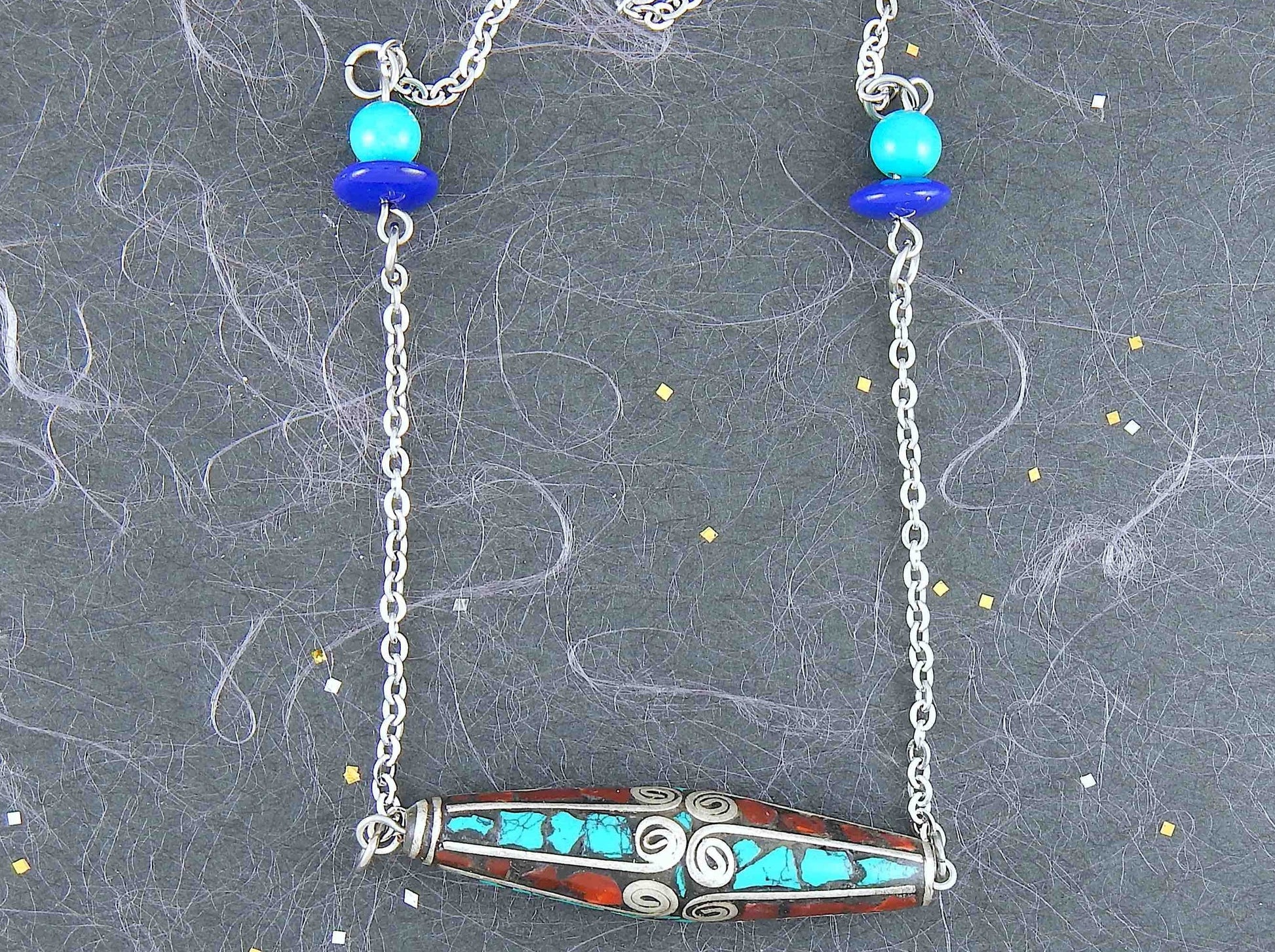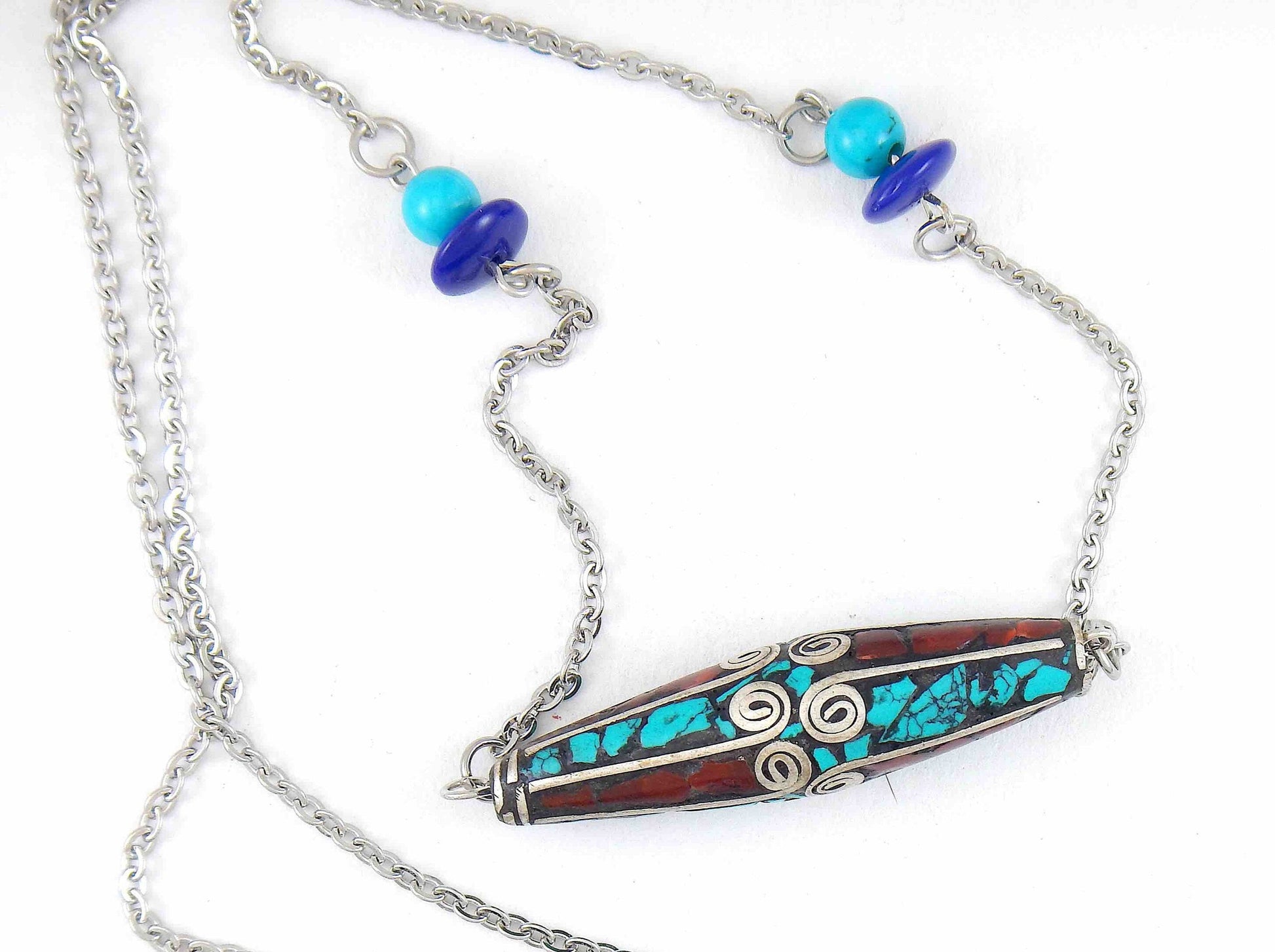 24-inch necklace with Tibetan cylinder bead, turquoise and coral inserts, matching glass beads, stainless steel chain