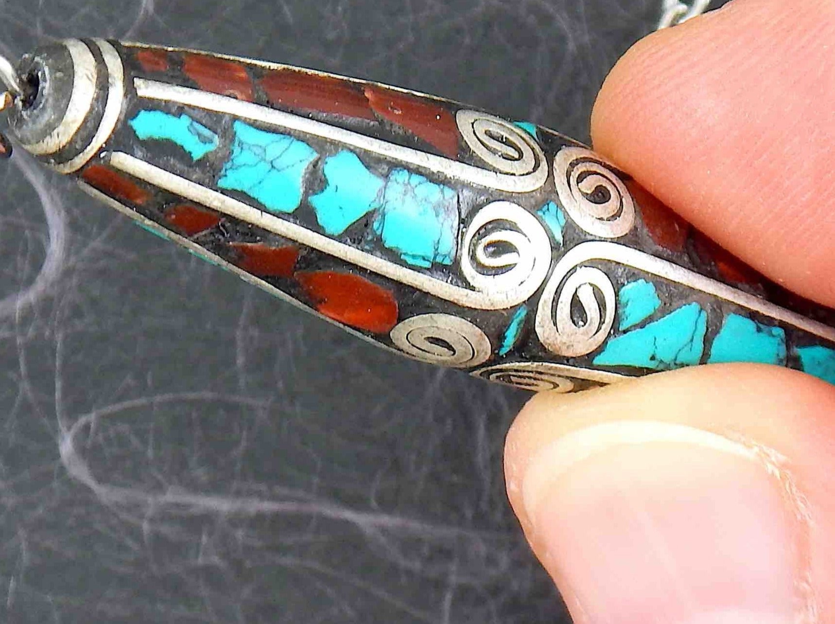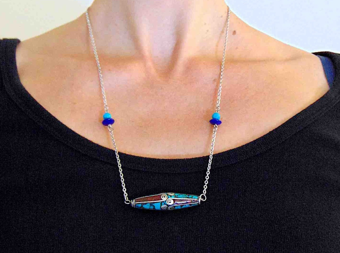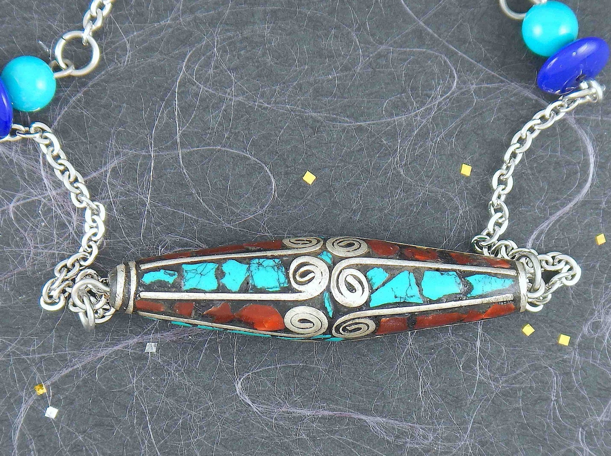 24-inch necklace with Tibetan cylinder bead, turquoise and coral inserts, matching glass beads, stainless steel chain